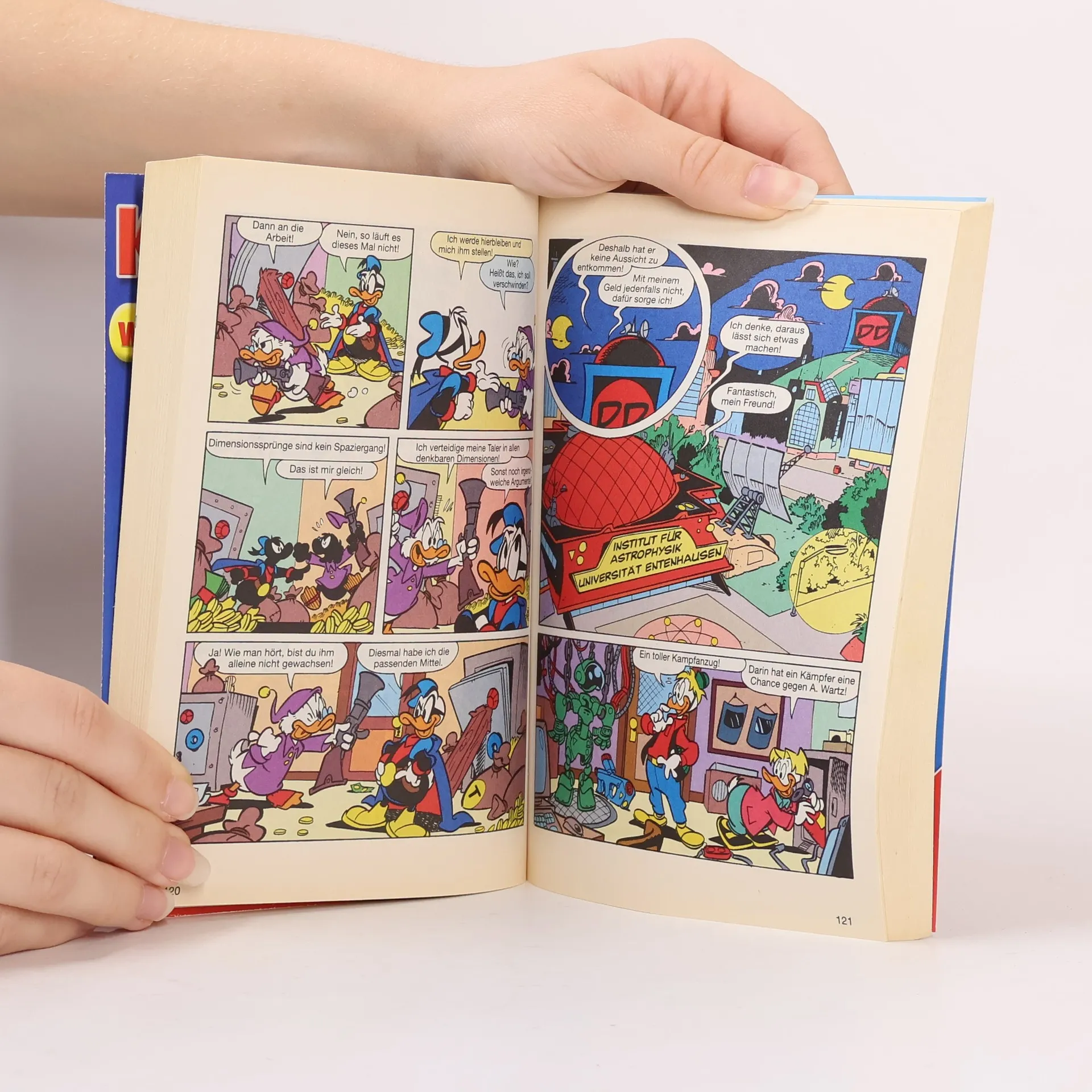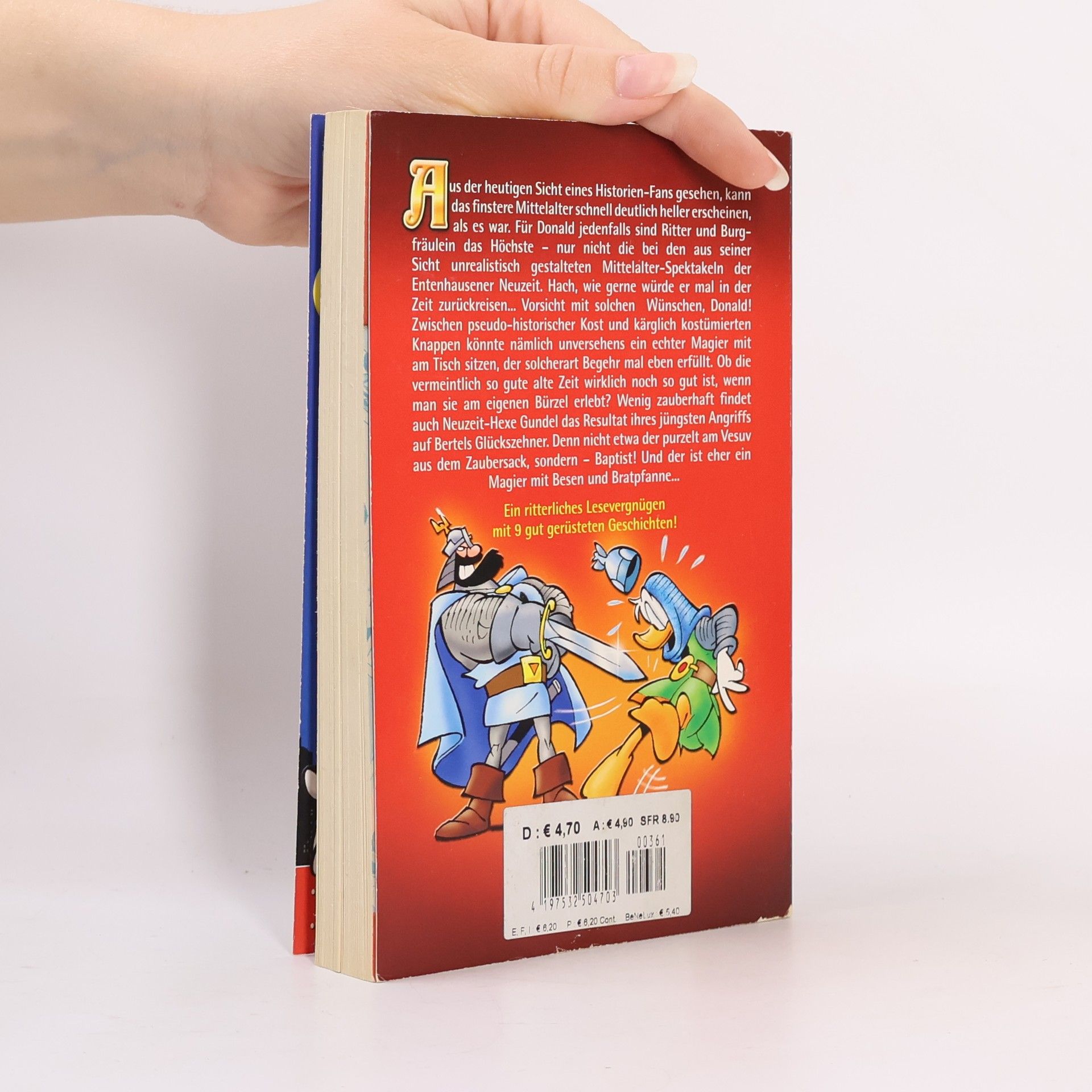 Aus der heutigen Sicht eines Folklore-Fans gesehen kann das finstere Mittelalter schnell deutlich heller erscheinen, als es war. Für Donald jedenfalls sind Ritter und Burgfräulein das Höchste – nur nicht die bei den aus seiner Sicht unrealistisch gestalteten Mittelalter-Spektakeln der Entenhausener Neuzeit. Hach, wie gerne würde er mal in der Zeit zurückreisen... Vorsicht mit solchen Wünschen, Donald! Zwischen pseudo-historischer Kost und kärglich kostümierten Knappen könnte nämlich unversehens ein echter Magus mit am Tisch sitzen, der solcherart Begehr mal eben erfüllt. Ob die vermeintlich so gute alte Zeit wirklich noch so gut ist, wenn man sie am eigenen Bürzel erlebt? Wenig zauberhaft findet auch Neuzeit-Hexe Gundel das Resultat ihres jüngsten Angriffs auf Bertels Glückszehner. Denn nicht etwa der purzelt am Vesuv aus dem Zaubersack, sondern – Baptist! Und der ist eher ein Magier mit Besen und Bratpfanne... An einen ganz anderen Ort verschlägt es Phantomias, denn Schwarzes Grauen hat Entenhausen gepackt. Allerdings mit sehr handfesten finanziellen Interessen: Gebäude gefüllt mit Wertsachen verschwinden im dunklen Nichts und tauchen nach Minuten wieder auf - ohne die wertvollen Inhalte. Ein Fall für Phantomias, ganz klar. Aber wie kämpft man am besten gegen schwarze Löcher? Um Entenhausen vor dem sicheren Bankrott zu retten muss unser Held diesmal sehr tief in seine Trickkiste greifen!