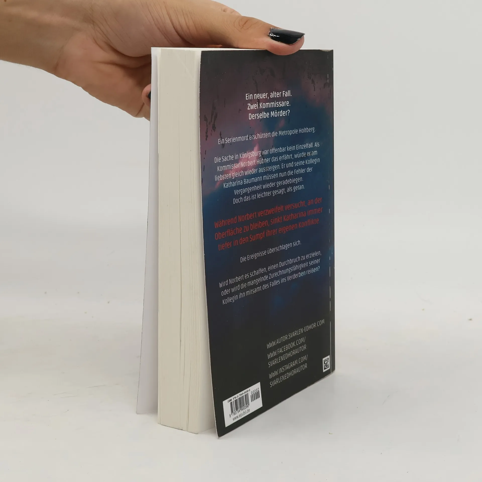 Ausgabe für den Buchhandel: Covergestaltung = matt, Format = 12 x 19 cmEin neuer, alter Fall. Zwei Kommissare. Derselbe Mörder?Ein Serienmord erschüttert die Metropole Holtberg.Die Sache in Königsburg war offenbar kein Einzelfall. Als Kommissar Norbert Hübner das erfährt, würde er am liebsten gleich wieder aussteigen. Er und seine Kollegin Katharina Baumann müssen nun die Fehler der Vergangenheit wieder geradebiegen.Doch das ist leichter gesagt, als getan.Während Norbert verzweifelt versucht, an der Oberfläche zu bleiben, sinkt Katharina immer tiefer in den Sumpf ihrer eigenen Konflikte.Die Ereignisse überschlagen sich.Wird Norbert es schaffen, einen Durchbruch zu erzielen, oder wird die mangelnde Zurechnungsfähigkeit seiner Kollegin ihn mitsamt des Falles ins Verderben reißen?