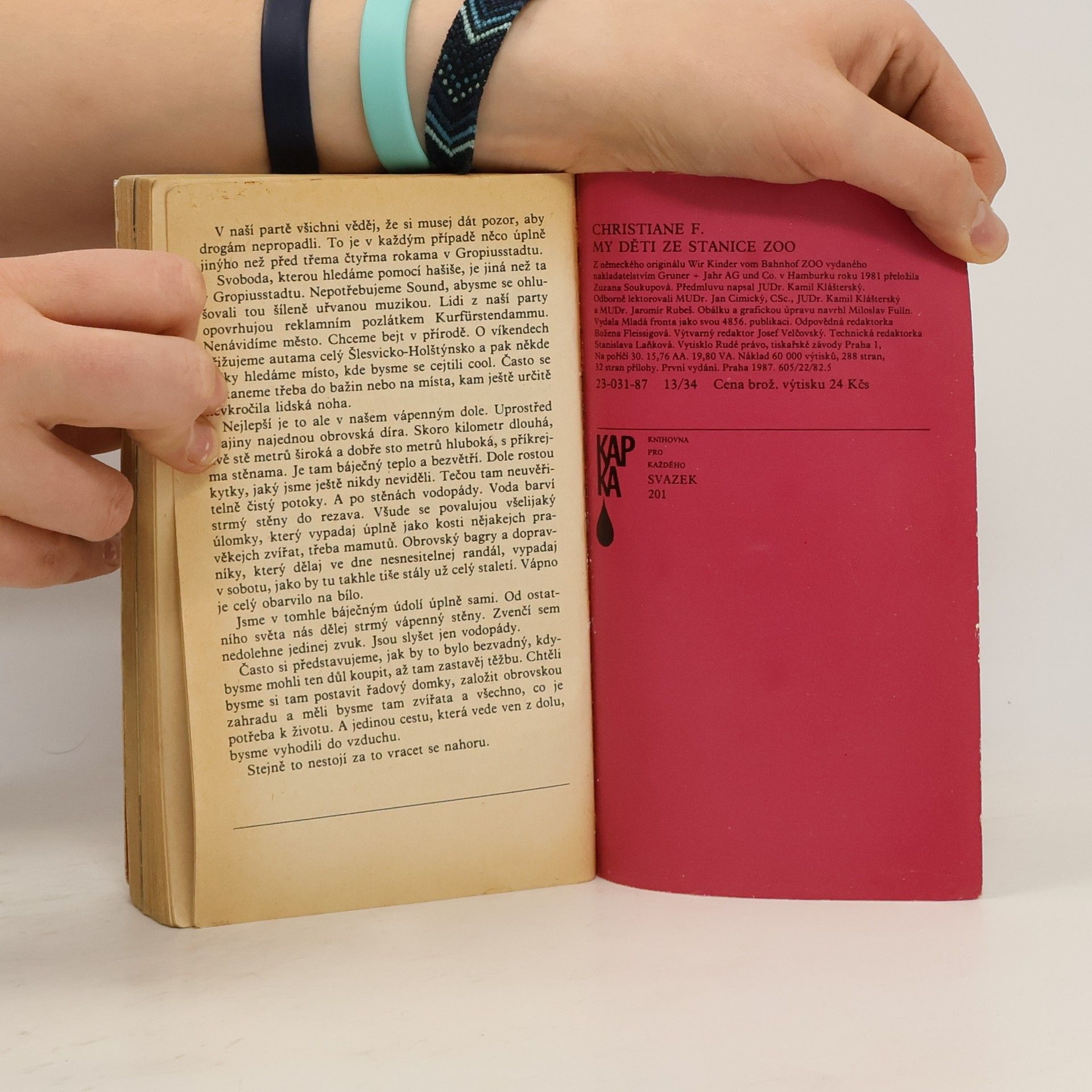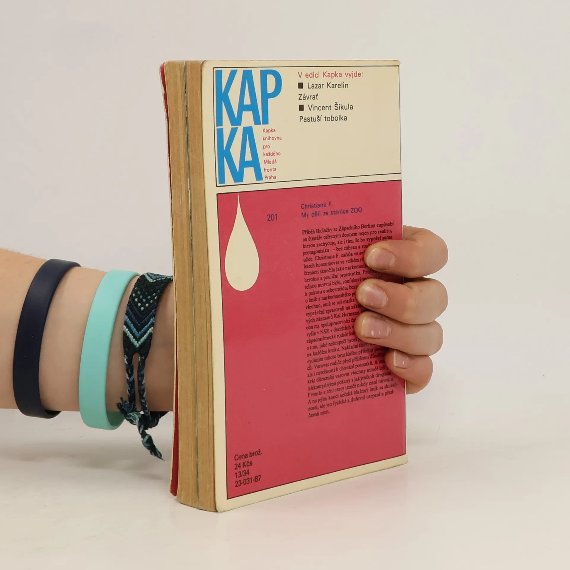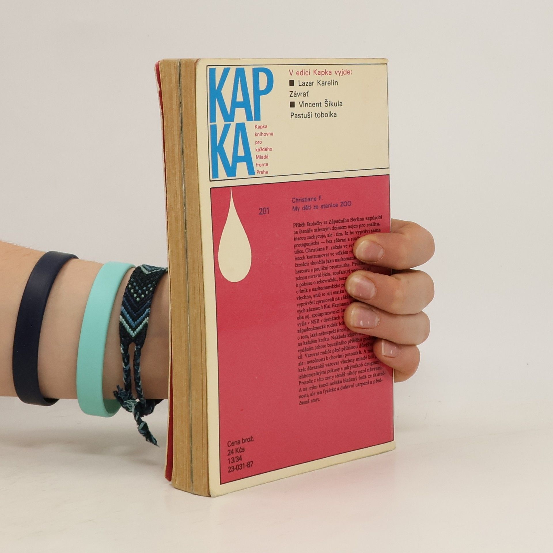 Mladistvá západoberlínská narkomanka ich-formou popisuje svůj příchod jako 6leté na berlínské sídliště Gropiusstadt s minimem možností zábavy pro děti. Neutěšené rodinné poměry vedoucí k rozvodu rodičů ji přivádí k hašišové partě v „Domě středu“. Následně postupně propadává světem drog až k těžké závislosti na heroinu a všemu, co s ní souvisí: těžké zhoršování zdravotního stavu, snaha opatřit si peníze na dávku (žebrání, krádeže, prostituce) a občasné zoufalé a neúspěšné pokusy zbavit se závislosti. Později se dívka závislosti na heroinu zbaví, ale pořád zůstává závislá na hašiši. Kniha obsahuje vlepenou 32 stránkovou fotografickou přílohu. Předmluvu napsal JUDr. Kamil Klášterský. Odborně lektorovali MUDr. Jan Cimický, CSc., JUDr. Kamil Klášterský a MUDr. Jaromír Rubeš. První vydání.
