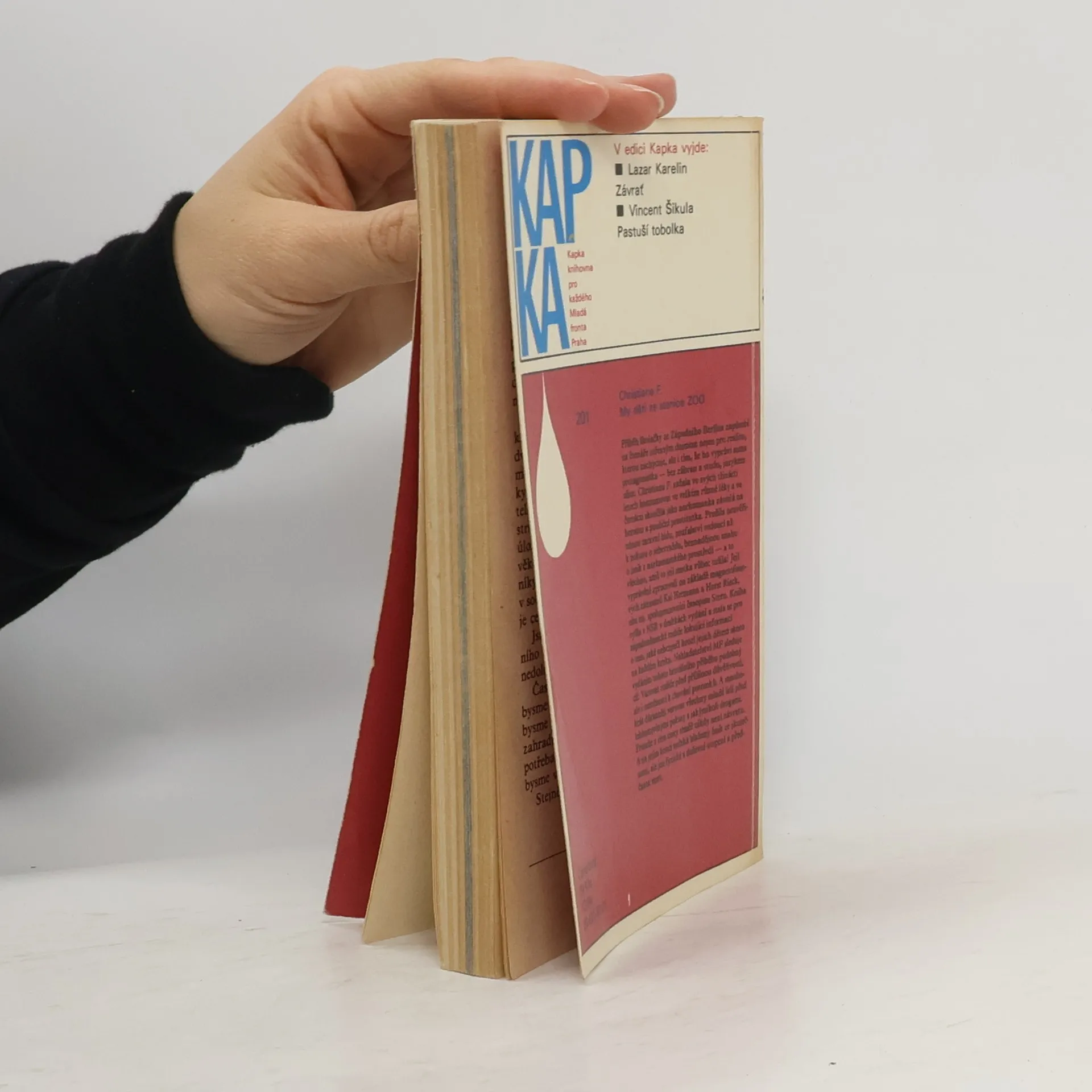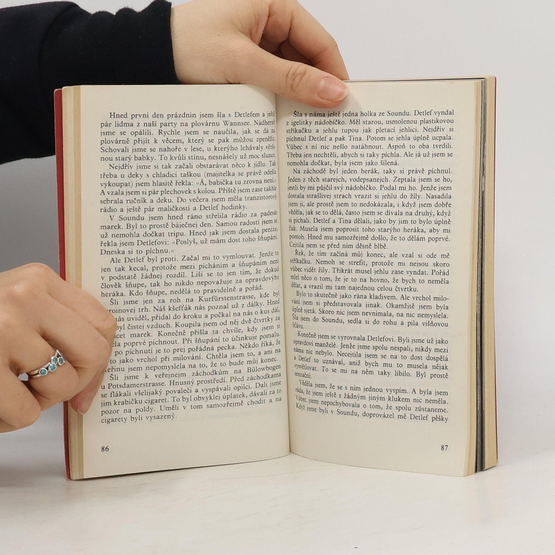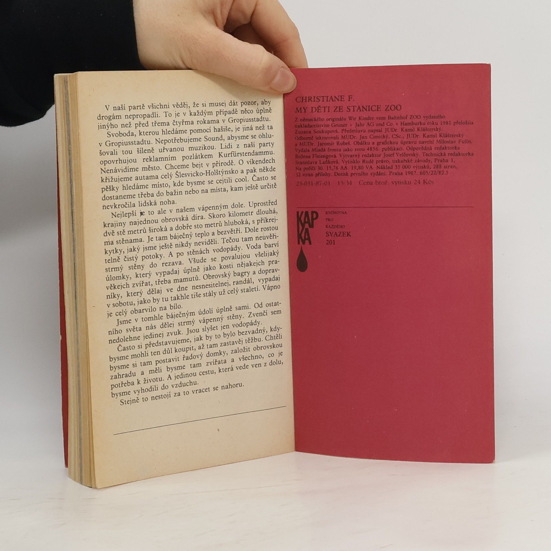 Mladistvá západoberlínská narkomanka ich-formou popisuje svůj příchod jako 6leté na berlínské sídliště Gropiusstadt s minimem možností zábavy pro děti. Neutěšené rodinné poměry vedoucí k rozvodu rodičů ji přivádí k hašišové partě v „Domě středu“. Následně postupně propadává světem drog až k těžké závislosti na heroinu a všemu, co s ní souvisí: těžké zhoršování zdravotního stavu, snaha opatřit si peníze na dávku (žebrání, krádeže, prostituce) a občasné zoufalé a neúspěšné pokusy zbavit se závislosti. Později se dívka závislosti na heroinu zbaví, ale pořád zůstává závislá na hašiši. Kniha obsahuje vlepenou 32 stránkovou fotografickou přílohu. Předmluvu napsal JUDr. Kamil Klášterský. Odborně lektorovali MUDr. Jan Cimický, CSc., JUDr. Kamil Klášterský a MUDr. Jaromír Rubeš. První vydání.