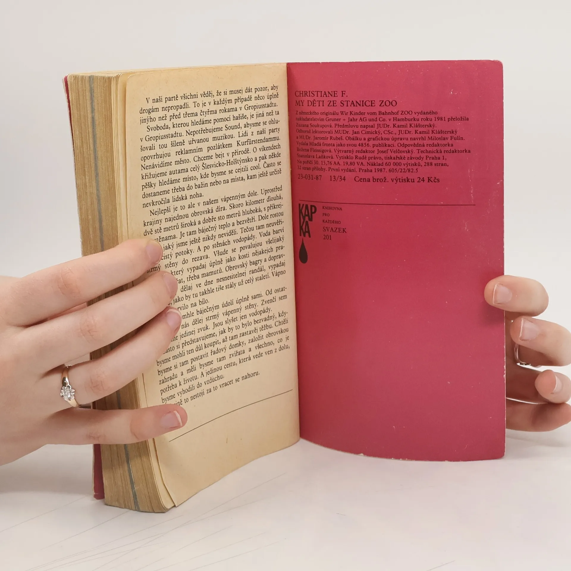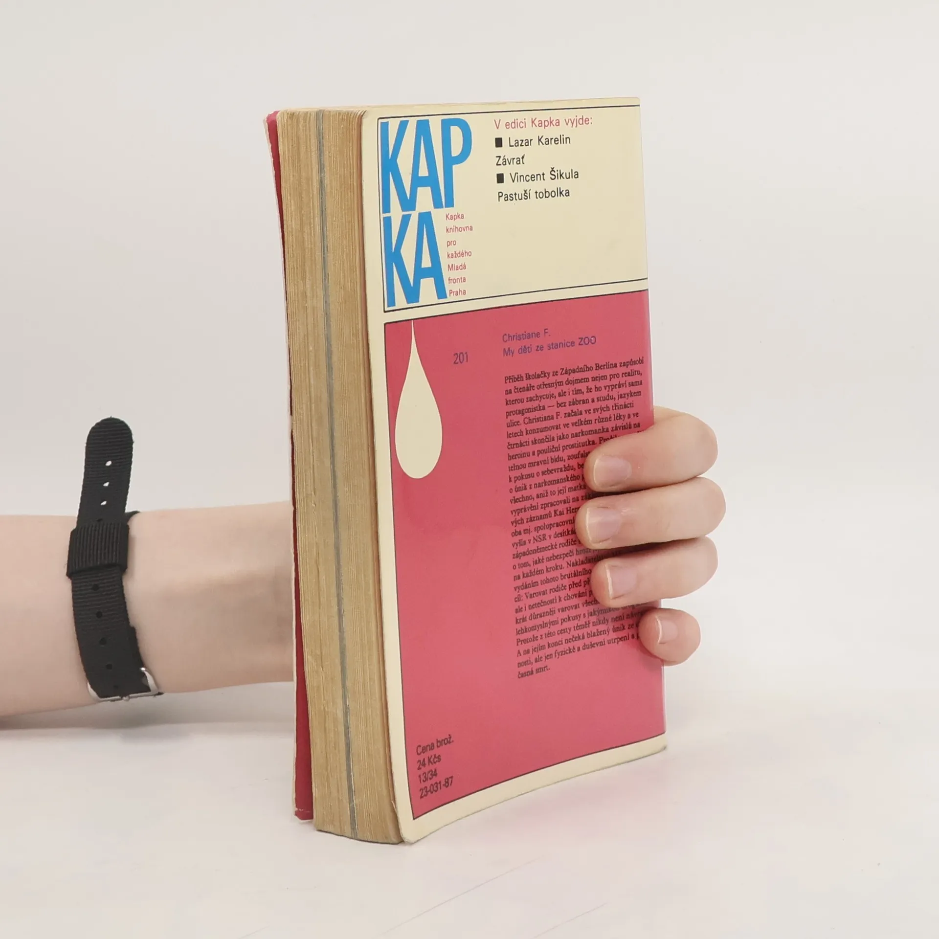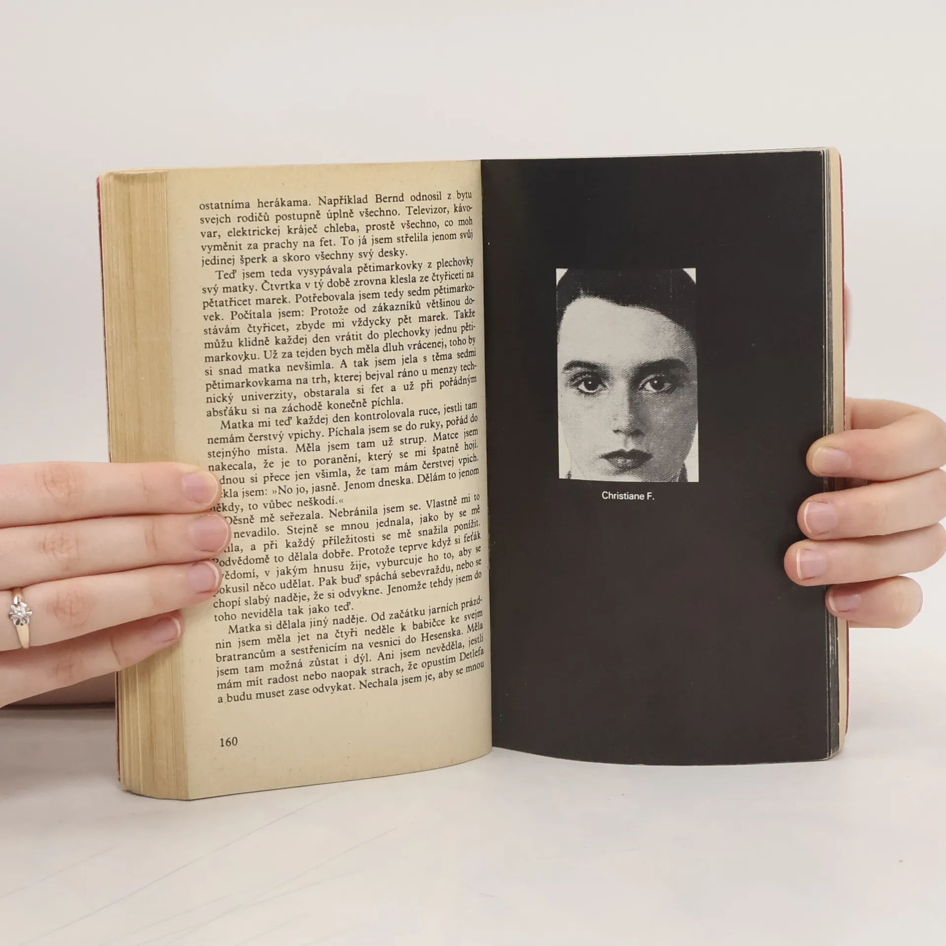 Mladistvá západoberlínská narkomanka ich-formou popisuje svůj příchod jako 6leté na berlínské sídliště Gropiusstadt s minimem možností zábavy pro děti. Neutěšené rodinné poměry vedoucí k rozvodu rodičů ji přivádí k hašišové partě v „Domě středu“. Následně postupně propadává světem drog až k těžké závislosti na heroinu a všemu, co s ní souvisí: těžké zhoršování zdravotního stavu, snaha opatřit si peníze na dávku (žebrání, krádeže, prostituce) a občasné zoufalé a neúspěšné pokusy zbavit se závislosti. Později se dívka závislosti na heroinu zbaví, ale pořád zůstává závislá na hašiši. Kniha obsahuje vlepenou 32 stránkovou fotografickou přílohu. Předmluvu napsal JUDr. Kamil Klášterský. Odborně lektorovali MUDr. Jan Cimický, CSc., JUDr. Kamil Klášterský a MUDr. Jaromír Rubeš. První vydání.