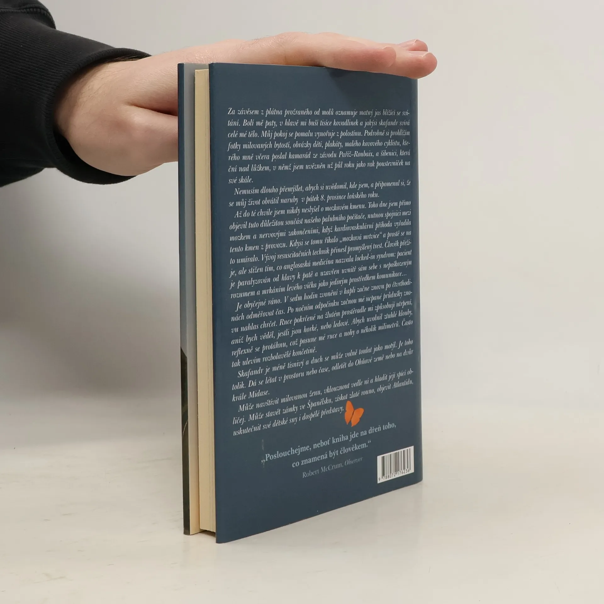 Jean-Dominique Bauby byl dynamický a úspěšný čtyřicetiletý muž, který měl krásnou manželku, ještě hezčí milenku, dvě malé děti a prestižní zaměstnání jako šéfredaktor magazínu Elle. Jednoho dne nevstal z místa řidiče svého luxusního kabrioletu a nevrátil se zpátky do svého života. Vlivem mozkové příhody kompletně ochrnul a oněměl, postihl ho tzv. syndrom uzamčení. Jediné, co spojovalo jeho nezasaženou mysl s okolním světem, bylo levé oko. Díky terapeutce a rafinovanému systému dorozumívání, který pro něj vytvořila, Jean-Dominique doslova „namrkal“ svou knihu, neobyčejně silné a dojemné poselství o triumfu lidské duše nad smrtelným tělem.