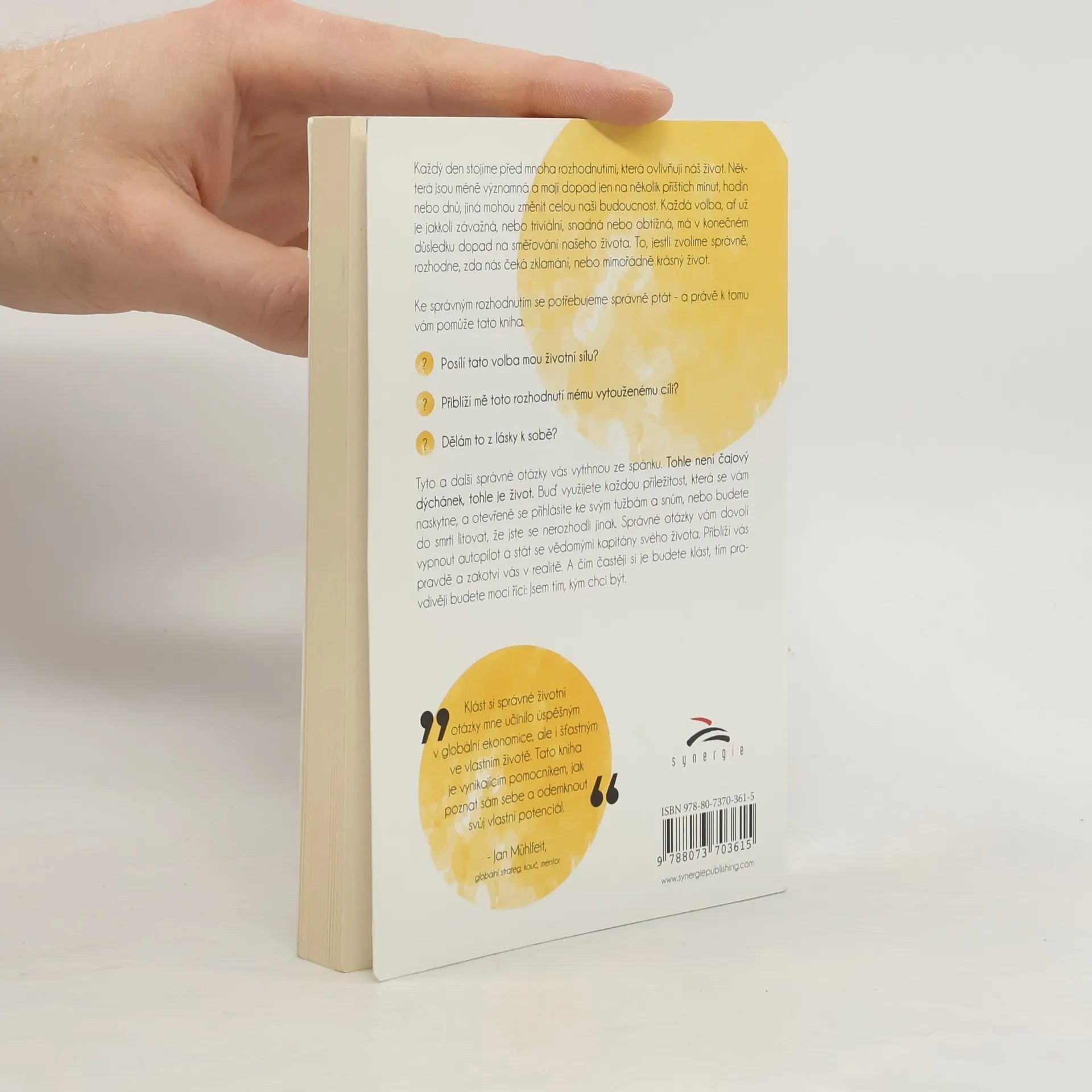 Každý den stojíme před mnoha rozhodnutími, která ovlivňují náš život. Některá jsou méně významná a mají dopad jen na několik příštích minut, hodin nebo dnů, jiná mohou změnit celou naši budoucnost. Každá volba, ať už je jakkoli závažná nebo triviální, snadná nebo obtížná, má v konečném důsledku dopad na směřování našeho života. To, jestli zvolíme správně rozhodne, zda nás čeká zklamání nebo mimořádně krásný život. Ke správným rozhodnutím se potřebujeme správně ptát - a právě k tomu vám pomůže tato kniha. Posílí tato volba mou životní sílu? Přiblíží mě toto rozhodnutí mému vytouženému cíli? Dělám to z lásky k sobě? Tyto a další správné otázky vás vytrhnou ze spánku. Tohle není čajový dýchánek, tohle je život. Buď využijete každou příležitost, která se vám naskytne, a otevřeně se přihlásíte ke svým tužbám a snům, nebo budete do smrti litovat, že jste se nerozhodli jinak. Správné otázky vám dovolí vypnout autopilota a stát se vědomými kapitány svého života. Přiblíží vás pravdě a zakotví vás v realitě. A čím častěji si je budete klást, tím pravdivěji budete moci říci: Jsem tím, kým chci být. Klást si správné životní otázky mne učinilo úspěšným v globální ekonomice, ale i šťastným ve vlastním životě. Tato kniha je vynikajícím pomocníkem jak poznat sám sebe a odemknout svůj vlastní potenciál. - Jan Mühlfeit, globální stratég, kouč, mentor