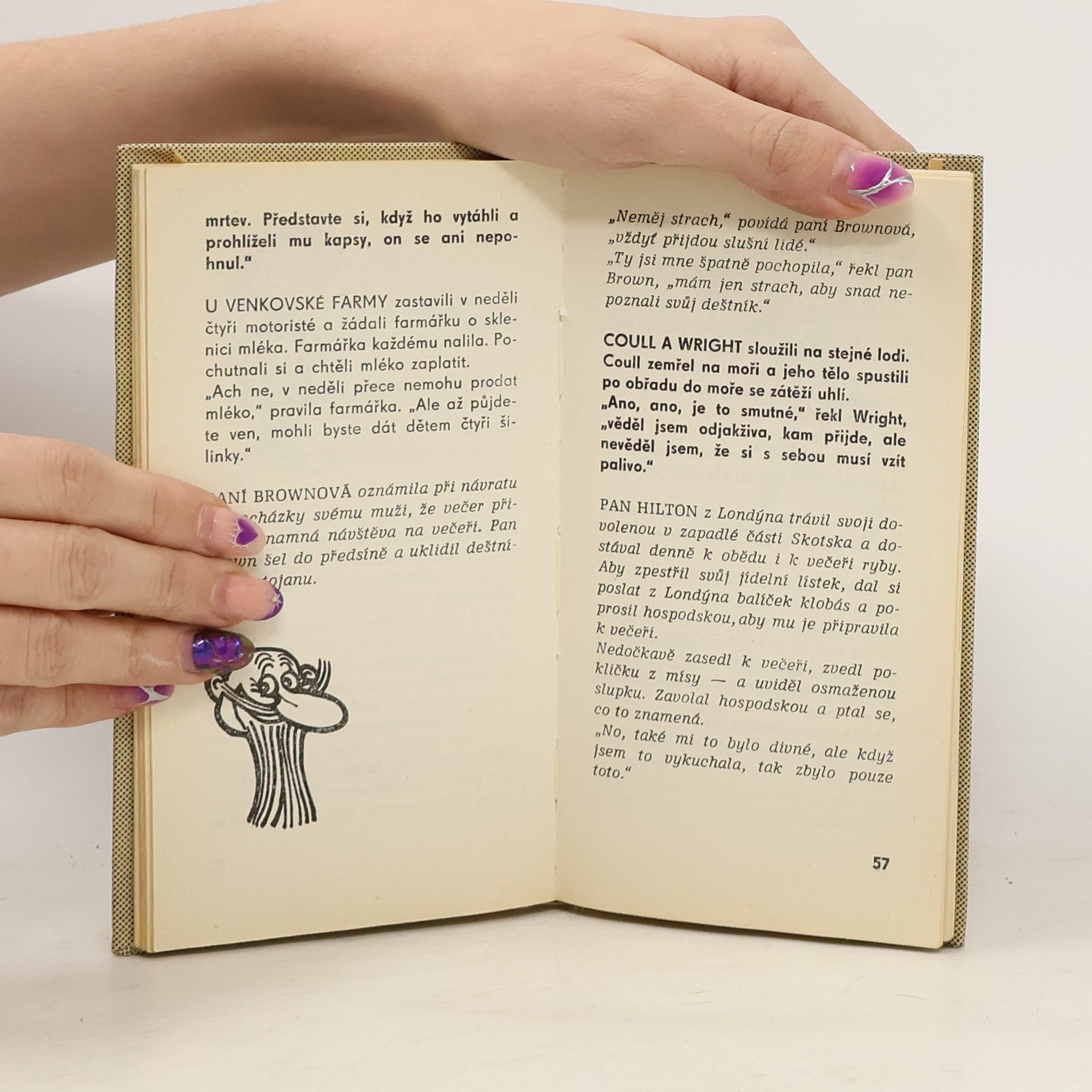 Sbírka anekdot o Skotech a všem skotském. Ilustrace Neprakta. "JE TO PRAVDA, že MacHardy při rybaření převrhl loďku a utonul?" "Ano, jeto smutná pravda. Je dočista mrtev. Představte si, když ho vytáhli a prohlíželi mu kapsy, on se ani nepohnul" "BYL JSTE někdy trestán?" "Bohužel. Platil jsem pokutu za koupání na zakázaném místě." "A od té doby?" "Od té doby jsem se nekoupal" DŮLEŽITÉ UPOZORNĚNÍ na závěr: V poslední době se rozmohly ve všech časopisech skotské anekdoty. Upozorňu- jeme, že nejlepší skotská je - whisky.