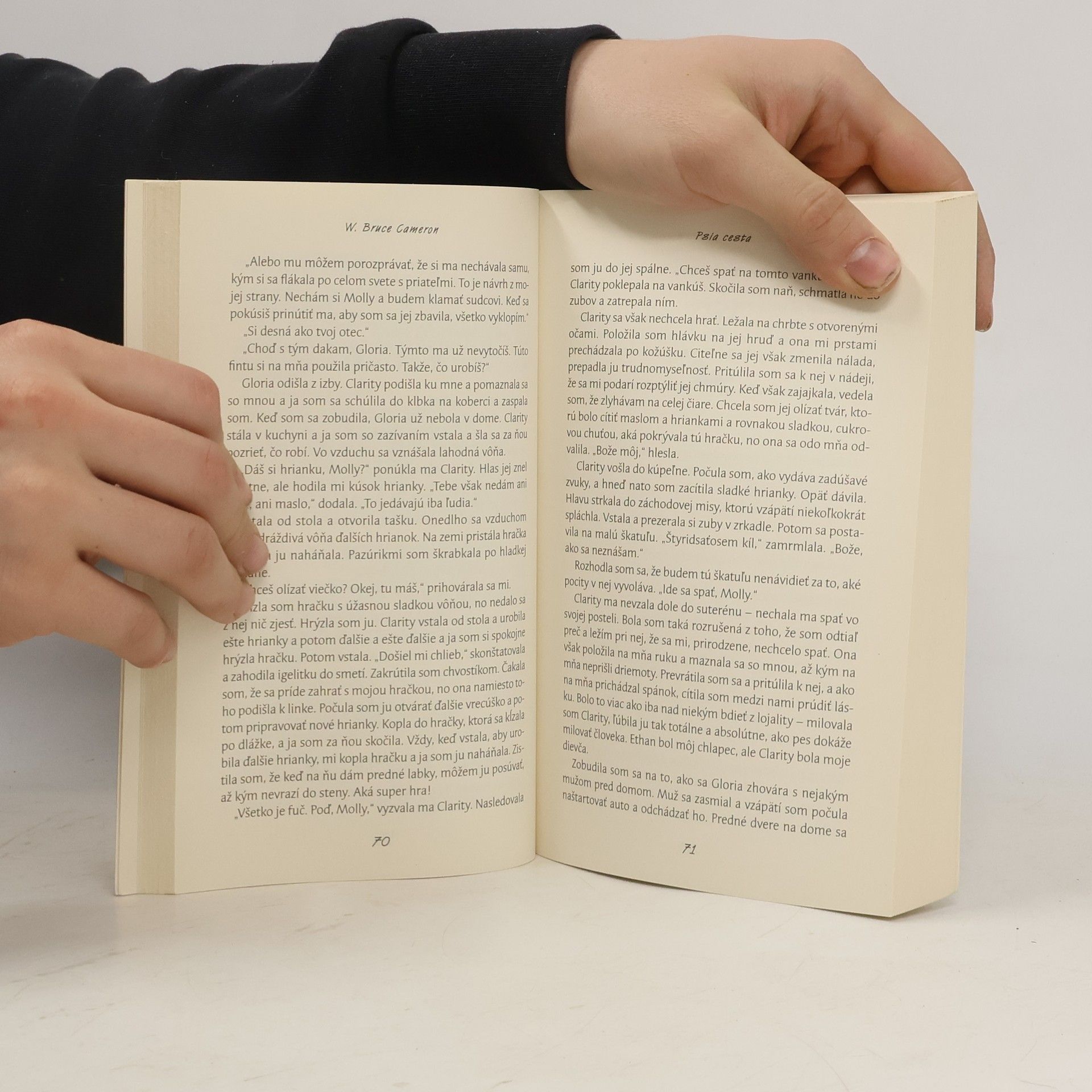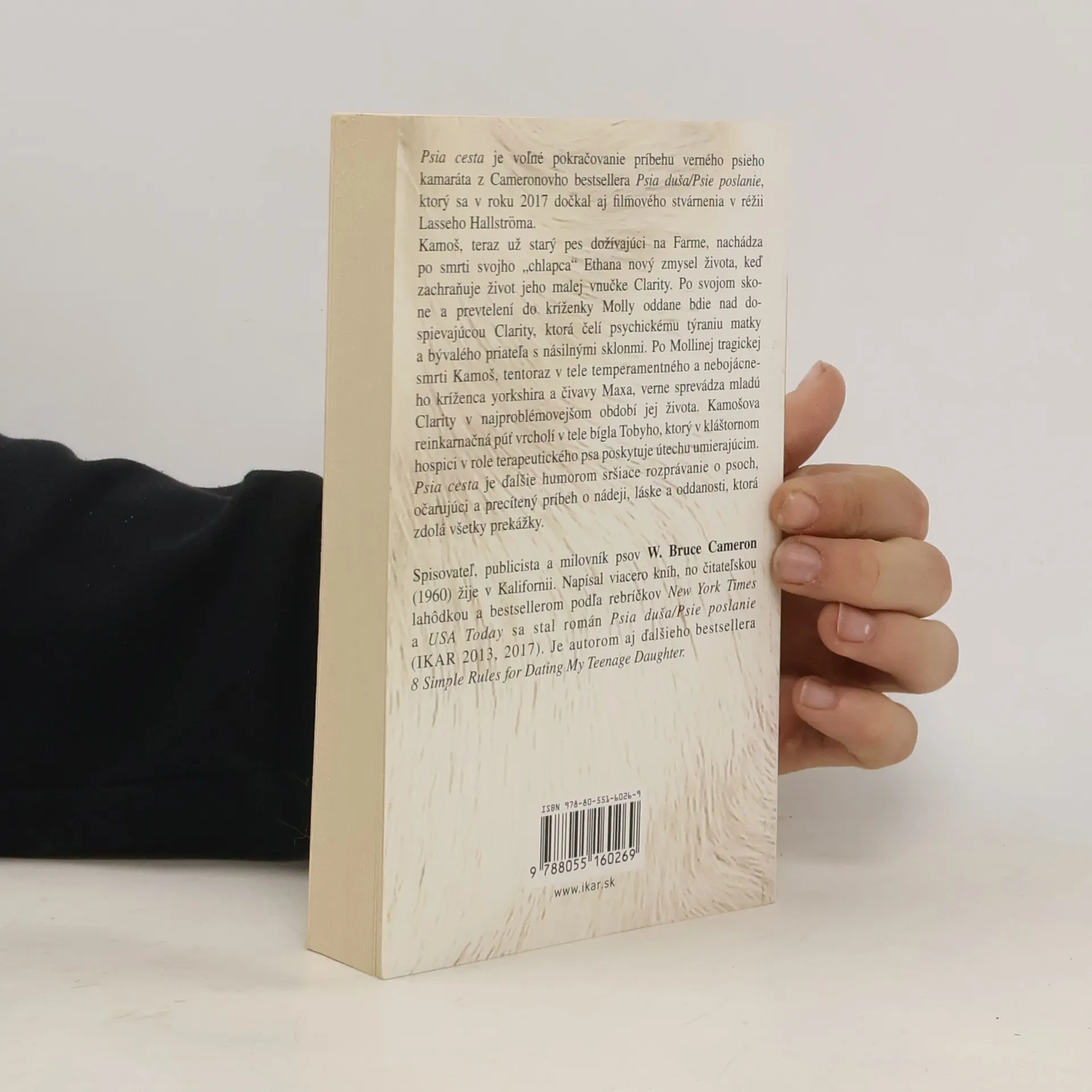 Psia cesta je voľné pokračovanie príbehu verného psieho kamaráta z Cameronovho bestsellera Psia duša/Psie poslanie, ktorý sa v roku 2017 dočkal aj filmového stvárnenia v réžii Lasseho Hallströma. Kamoš, teraz už starý pes dožívajúci na Farme, nachádza po smrti svojho „chlapca“ Ethana nový zmysel života, keď zachraňuje život jeho malej vnučke Clarity. Po svojom skone a prevtelení do kríženky Molly oddane bdie nad dospievajúcou Clarity, ktorá čelí psychickému týraniu matky a bývalého priateľa s násilnými sklonmi. Po Mollinej tragickej smrti Kamoš, tentoraz v tele temperamentného a nebojácneho kríženca yorkshira a čivavy Maxa, verne sprevádza mladú Clarity v najproblémovejšom období jej života. Kamošova reinkarnačná púť vrcholí v tele bígla Tobyho, ktorý v kláštornom hospici v role terapeutického psa poskytuje útechu umierajúcim. Psia cesta je ďalšie humorom sršiace rozprávanie o psoch, očarujúci a precítený príbeh o nádeji, láske a oddanosti, ktorá zdolá všetky prekážky.