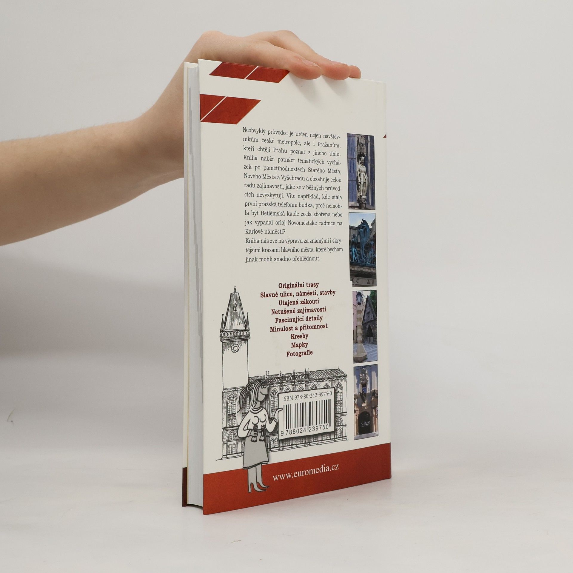 Historicko-místopisný průvodce po Praze, určený nejen Pražanům, ale i návštěvníkům české metropole, kteří chtějí Prahu poznat z jiného úhlu. Nabízí 15 tematických vycházek po pamětihodnostech Starého města, Nového města a Vyšehradu, se řadou zajímavostí a zvláštností, které se v průvodcích mnohdy nevyskytují. Součástí knihy jsou mapky se všemi objekty, o nichž je v textu řeč, černobílé kresby zobrazující to, co už k vidění není, a unikátní fotografie zachycující domy či různé zdobné prvky, které nejsou běžně přístupné nebo které ke své škodě při dnešním životním tempu snadno přehlédneme.