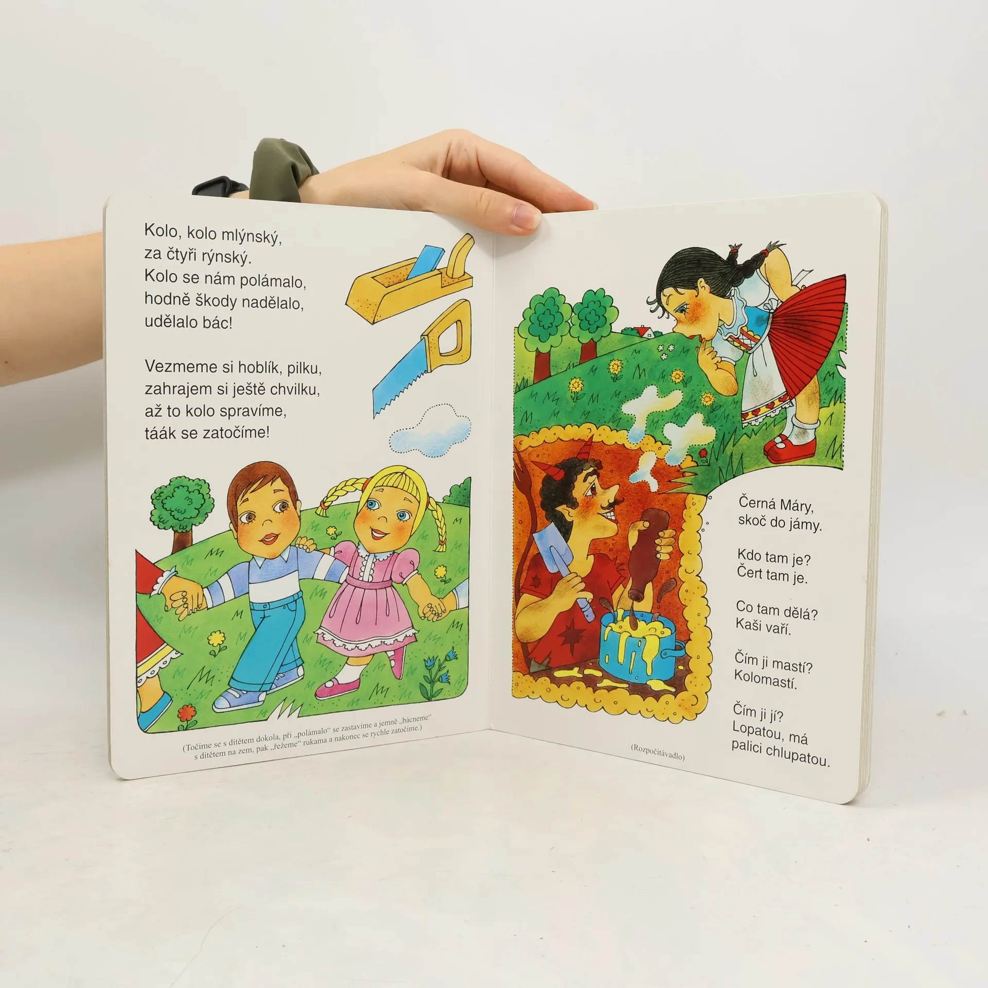 Kniha obsahuje výběr oblíbených lidových říkadel, která jsou doprovázena půvabnými ilustracemi Vlasty Švejdové. Jelikož je kniha určena zejména pro společné čtení dětí a jejich rodičů či prarodičů, nechybí u každé říkanky námět na hru, pohyby a zvuky, které s ní bývají obvykle spojovány.