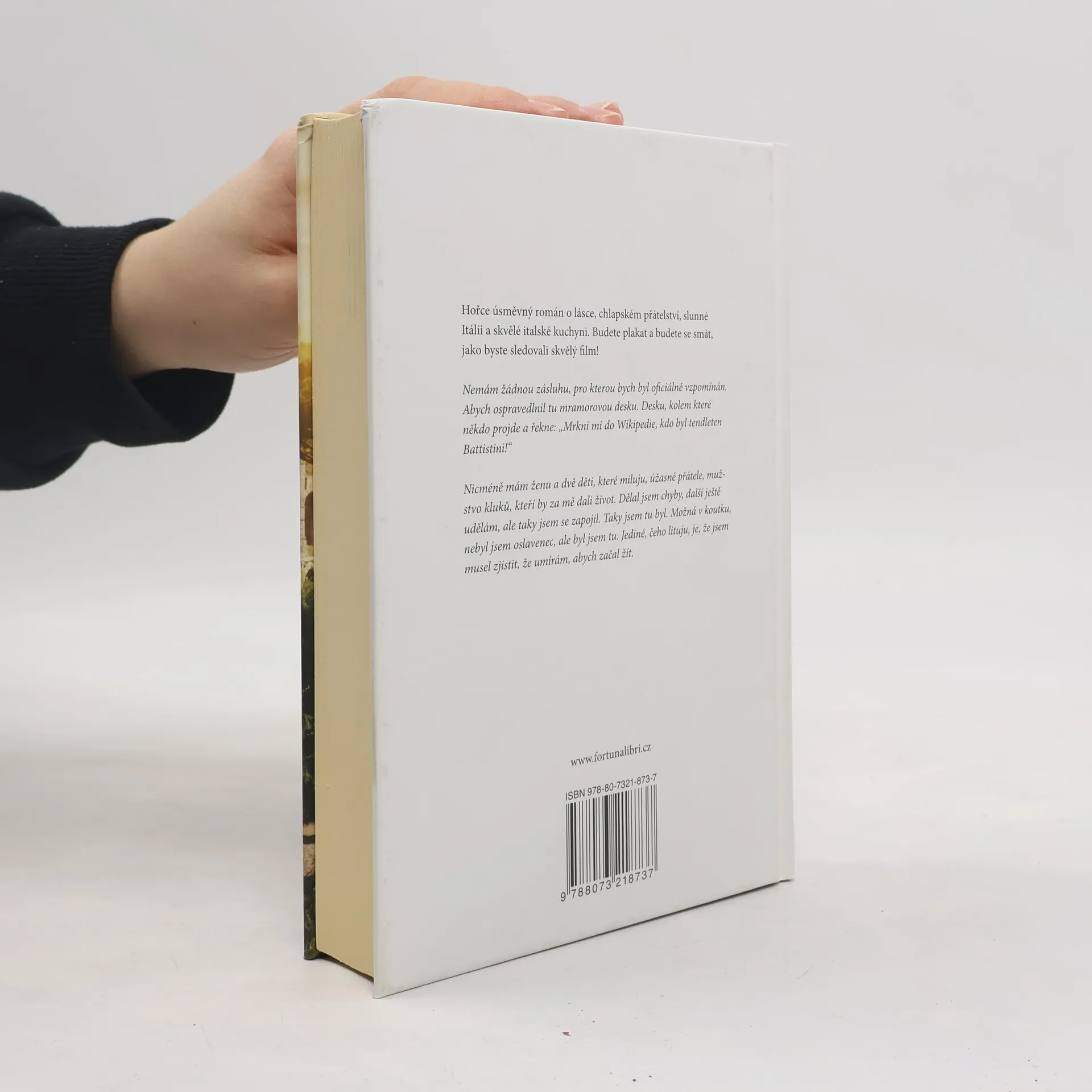Hořce úsměvný román o lásce, chlapském přátelství, slunné Itálii a skvělé italské kuchyni. Budete plakat a budete se smát, jako byste sledovali skvělý film! Nemám žádnou zásluhu, pro kterou bych byl oficiálně vzpomínán. Abych ospravedlnil tu mramorovou desku. Desku, kolem které někdo projde a řekne: „Mrkni mi do Wikipedie, kdo byl tendleten Battistini!“ Nicméně mám ženu a dvě děti, které miluju, úžasné přátele, mužstvo kluků, kteří by za mě dali život. Dělal jsem chyby, další ještě udělám, ale taky jsem se zapojil. Taky jsem tu byl. Možná v koutku, nebyl jsem oslavenec, ale byl jsem tu. Jediné, čeho lituju, je, že jsem musel zjistit, že umírám, abych začal žít.