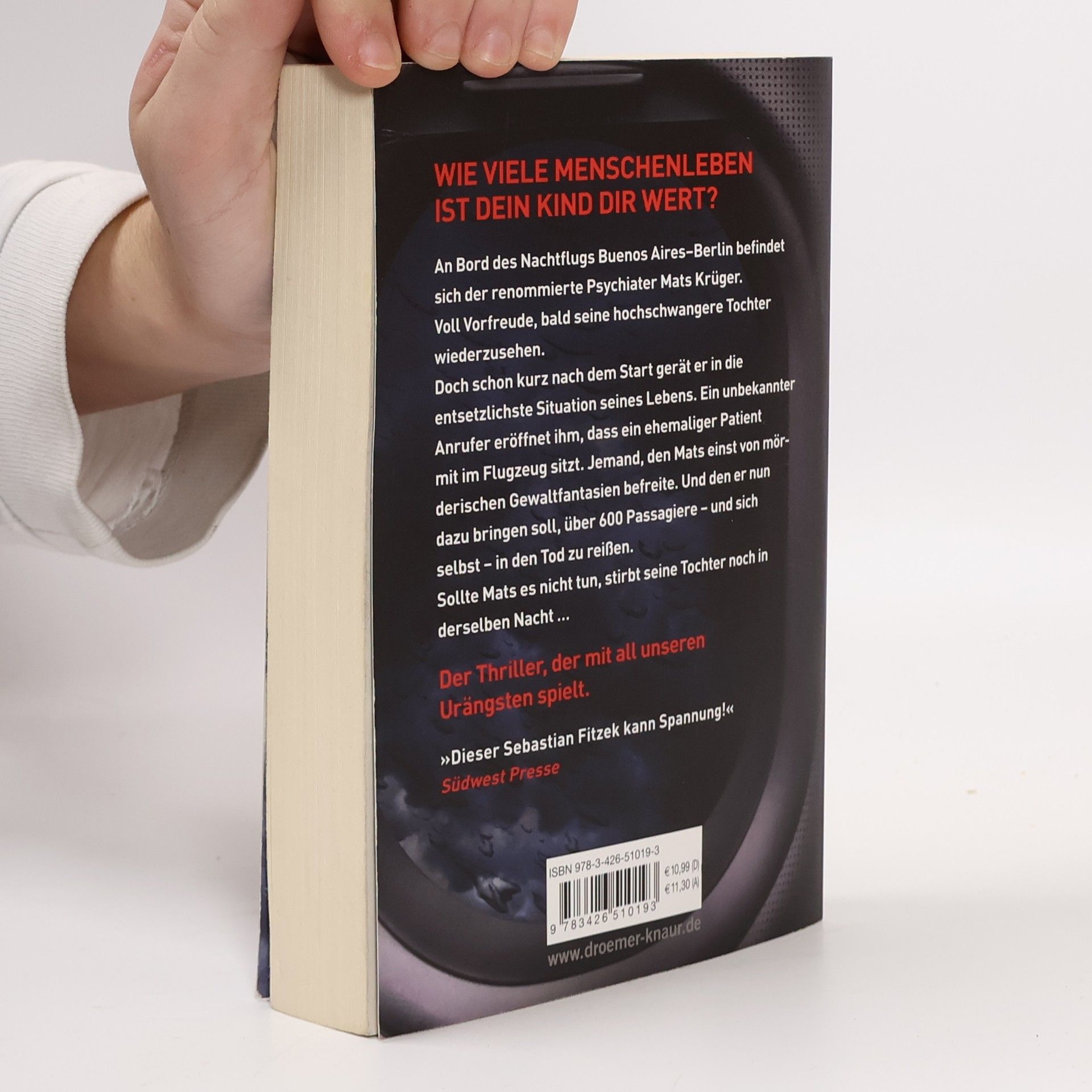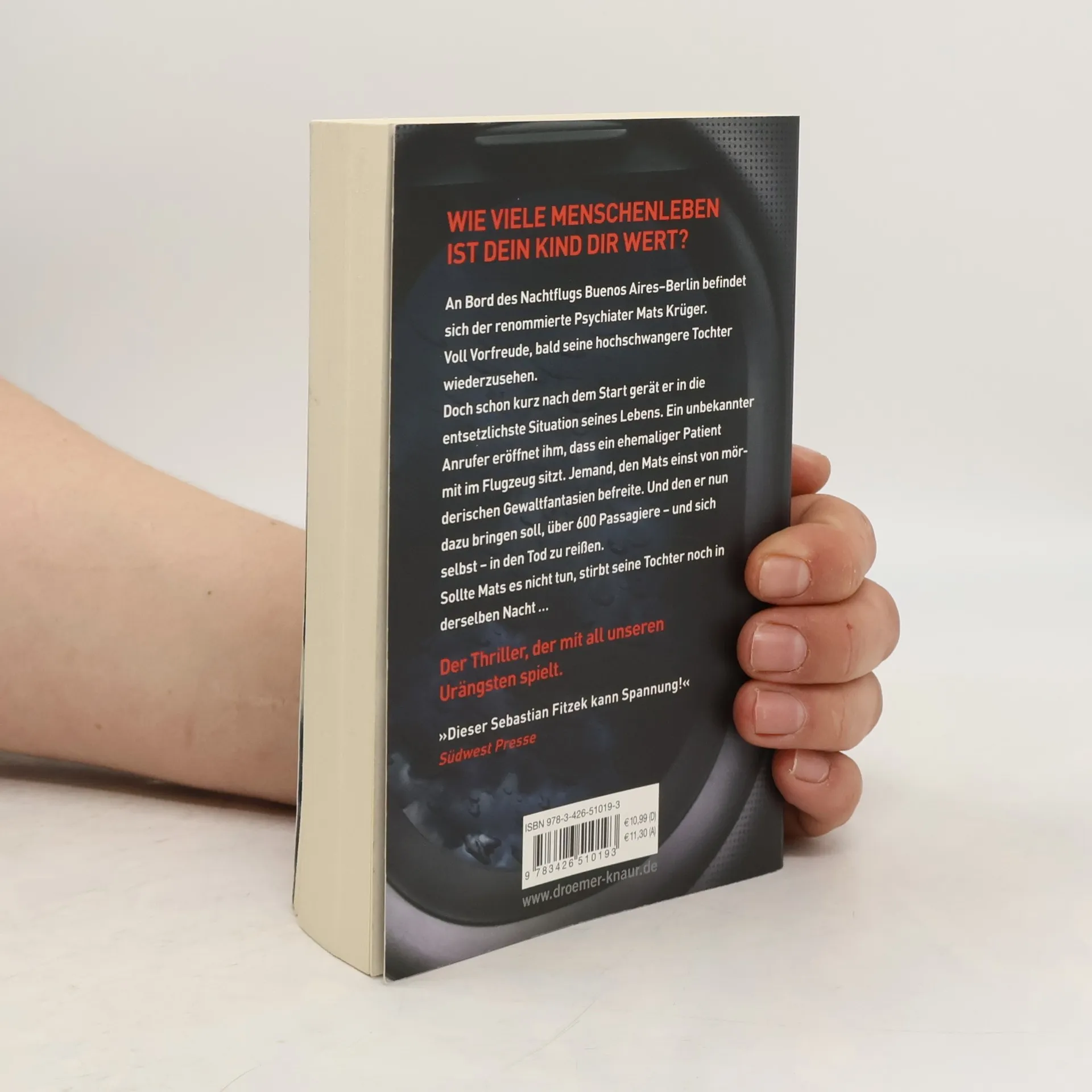 In diesem Psychothriller von Bestseller-Autor Sebastian Fitzek geht es um die tiefsten menschlichen Ängste des Eingeschlossenseins und der Hilflosigkeit in einem Flugzeug. Mats Krüger, ein erfolgreicher Psychiater, muss seine panische Flugangst überwinden, als seine hochschwangere Tochter Nele nach Jahren des Schweigens Kontakt zu ihm aufnimmt. Mats, der nach dem Tod seiner Frau nach Argentinien ausgewandert ist, wird gebeten, nach der Geburt des Babys zu helfen. Nach einem Flugangst-Seminar besteigt Mats den Langstreckenflug von Buenos Aires nach Berlin. Kurz nach dem Einnehmen seines Platzes wird ihm klar, dass er sich auf die falschen Ängste vorbereitet hat. Es sind nicht Turbulenzen oder Terrorwarnungen, die ihn in einen seelischen Ausnahmezustand versetzen, sondern ein Anruf eines Unbekannten. Dieser informiert ihn, dass sich ein ehemaliger Patient an Bord befindet, jemand, den Mats einst von mörderischen Gewaltphantasien befreite. Nun wird Mats gezwungen, zu verhindern, dass dieser Patient über 600 Passagiere und sich selbst in den Tod reißt. Ein packender Thriller, der die Grenzen der Psyche auslotet.