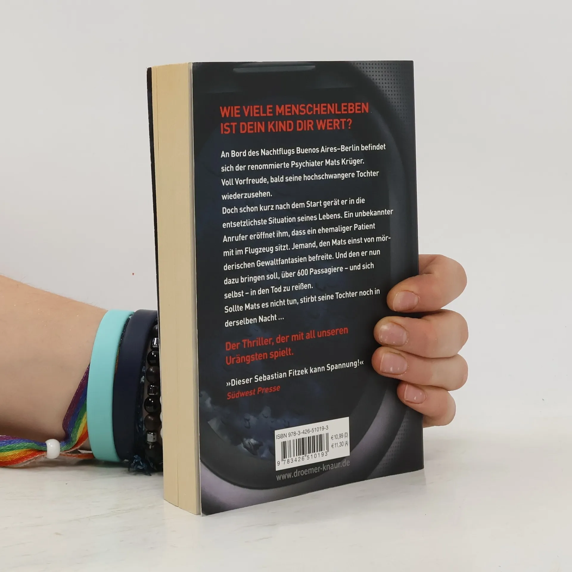 In diesem Psychothriller von Bestseller-Autor Sebastian Fitzek geht es um die tiefsten menschlichen Ängste des Eingeschlossenseins und der Hilflosigkeit in einem Flugzeug. Mats Krüger, ein erfolgreicher Psychiater, muss seine panische Flugangst überwinden, als seine hochschwangere Tochter Nele nach Jahren des Schweigens Kontakt zu ihm aufnimmt. Mats, der nach dem Tod seiner Frau nach Argentinien ausgewandert ist, wird gebeten, nach der Geburt des Babys zu helfen. Nach einem Flugangst-Seminar besteigt Mats den Langstreckenflug von Buenos Aires nach Berlin. Kurz nach dem Einnehmen seines Platzes wird ihm klar, dass er sich auf die falschen Ängste vorbereitet hat. Es sind nicht Turbulenzen oder Terrorwarnungen, die ihn in einen seelischen Ausnahmezustand versetzen, sondern ein Anruf eines Unbekannten. Dieser informiert ihn, dass sich ein ehemaliger Patient an Bord befindet, jemand, den Mats einst von mörderischen Gewaltphantasien befreite. Nun wird Mats gezwungen, zu verhindern, dass dieser Patient über 600 Passagiere und sich selbst in den Tod reißt. Ein packender Thriller, der die Grenzen der Psyche auslotet.