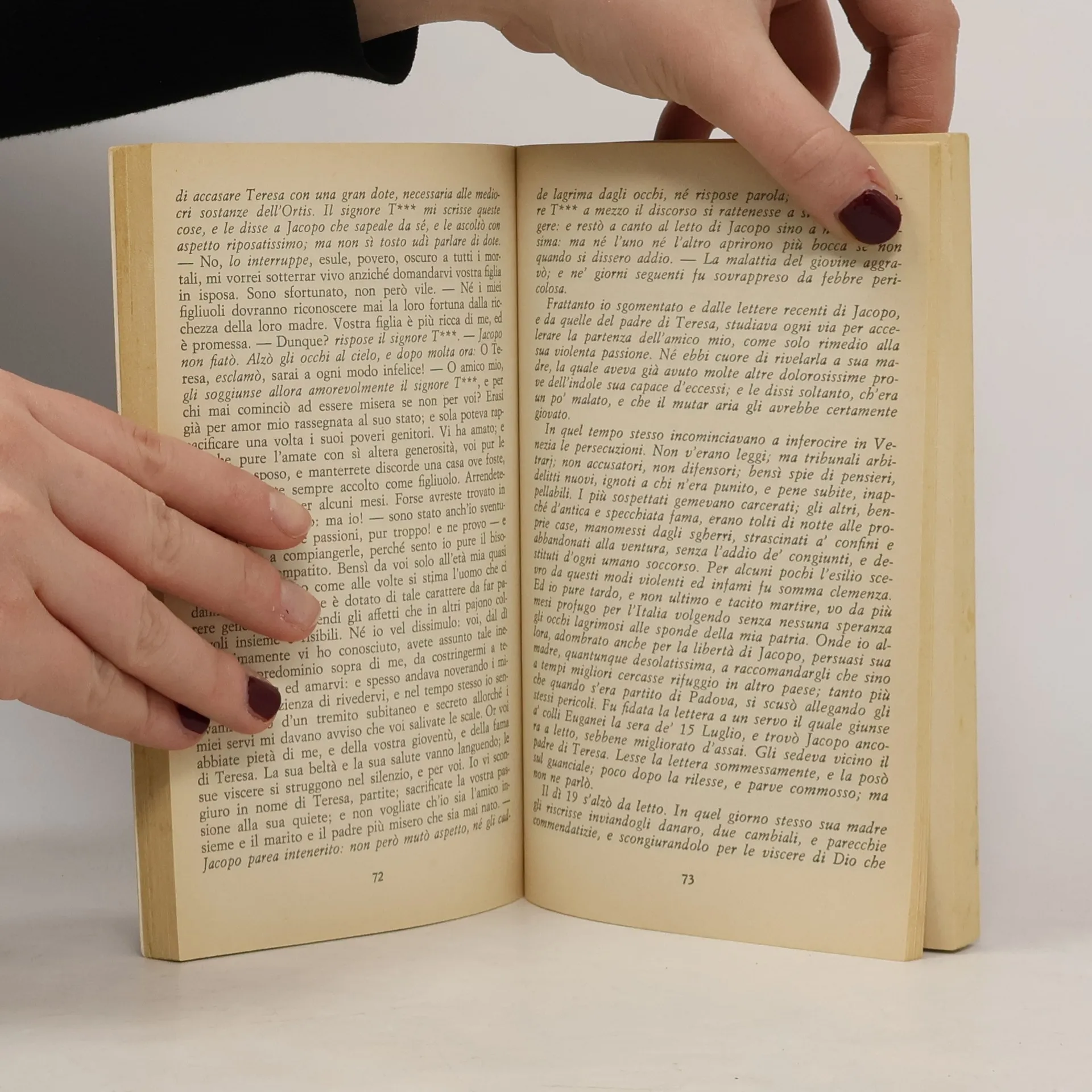 Fuggiasco da Venezia, dopo Campoformio, Jacopo si isola sui Colli Euganei. Qui conosce Teresa e se ne innamora, ma sa che questo è un amore impossibile, perché Teresa è promessa a Odoardo. Jacopo si mette in viaggio per l'Italia, senza una meta e ovunque vede la tragedia dell'oppressione straniera, né lo consolano le bellezze naturali o la saggezza del vecchio Parini, incontrato a Milano. La tragica conclusione è una denuncia al mondo di una doppia delusione. Annotation Supplied by Informazioni Editoriali