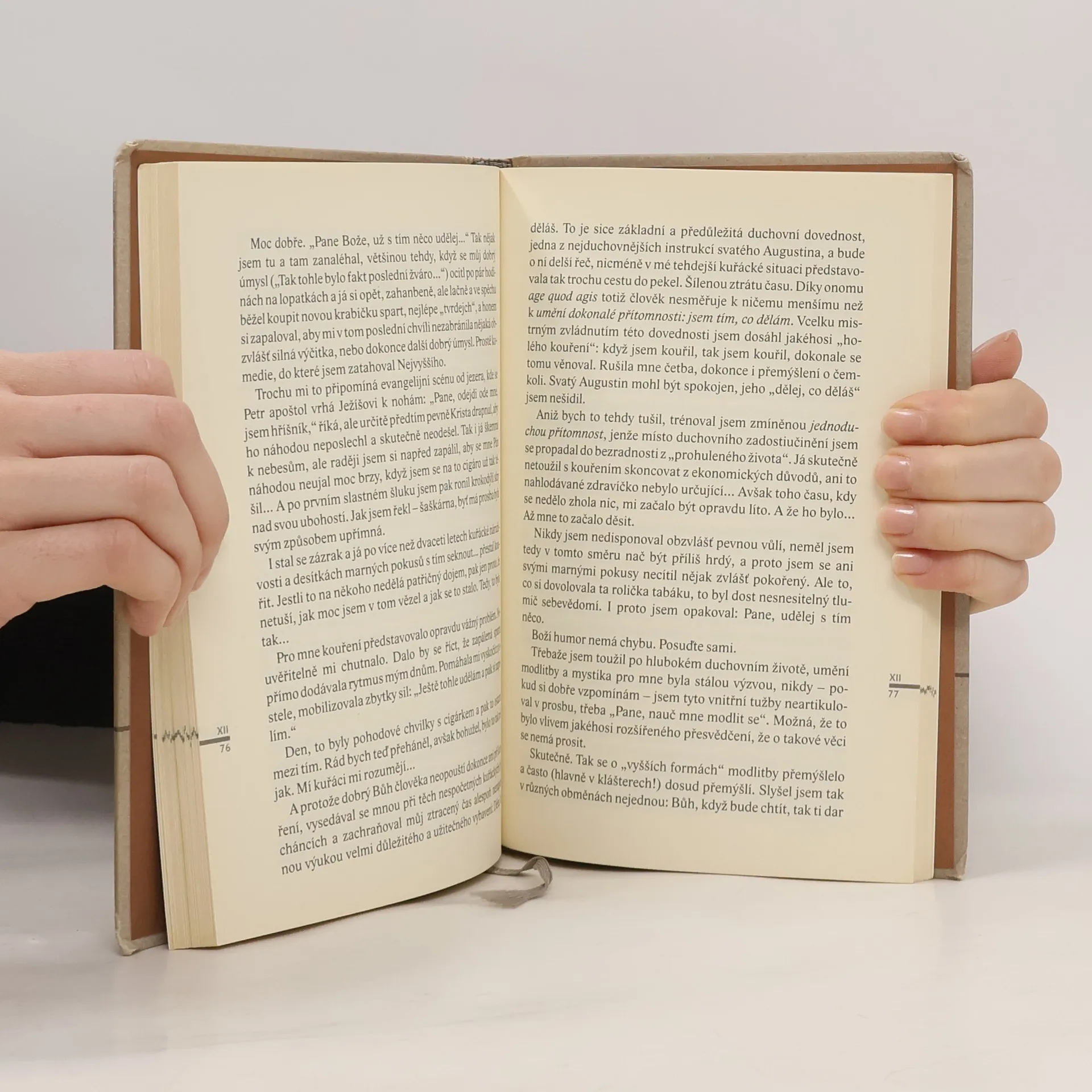 Co je modlitba? Podle jedné z nejstarších a nejčastěji používaných definic je to pozvednutí mysli k Bohu. Už zde, v tomto jednoduchém vyjádření, lze narazit na úskalí či bludný kámen. Pozvednutí mysli totiž neznamená pozvednutí se. A už vůbec ne jakékoli pozvednutí ze světa či nad svět. Modlitbou nejsme v žádném případe zváni ani k opuštění těla či povznesení se nad něj. Jsem-li povolán žít jako člověk, pak jsem pupeční šňůrou připoután ke světu, k mému světu, a modlitba stojí ve službě tohoto povolání a ani ji nesmí napadnout něco na tom měnit. To cítím jako potřebné říci, aby bylo od počátku jasno. Modlitba se má, chce a musí podílet na mém dramatickém zápasu o člověčenství šlapající tento svět. Knížka Karla Satorii je zamyšlena, jako drobná pomoc…třeba někomu.