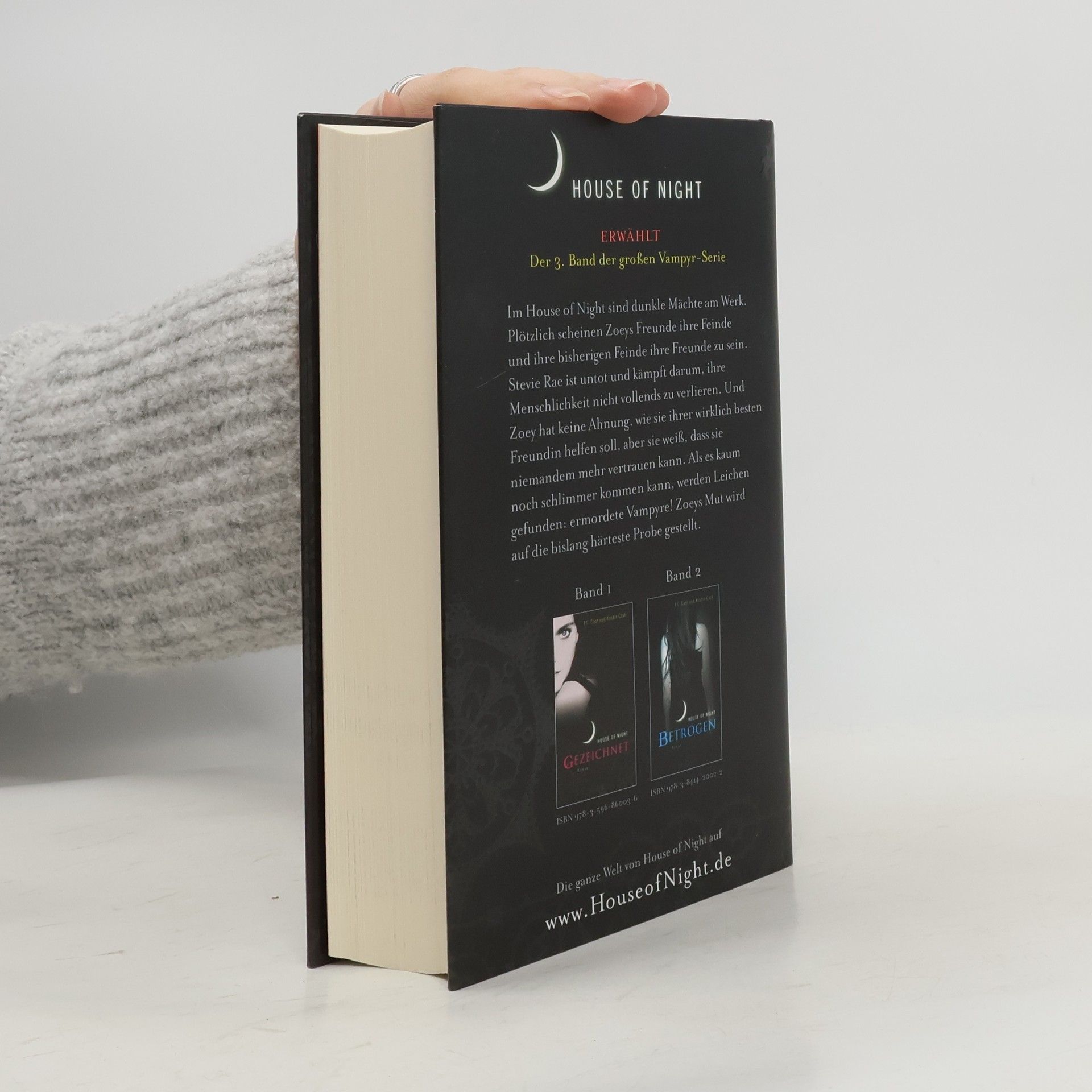 House of Night ERWÄHLTDer 3. Band der großen Vampyr-Serie. Dunkle Mächte sind im House of Night am Werk und Zoeys Erlebnisse im Internat nehmen eine rätselhafte Wendung. Zoeys beste Freundin Stevie Rae ist untot und versucht mit aller Macht, ihre Menschlichkeit nicht vollends zu verlieren. Und Zoey hat keine Ahnung, wie sie ihr dabei helfen kann, aber sie spürt, dass alles, was sie und Stevie Rae herausfinden vor den anderen im House of Night geheim gehalten werden muss. Denn plötzlich scheint es keinen mehr zu geben, dem sie wirklich vertrauen können. Als es kaum noch schlimmer kommen kann, werden Leichen gefunden: ermordete Vampyre! Aber Zoey findet heraus, dass nichts so ist wie es scheint… ERWÄHLT ist der dritte Band der House of Night- Serie, in der Zoey als Jungvampyrin auf die bislang härteste Probe gestellt wird.