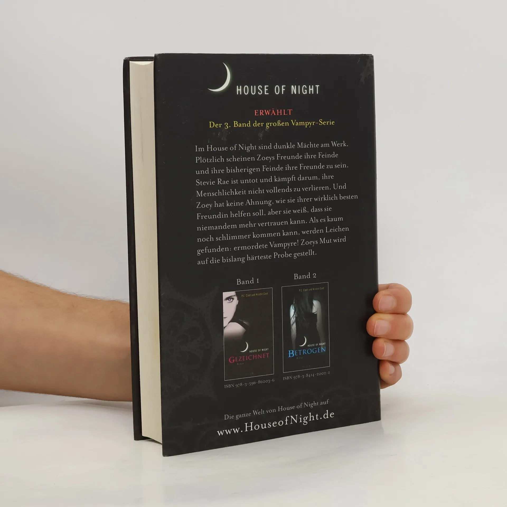 House of Night ERWÄHLTDer 3. Band der großen Vampyr-Serie. Dunkle Mächte sind im House of Night am Werk und Zoeys Erlebnisse im Internat nehmen eine rätselhafte Wendung. Zoeys beste Freundin Stevie Rae ist untot und versucht mit aller Macht, ihre Menschlichkeit nicht vollends zu verlieren. Und Zoey hat keine Ahnung, wie sie ihr dabei helfen kann, aber sie spürt, dass alles, was sie und Stevie Rae herausfinden vor den anderen im House of Night geheim gehalten werden muss. Denn plötzlich scheint es keinen mehr zu geben, dem sie wirklich vertrauen können. Als es kaum noch schlimmer kommen kann, werden Leichen gefunden: ermordete Vampyre! Aber Zoey findet heraus, dass nichts so ist wie es scheint… ERWÄHLT ist der dritte Band der House of Night- Serie, in der Zoey als Jungvampyrin auf die bislang härteste Probe gestellt wird.