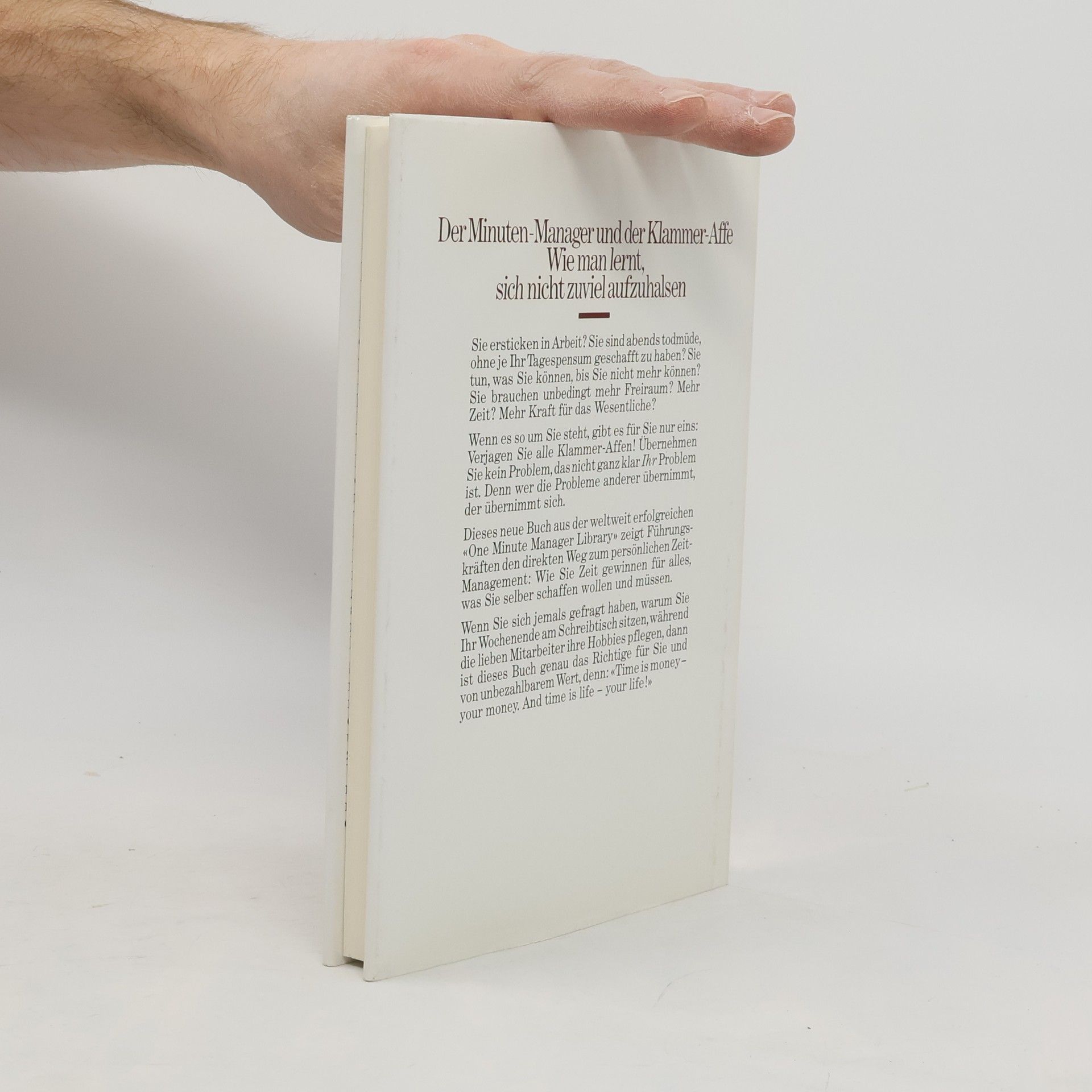 Sie ersticken in Arbeit? Sie sind abends todmüde, ohne je Ihr Tagespensum geschafft zu haben? Sie tun, was Sie können, bis Sie nicht mehr können? Sie brauchen unbedingt mehr Freiraum? Wenn es so um Sie steht, gibt es für Sie nur eins: Verjagen Sie alle Klammer-Affen! Übernehmen Sie kein Problem, das nicht ganz klar IHR Problem ist. Denn wer die Probleme anderer übernimmt, der übernimmt sich. Dieses Buch aus der weltweit erfolgreichen «One Minute Manager Library» zeigt Führungskräften den direkten Weg zum persönlichen Zeit-Management.