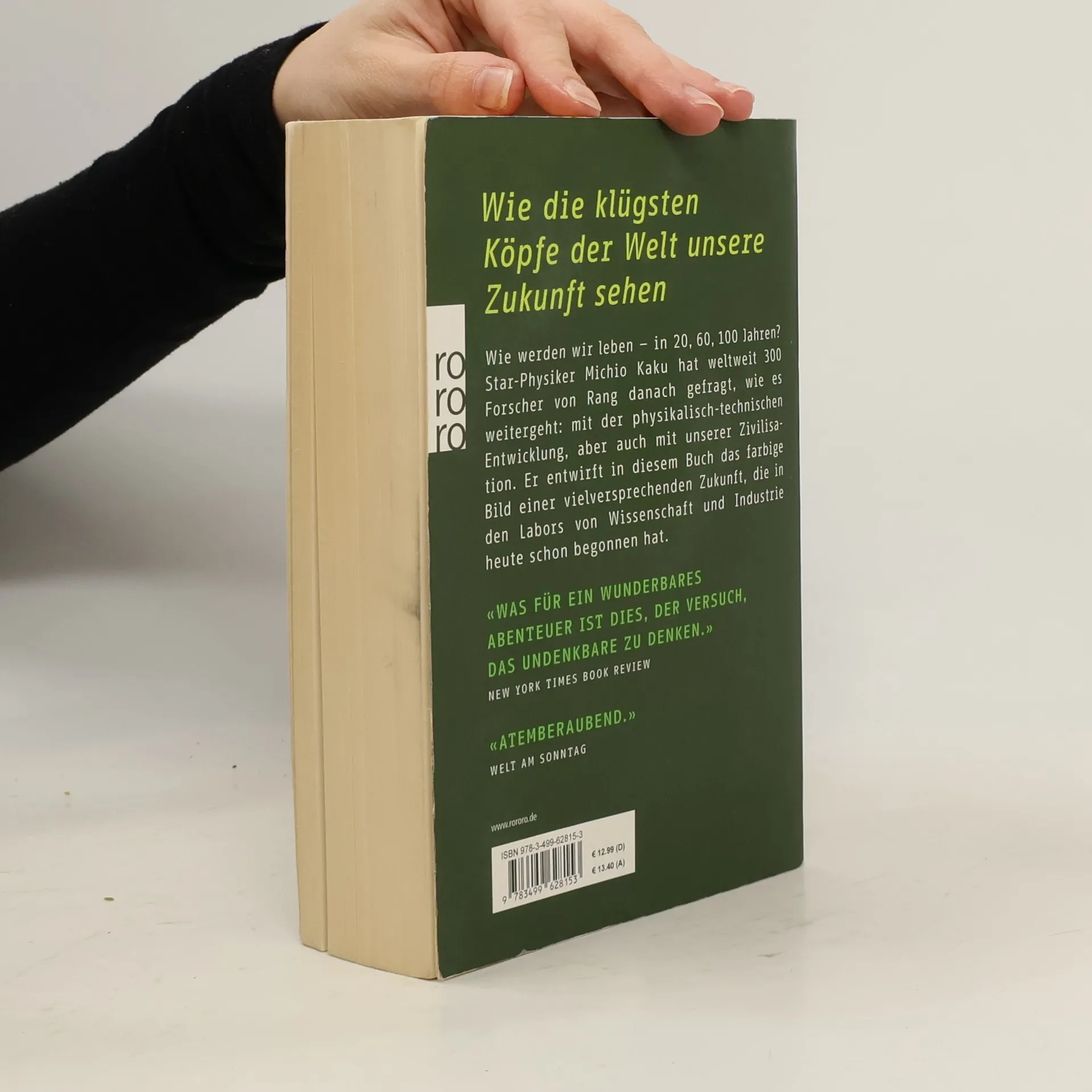 Wie werden wir leben –in 20, 60, 100 Jahren?Star-Physiker Michio Kaku sagt der Menschheit eine rosige Zukunft voraus. Roboter werden uns die Alltagsarbeit abnehmen. Küchengeräte und andere Maschinen steuern wir mit der Kraft unserer Gedanken. Medizinische Nanobots werden aufmerksam durch unsere Blut- und Nervenbahnen eilen und sogar Krebs heilen. Zu lästigen Meetings schicken wir unser Hologramm – an einen Konferenztisch mit virtuellen Menschen und solchen aus Fleisch und Blut. Informationen können direkt über die Retina ins Kleinhirn projiziert werden. Wir beherrschen auch das Wetter, und Nationalstaaten spielen kaum noch eine Rolle. Trotzdem werden wir weiter reisen, uns treffen, Sport treiben und in die Kneipe gehen, weil Menschen nun mal so sind.Science-Fiction? Nein, seriöse Zukunftsforschung. Eingängig beschreibt Michio Kaku, wie der Weg in diese Zukunft aussieht – denn vieles davon wird heute schon in Wissenschaft und Industrie vorbereitet. Kaku hat weltweit 300 Forscher von Rang befragt, wie die gesellschaftlich-technische Entwicklung ihrer Voraussicht nach verlaufen wird: von der Künstlichen Intelligenz bis zur Raumfahrt, von der Medizin und Biologie bis zur Nanotechnologie. Und er präsentiert seine Befunde überzeugend und mit leichter Hand.