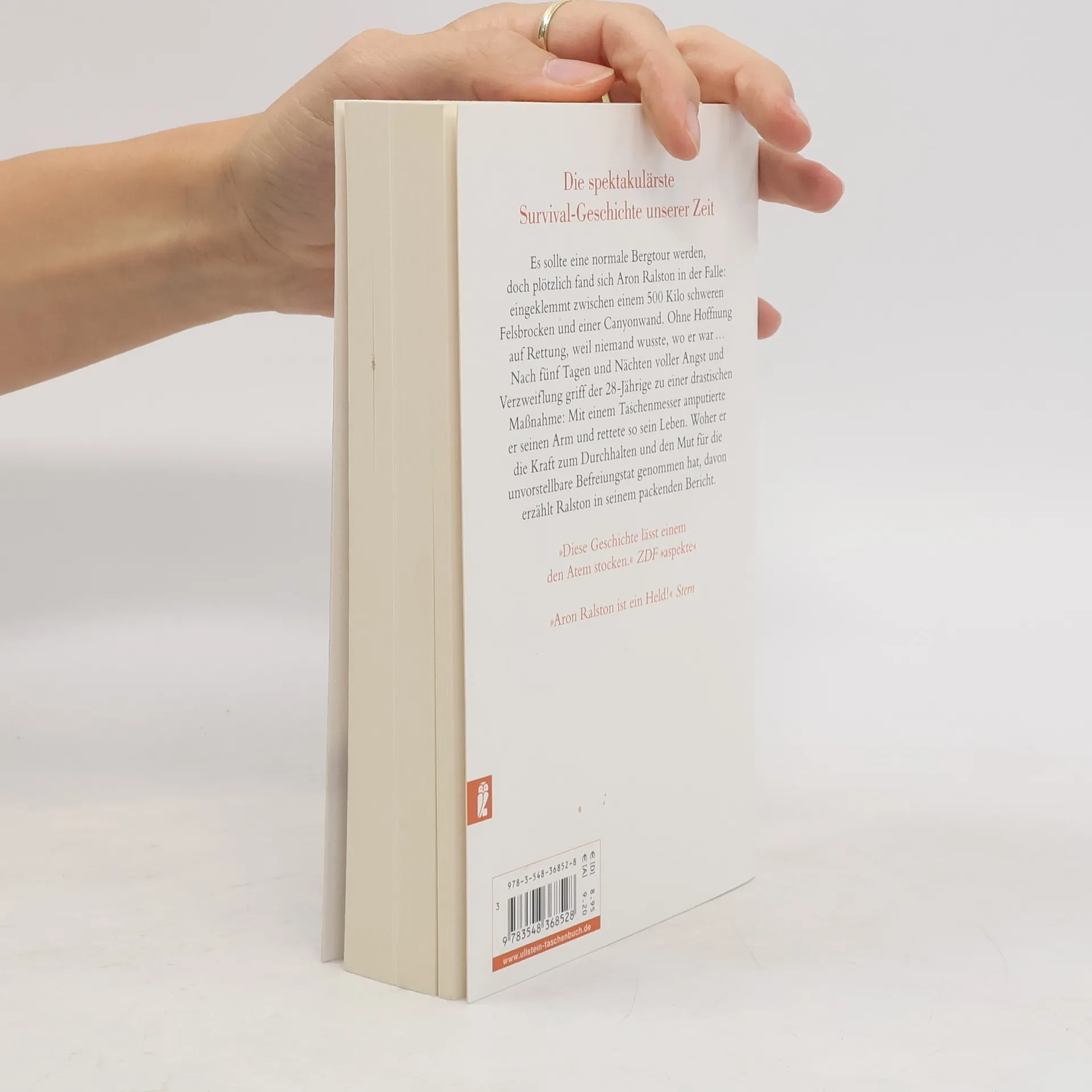 Es sollte eine normale Bergtour werden, doch plötzlich fand sich Aron Ralston in der Falle: eingeklemmt zwischen einem 500 Kilo schweren Felsbrocken und einer Canyonwand. Ohne Hoffnung auf Rettung, weil niemand wußte, wo er war. Nach fünf Tagen und Nächten voller Angst und Verzweiflung griff der 28jährige zu einer drastischen Maßnahme: Mit einem Taschenmesser amputierte er seinen eigenen Arm und rettete so sein Leben. Woher er die Kraft zum Durchhalten und den Mut für die unvorstellbare Befreiungstat genommen hat, davon erzählt Ralston in seinem packenden Bericht.