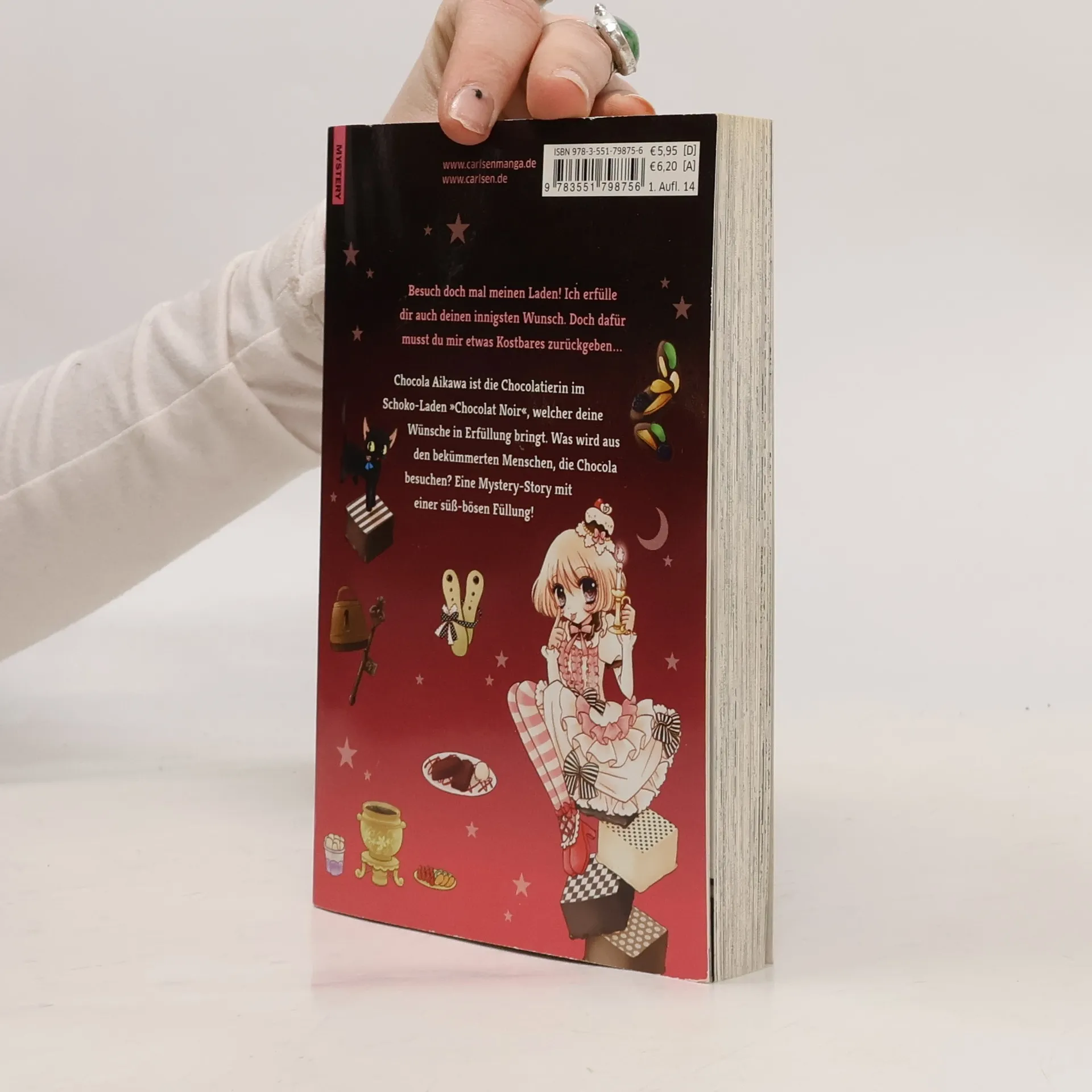 Schokosüßer, bitterböser Gruselspaß - Chocola Aikawa's magische Konditorei hat geöffnet! Hast du einen Wunsch, der dir unmöglich erscheint und auf natürlichem Wege niemals in Erfüllung gehen kann? Aber es gibt jemand, der dir diese Wünsche und noch viel mehr erfüllen kann: Die Hexe und Chocolatierin, Chocola Aikawa betreibt eine Konditorei mit magischer Schokolade, welche jede Sehnsucht wahr werden lassen kann. Doch für Naschen zahlt man immer einen Preis - für jeden Wunsch, der Wirklichkeit wird, verliert man sein Liebstes… Was wird aus den bekümmerten Menschen, die Chocola besuchen? Ursprünglich als Einzelband geplant, hat sich die Serie inzwischen zum Topseller des japanischen Verlages Shogakukan gemausert! Band 5 des zartbitteren Mystery-Manga für alle Schokoladen- und Fantasyfans! Empfohlen für Leser*innen ab 12 Jahren. Weitere Informationen: - Ein süßer Genuss auch für Manga-Neulinge - Bisher 21 Bände erschienen
