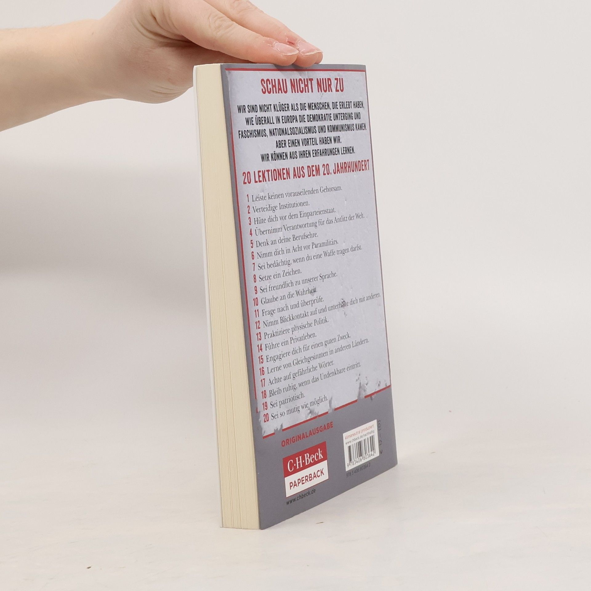 Wir sind nicht klüger als die Menschen, die erlebt haben, wie überall in Europa die Demokratie unterging und Faschismus, Nationalsozialismus und Kommunismus kamen. Aber einen Vorteil haben wir. Wir können aus ihren Erfahrungen lernen. "Leiste keinen vorauseilenden Gehorsam." So lautet die erste von 20 Lektionen für den Widerstand, mit denen Timothy Snyder die Bürger der Vereinigten Staaten von Amerika vorbereitet auf das, was gestern noch unvorstellbar zu sein schien: einen Präsidenten, der das Gesicht der Demokratie verstümmelt und eine rechtsradikale Tyrannei errichtet. Doch nicht nur in den USA sind Populismus und autoritäres Führertum auf dem Vormarsch. Auch in Europa rückt die Gefahr von rechts immer näher - als ob es das 20. Jahrhundert und seine blutigen Lehren niemals gegeben hätte. Snyders historische Lektionen, die international Aufsehen erregt haben, sind ein Leitfaden für alle, die jetzt handeln wollen - und nicht erst, wenn es zu spät ist. Lektion 8: "Setze ein Zeichen." Dieses Buch tut es. Tun Sie es auch