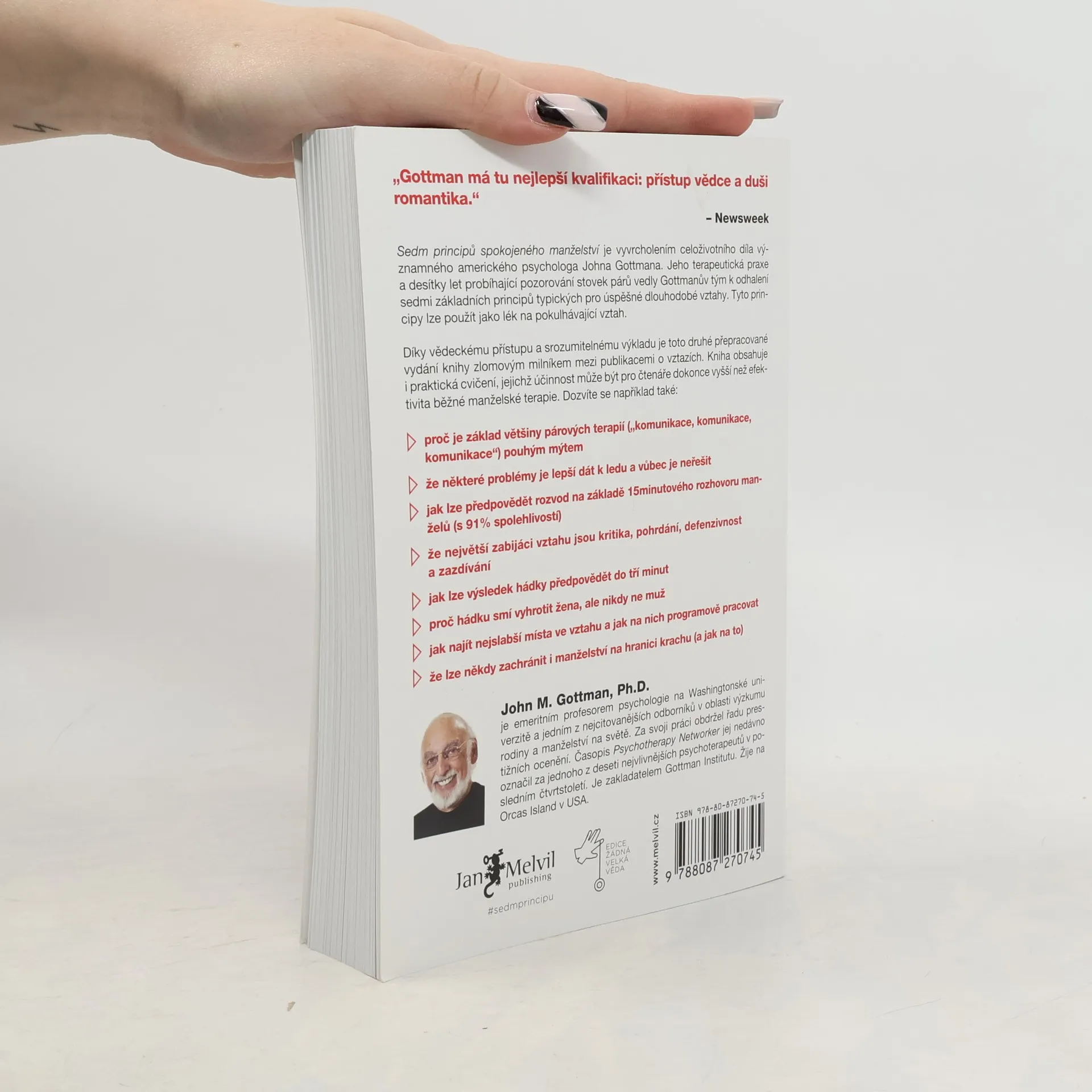 „Sedm principů spokojeného manželství“ představuje vrchol celoživotního díla amerického psychologa Johna Gottmana, jednoho z nejvlivnějších odborníků na manželství a rodičovství. Díky více než dvacetiletému výzkumu nabízí Gottman hluboký vhled do dynamiky partnerských vztahů. Autor zahájil svůj výzkum v roce 1992 se 700 novomanželskými páry, které si nahrávaly 15minutové rozhovory. Analýzou těchto záznamů předpověděl, zda páry vydrží dalších deset let, s úspěšností 94 %. Klíčovým faktorem pro úspěch vztahu se ukázal být poměr pozitivních a negativních interakcí, přičemž páry, které zůstaly spolu, měly pětkrát více pozitivních interakcí než negativních. Gottman se zaměřuje na mýty o komunikaci a identifikuje destruktivní vzorce, které mohou vést k rozchodu. Kniha obsahuje profily párů, které se dokázaly zachránit, a také příběhy těch, kteří proplouvají životem společně. Čtenáři najdou dotazníky a cvičení, které pomohou identifikovat problémy ve vztahu a zaměřit se na jejich řešení. První vydání knihy vyšlo v roce 1999 a stalo se bestsellerem, přičemž aktualizované vydání z roku 2015 přináší nejnovější výzkumy.