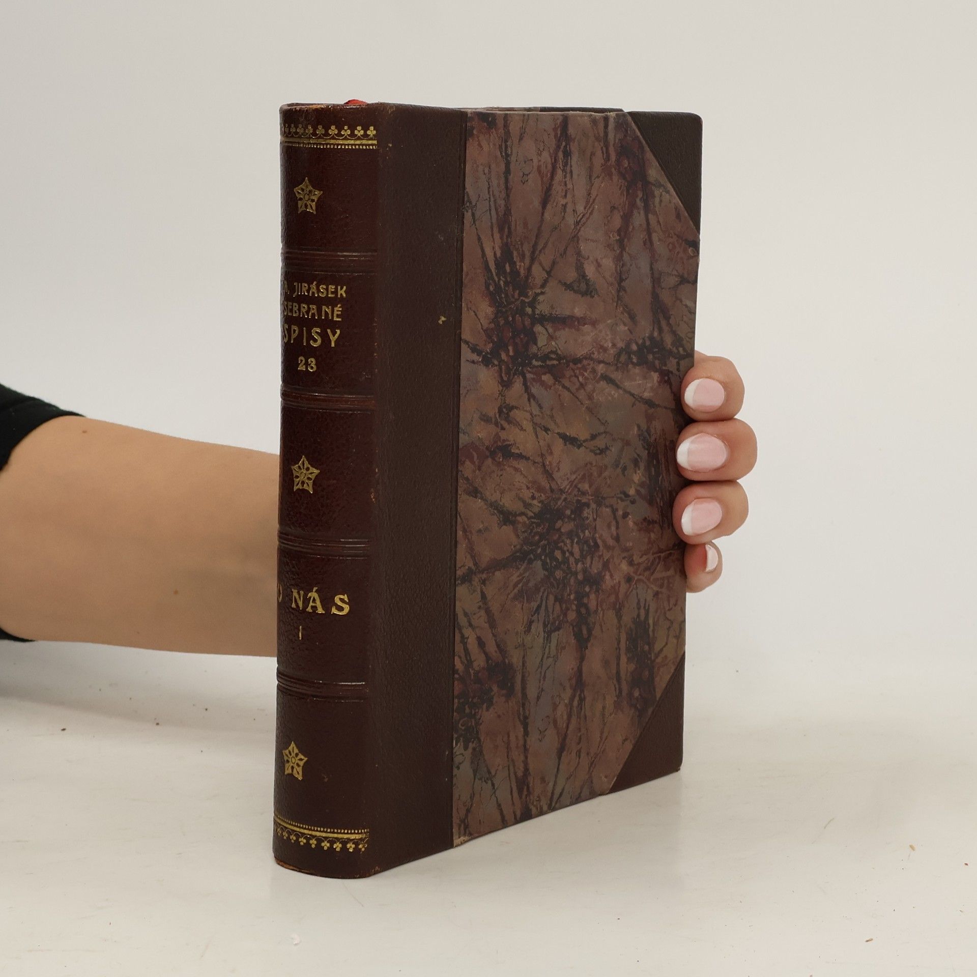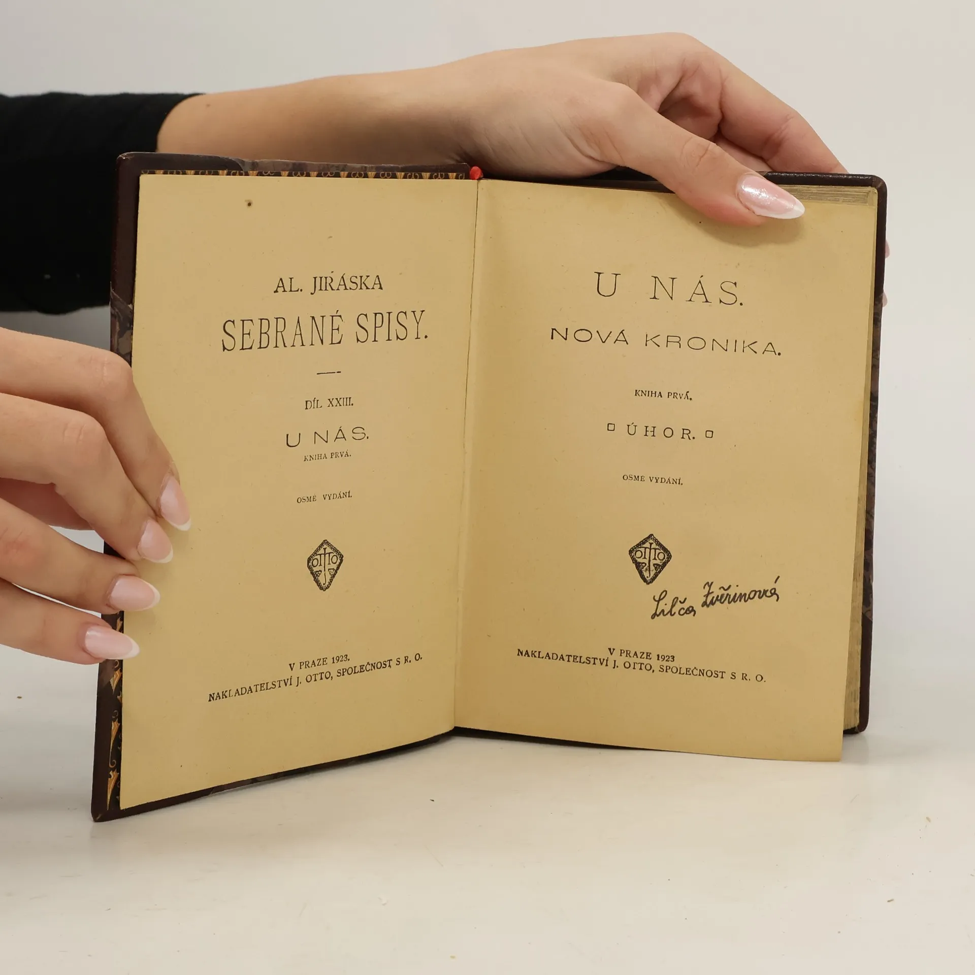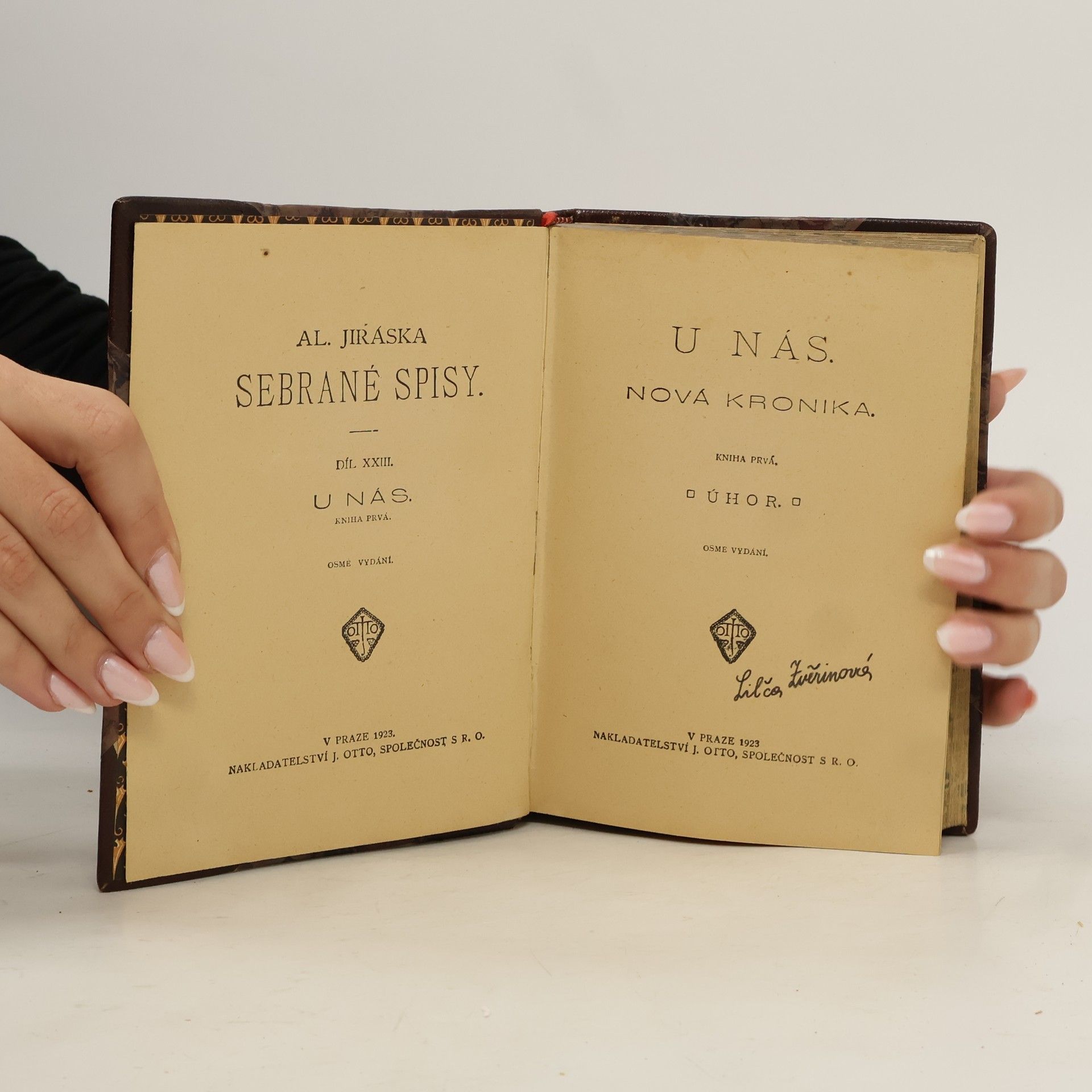 Alois Jirásek: U NÁS. Románová čtyřdílná kronika. Kniha prvá - ÚHOR. Psáno roku 1895 - 1896. Druhé vydání v roce 1926. Nakladatelství J. Otto, spol. s r.o. v Praze, edice: Nová kronika. Tiskem České grafické unie, a.s. v Praze. Vazba celoplátěná nakladatelská s barevným popisem nahřbetu, stužková záložka.