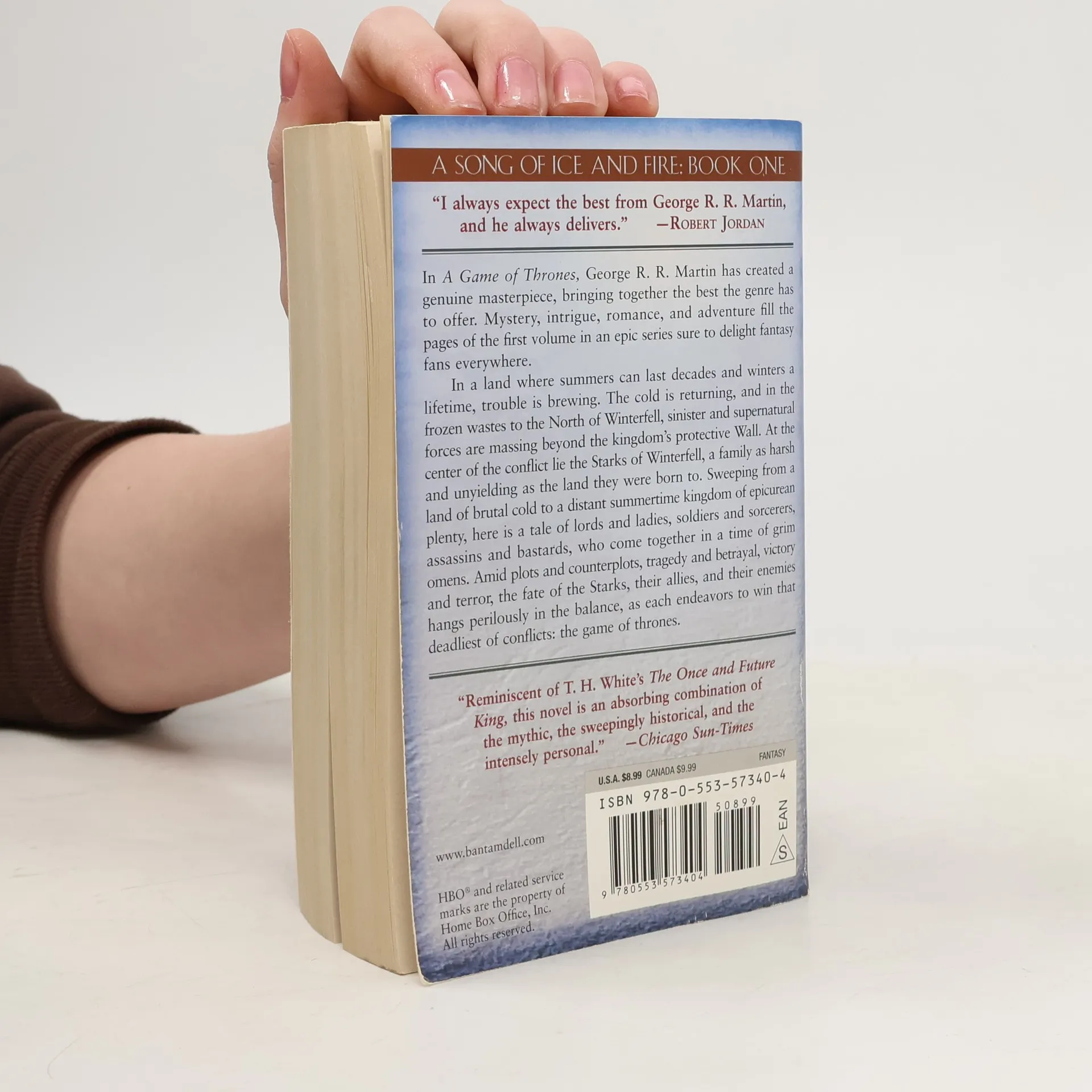 NOW THE ACCLAIMED HBO SERIES GAME OF THRONES—THE MASTERPIECE THAT BECAME A CULTURAL PHENOMENON Here is the first book in the landmark series that has redefined imaginative fiction and become a modern masterpiece. A GAME OF THRONES In a land where summers can last decades and winters a lifetime, trouble is brewing. The cold is returning, and in the frozen wastes to the North of Winterfell, sinister and supernatural forces are massing beyond the kingdom’s protective Wall. At the center of the conflict lie the Starks of Winterfell, a family as harsh and unyielding as the land they were born to. Sweeping from a land of brutal cold to a distant summertime kingdom of epicurean plenty, here is a tale of lords and ladies, soldiers and sorcerers, assassins and bastards, who come together in a time of grim omens. Amid plots and counterplots, tragedy and betrayal, victory and terror, the fate of the Starks, their allies, and their enemies hangs perilously in the balance, as each endeavors to win that deadliest of conflicts: the game of thrones. A GAME OF THRONES • A CLASH OF KINGS • A STORM OF SWORDS • A FEAST FOR CROWS • A DANCE WITH DRAGONS