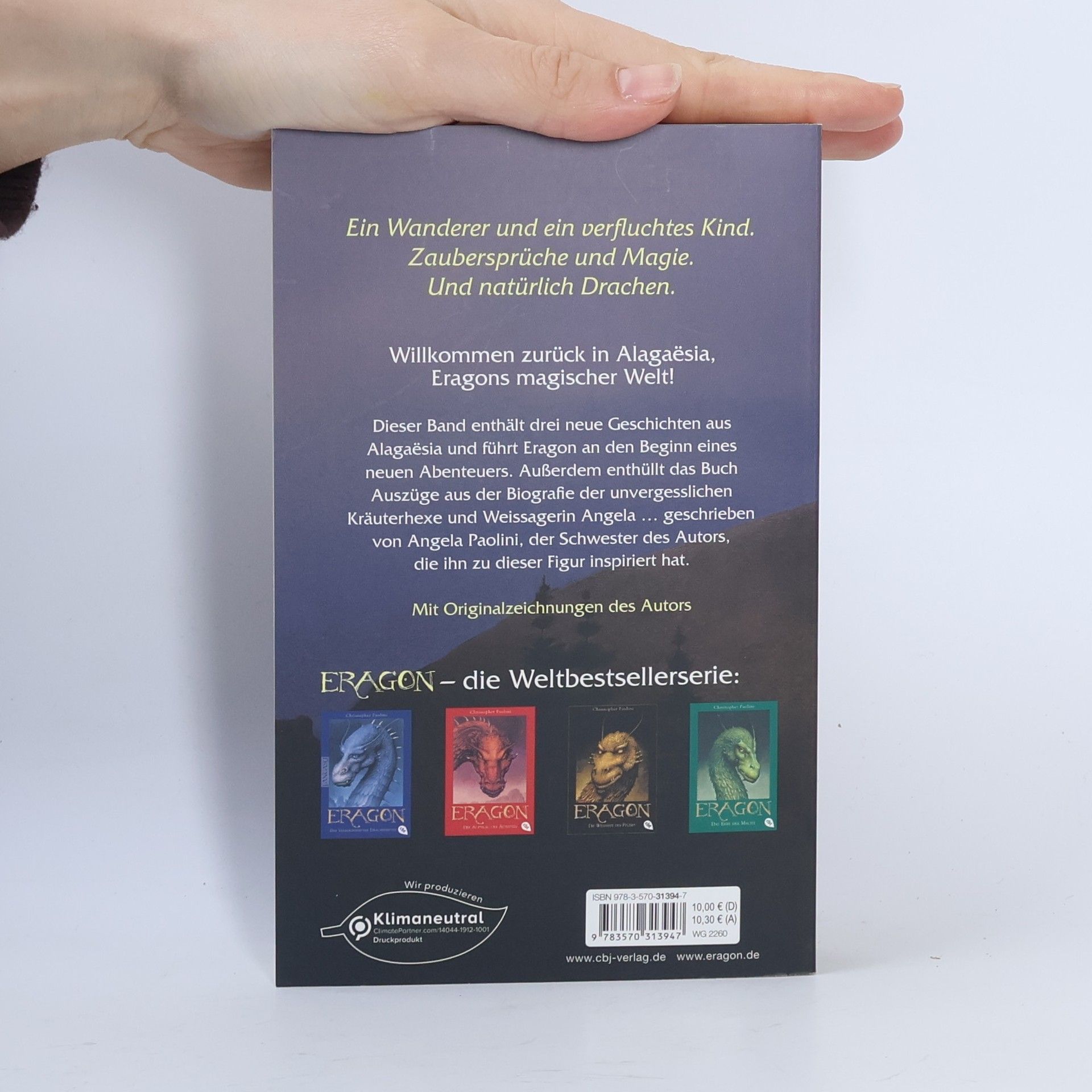 Ein Wanderer und ein verfluchtes Kind. Zaubersprüche und Magie. Und natürlich Drachen. Willkommen zurück in Eragons Welt! Es ist ein Jahr her, dass Eragon aus Alagaësia aufgebrochen ist auf der Suche nach dem geeigneten Ort, um eine neue Generation Drachenreiter auszubilden. Jetzt kämpft er mit unendlich vielen Aufgaben: Er muss einen riesigen Drachenhorst bauen, Dracheneier bewachen und mit kriegerischen Urgals, stolzen Elfen und eigensinnigen Zwergen zurechtkommen. Doch da eröffnen ihm eine Vision der Eldunarí, unerwartete Besucher und eine spannende Legende der Urgals neue Perspektiven. Dieser Band enthält drei neue Geschichten aus Alagaësia und führt Eragon an den Beginn eines neuen Abenteuers. Außerdem enthüllt das Buch Auszüge aus der Biografie der unvergesslichen Kräuterhexe und Weissagerin Angela … geschrieben von Angela Paolini, der Schwester des Autors, die ihn zu dieser Figur inspiriert hat. Mit vier Originalzeichnungen des Autors Alle Bände der »World of Eragon«: Eragon – Das Vermächtnis der Drachenreiter (Band 1) Eragon – Der Auftrag des Ältesten (Band 2) Eragon – Die Weisheit des Feuers (Band 3) Eragon – Das Erbe der Macht (Band 4) Die Gabel, die Hexe und der Wurm. Geschichten aus Alagaësia. Band 1: Eragon (Kurzgeschichten, Band 1) Murtagh – Eine dunkle Bedrohung