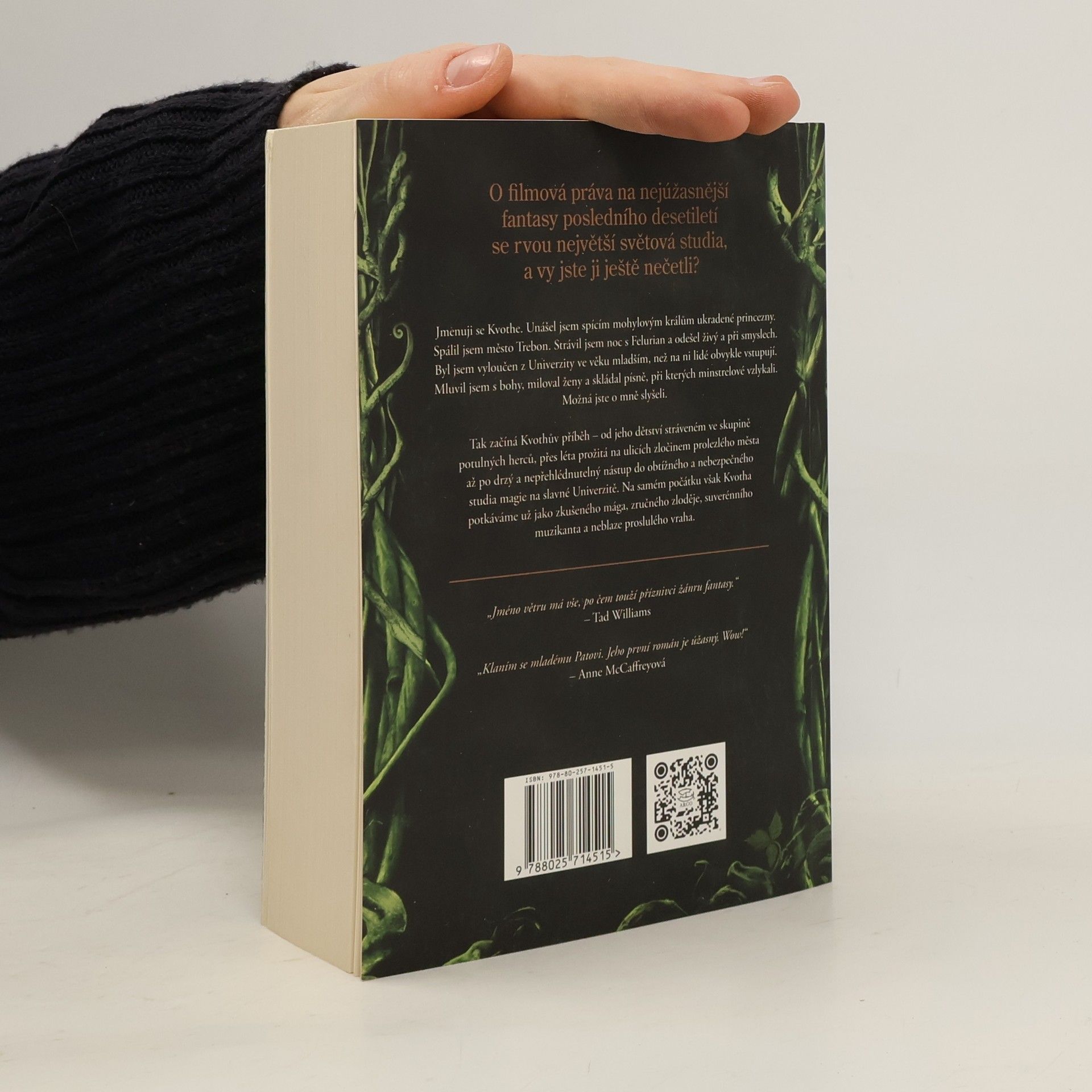 Jmenuji se Kvothe. Unášel jsem spícím mohylovým králům ukradené princezny. Spálil jsem město Trebon. Strávil jsem noc s Felurian a odešel živý a při smyslech. Byl jsem vyloučen z Univerzity ve věku mladším, než na ni lidé obvykle vstupují. Mluvil jsem s bohy, miloval ženy a skládal písně, při kterých minstrelové vzlykali. Možná jste o mně slyšeli. Tak začíná Kvothův příběh – od jeho dětství strávené ve skupině potulných herců, přes léta prožitá jako polodivoký sirotek na ulicích zločinem prolezlého města až po drzý a nepřehlédnutelný vstup do obtížného a nebezpečného studia magie na slavné Univerzitě. Na samém počátku však Kvotha potkáváme již jako zkušeného mága, zručného zloděje, suverénního muzikanta a neblaze proslulého vraha. Ale ve Jménu větru se toho o něm skrývá mnohem víc, vždyť jde o pravdivé zobrazení událostí skrývajících se za legendou o Kvothovi Královrahovi.