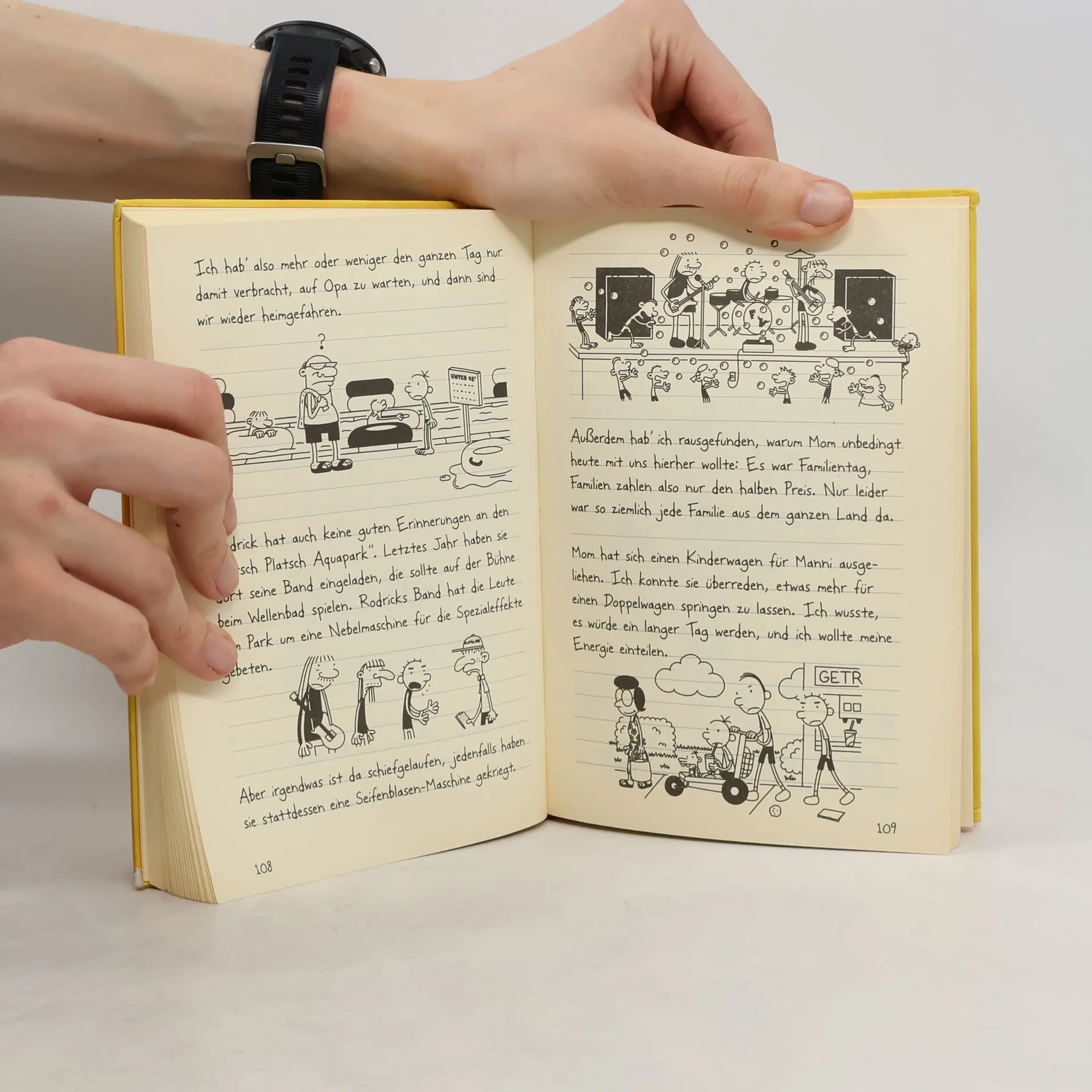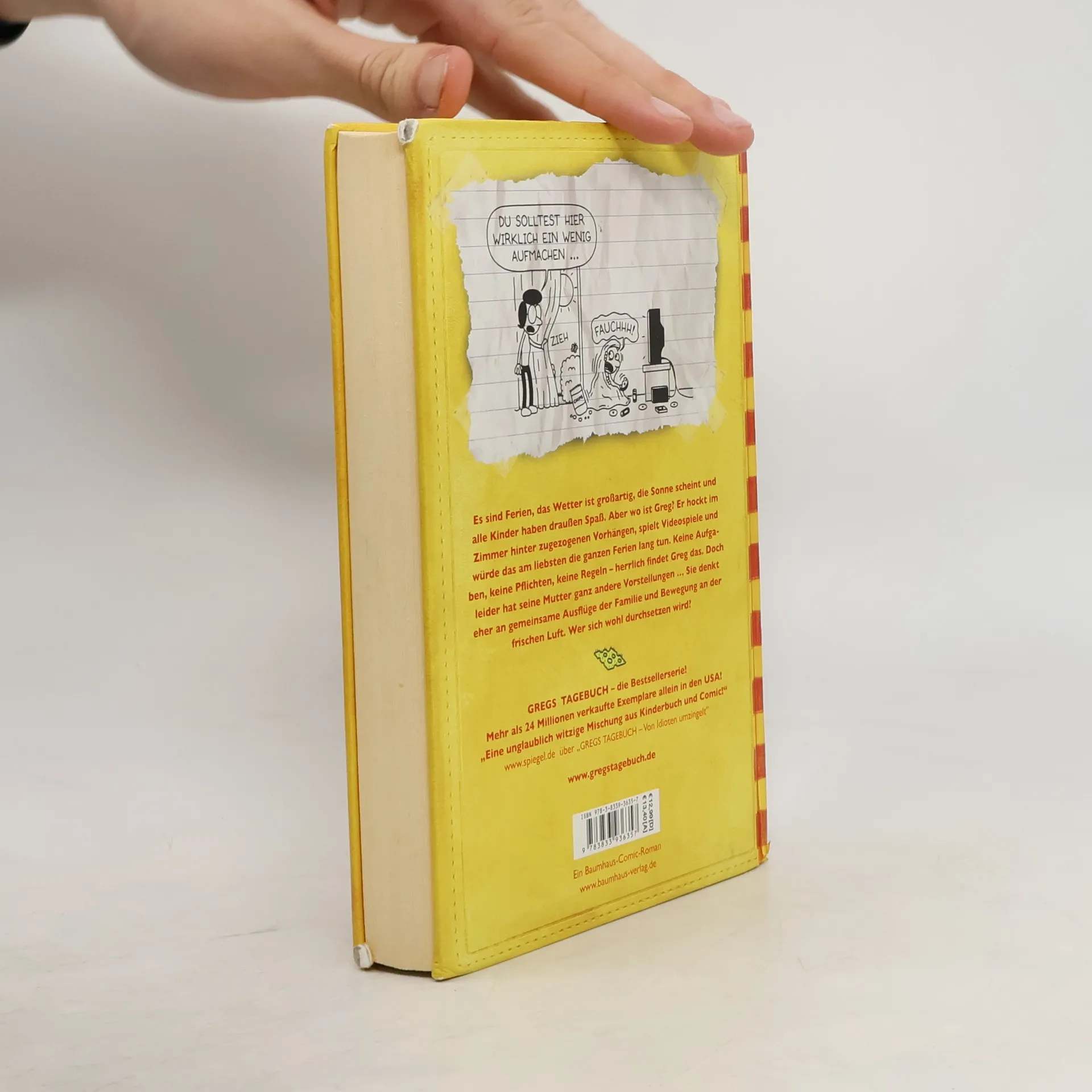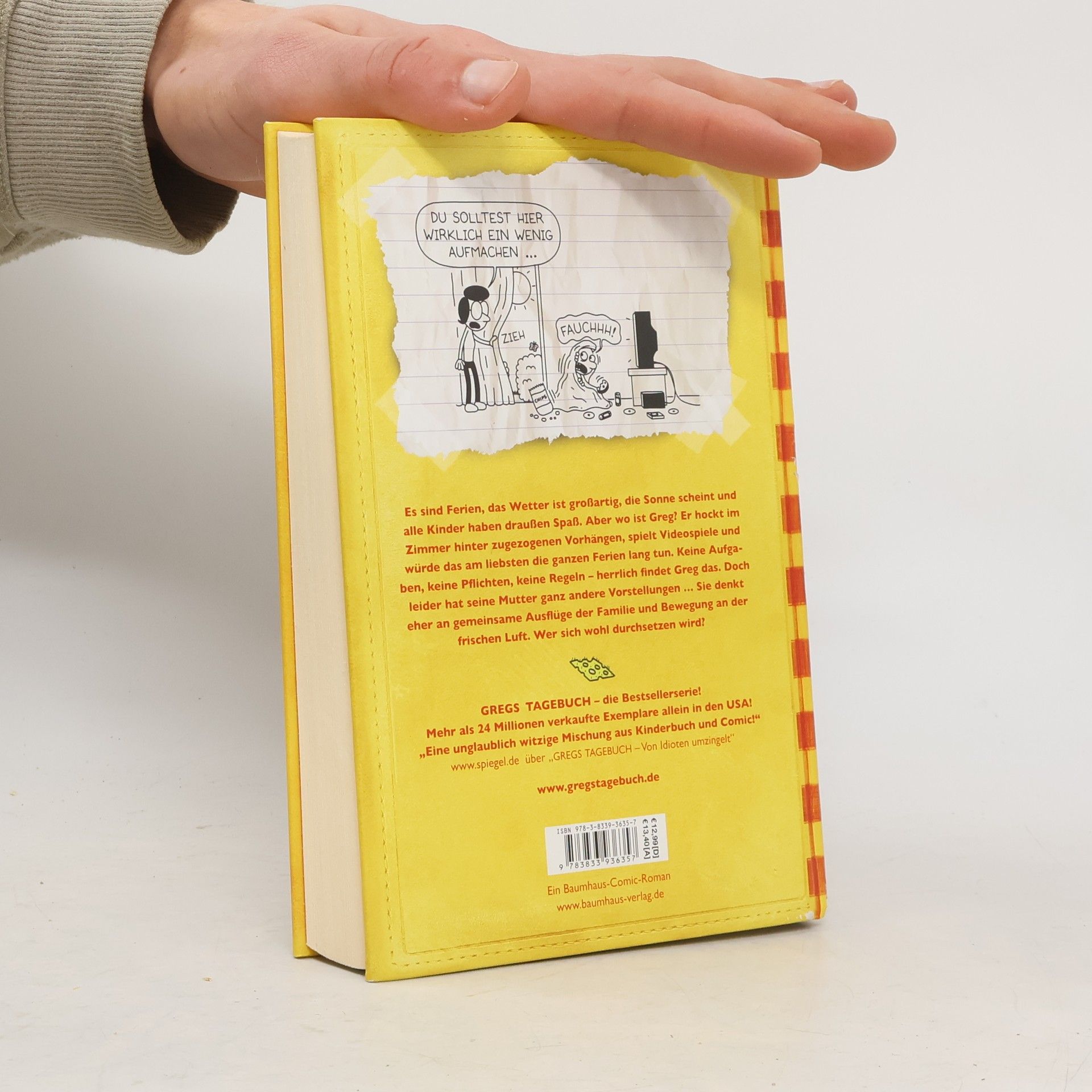 "Es sind Ferien, das Wetter ist großartig, die Sonne scheint und alle Kinder haben draußen Spaß. Aber wo ist Greg? Er hockt im Zimmer hinter zugezogenen Vorhängen, spielt Videospiele und würde das am liebsten die ganzen Ferien lang tun. Keine Aufgaben, keine Pflichten, keine Regeln - herrlich findet Greg das. Doch leider hat seine Mutter ganz andere Vorstellungen ... Sie denkt eher an gemeinsame Ausflüge mit der Familie und Bewegung an der frischen Luft. Wer sich wohl durchsetzen wird?" (Verlagsangabe)