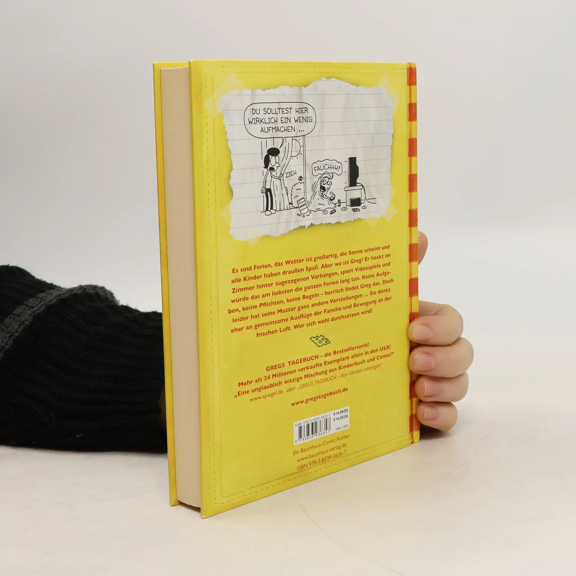 "Es sind Ferien, das Wetter ist großartig, die Sonne scheint und alle Kinder haben draußen Spaß. Aber wo ist Greg? Er hockt im Zimmer hinter zugezogenen Vorhängen, spielt Videospiele und würde das am liebsten die ganzen Ferien lang tun. Keine Aufgaben, keine Pflichten, keine Regeln - herrlich findet Greg das. Doch leider hat seine Mutter ganz andere Vorstellungen ... Sie denkt eher an gemeinsame Ausflüge mit der Familie und Bewegung an der frischen Luft. Wer sich wohl durchsetzen wird?" (Verlagsangabe)