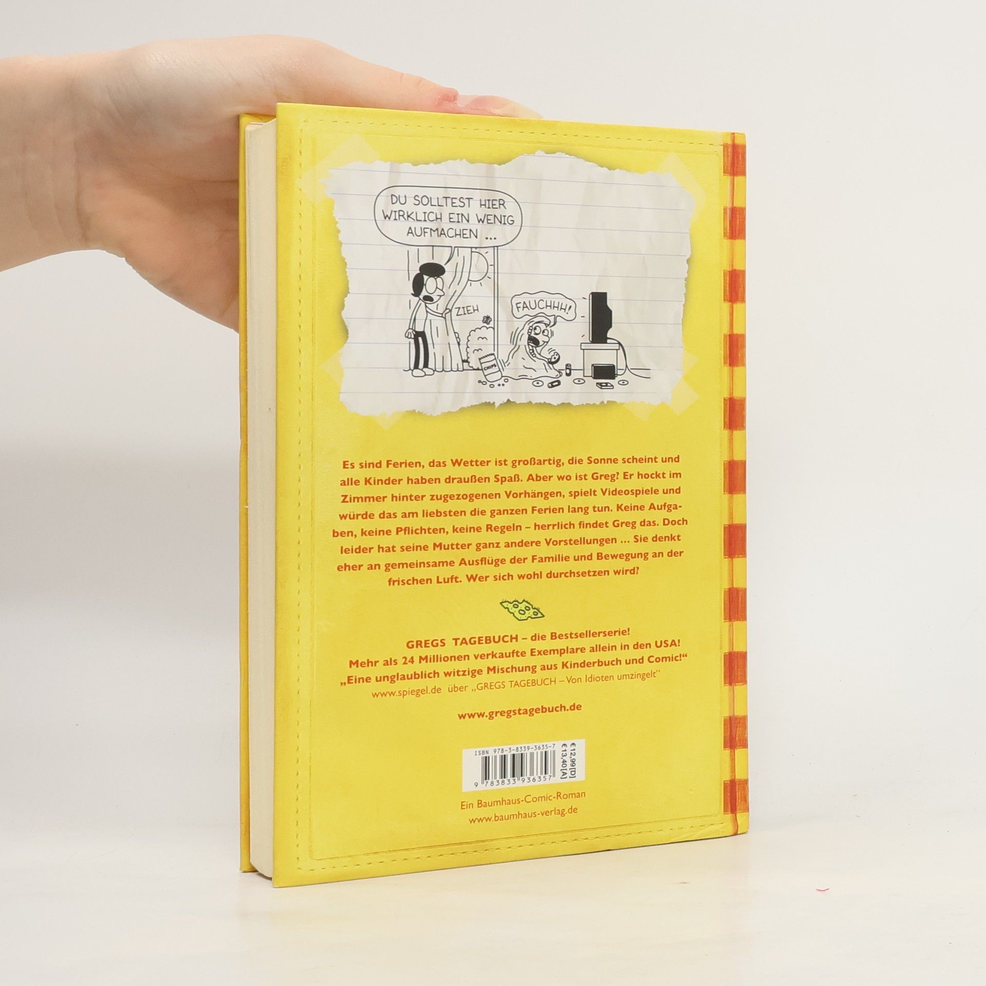 "Es sind Ferien, das Wetter ist großartig, die Sonne scheint und alle Kinder haben draußen Spaß. Aber wo ist Greg? Er hockt im Zimmer hinter zugezogenen Vorhängen, spielt Videospiele und würde das am liebsten die ganzen Ferien lang tun. Keine Aufgaben, keine Pflichten, keine Regeln - herrlich findet Greg das. Doch leider hat seine Mutter ganz andere Vorstellungen ... Sie denkt eher an gemeinsame Ausflüge mit der Familie und Bewegung an der frischen Luft. Wer sich wohl durchsetzen wird?" (Verlagsangabe)