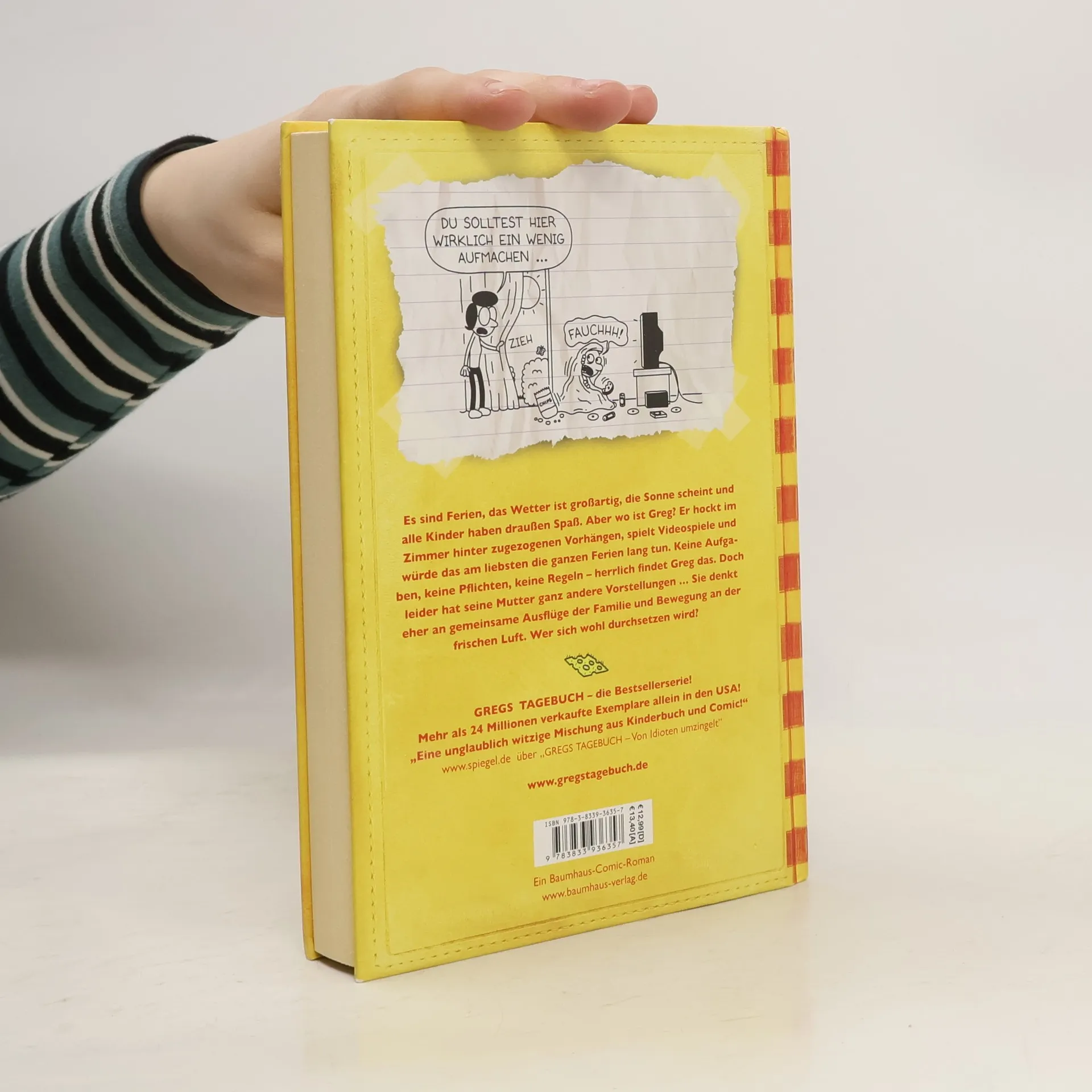 "Es sind Ferien, das Wetter ist großartig, die Sonne scheint und alle Kinder haben draußen Spaß. Aber wo ist Greg? Er hockt im Zimmer hinter zugezogenen Vorhängen, spielt Videospiele und würde das am liebsten die ganzen Ferien lang tun. Keine Aufgaben, keine Pflichten, keine Regeln - herrlich findet Greg das. Doch leider hat seine Mutter ganz andere Vorstellungen ... Sie denkt eher an gemeinsame Ausflüge mit der Familie und Bewegung an der frischen Luft. Wer sich wohl durchsetzen wird?" (Verlagsangabe)