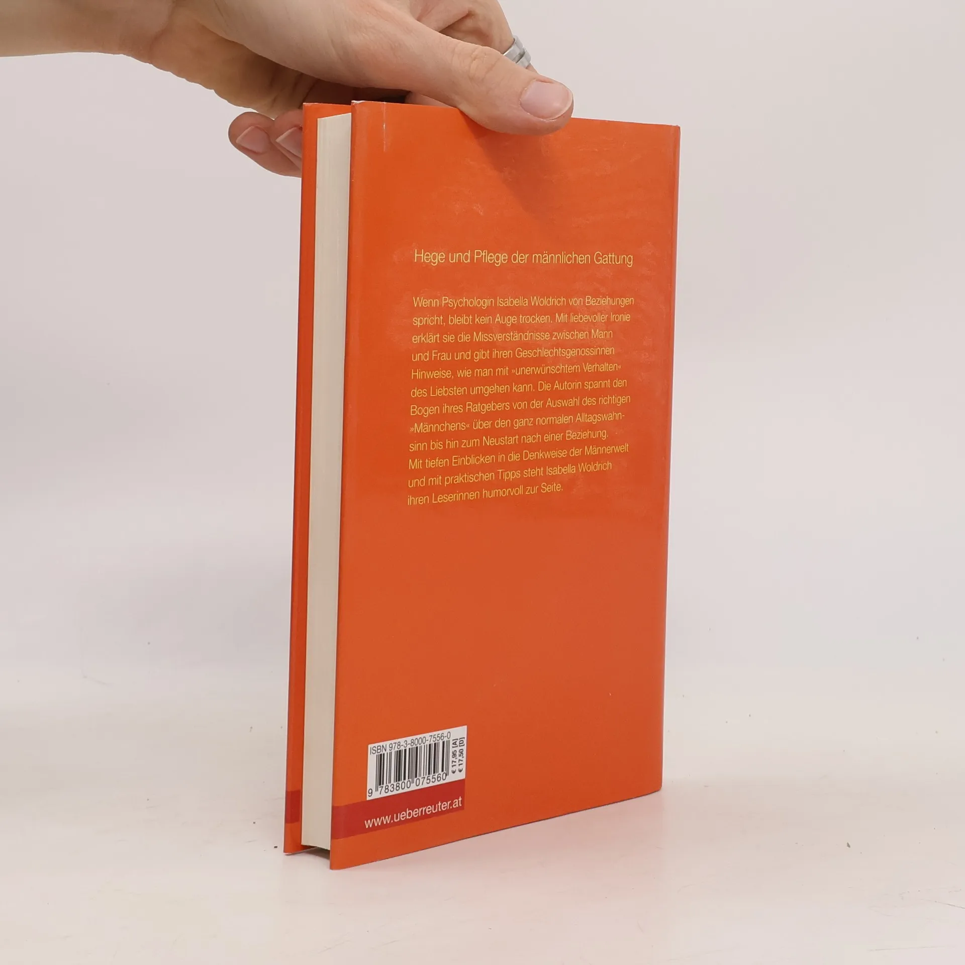 Hege und Pflege der männlichen Gattung -Wenn Psychologin Isabella Woldrich von Beziehungen spricht, bleibt kein Auge trocken. Mit liebevoller Ironie erklärt sie die Missverständnisse zwischen Mann und Frau und gibt ihren Geschlechtsgenossinnen Hinweise, wie man mit "unerwünschtem Verhalten" des Liebsten umgehen kann. Die Autorin spannt den Bogen ihres Ratgebers von der Auswahl des richtigen "Männchens" über den ganz normalen Alltagswahnsinn bis hin zum Neustart nach einer Beziehung. Mit tiefen Einblicken in die Denkweise der Männerwelt und mit praktischen Tipps steht Isabella Woldrich ihren Leserinnen humorvoll zur Seite.
