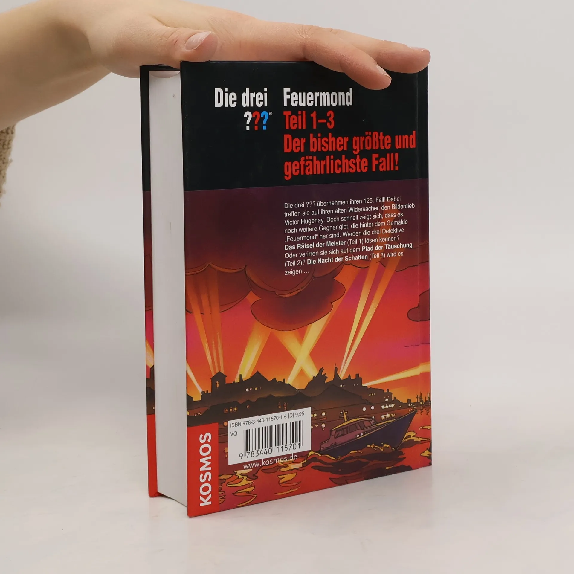 Die drei ??? übernehmen ihren 125. Fall! Dabei treffen sie auf ihren alten Widersacher, den Bilderdieb Victor Hugenay. Doch schnell zeigt sich, dass es noch weitere Gegner gibt, die hinter dem Gemälde „Feuermond“ her sind. Werden die drei Detektive „Das Rätsel der Meister“ (Teil 1) lösen können? Oder verirren sie sich auf dem „Pfad der Täuschung“ (Teil 2)? „Die Nacht der Schatten“ (Teil 3) wird es zeigen.
