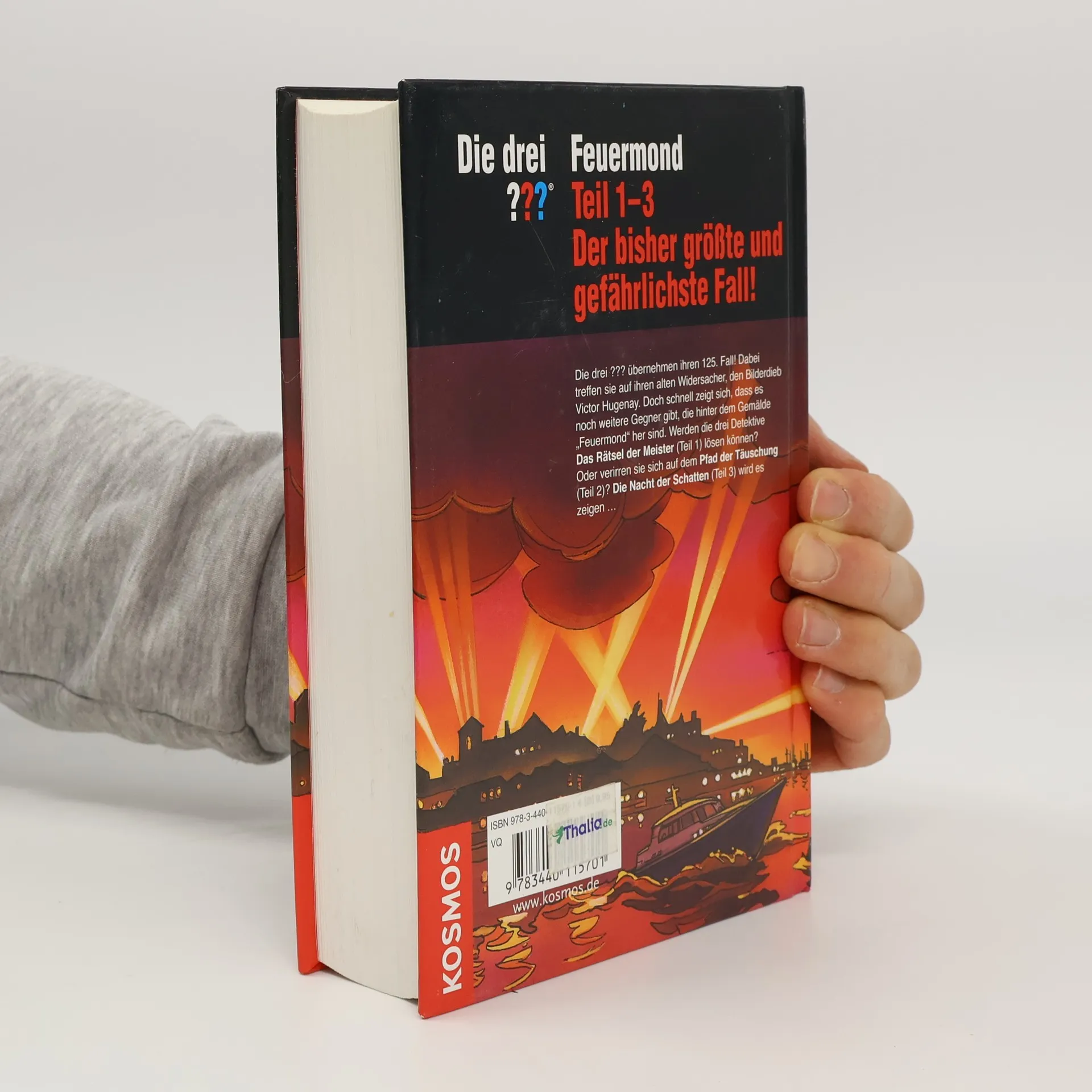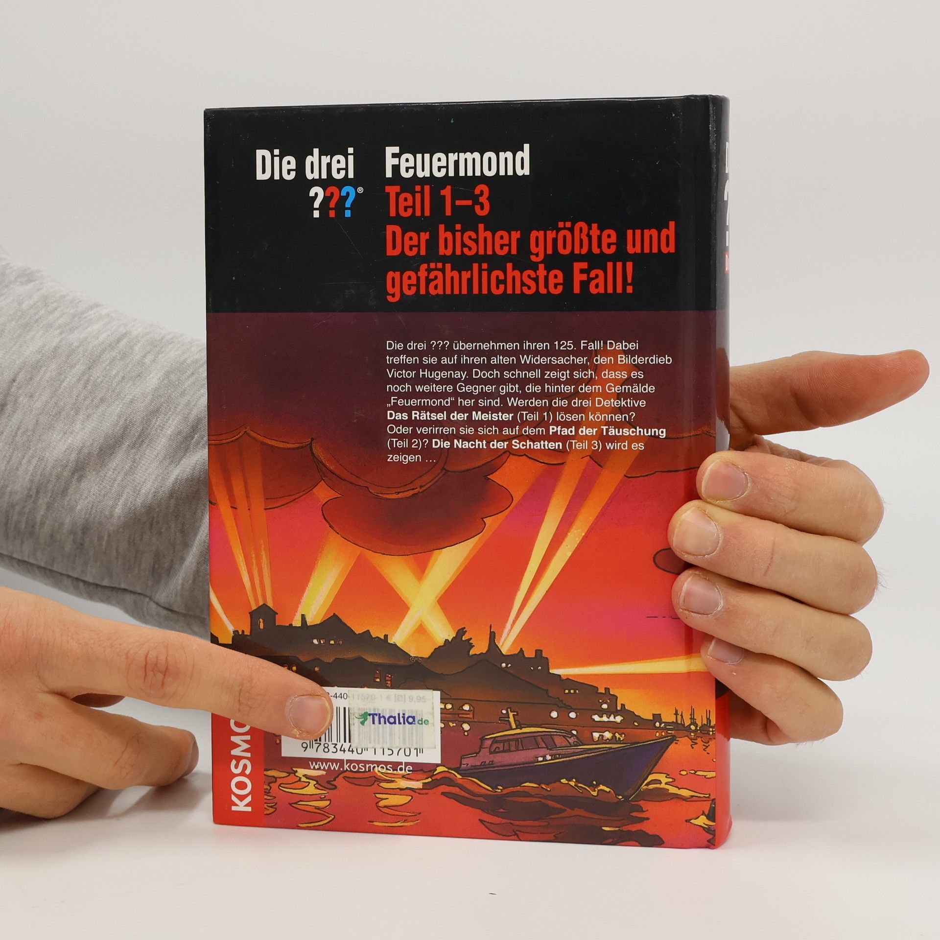 Die drei ??? übernehmen ihren 125. Fall! Dabei treffen sie auf ihren alten Widersacher, den Bilderdieb Victor Hugenay. Doch schnell zeigt sich, dass es noch weitere Gegner gibt, die hinter dem Gemälde „Feuermond“ her sind. Werden die drei Detektive „Das Rätsel der Meister“ (Teil 1) lösen können? Oder verirren sie sich auf dem „Pfad der Täuschung“ (Teil 2)? „Die Nacht der Schatten“ (Teil 3) wird es zeigen.