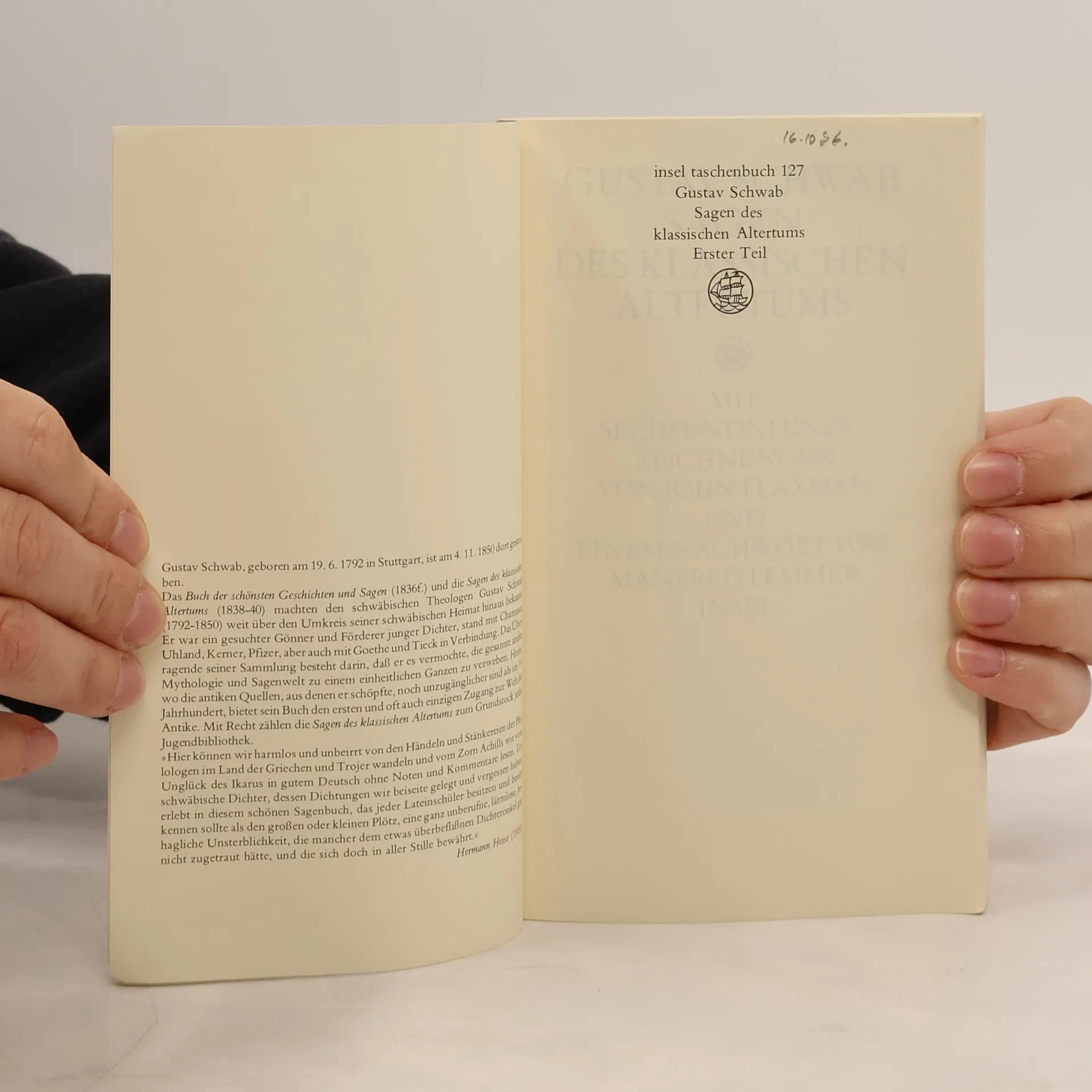 Der Stuttgarter Theologe Gustav Schwab (1792 – 1850) wurde durch das Buch der schönsten Geschichten und Sagen und durch die »Sagen des klassischen Altertums« weit über den Umkreis seiner schwäbischen Heimat hinaus bekannt. Er war ein Gönner und Förderer junger Dichter, stand mit Chamisso, Uhland, Kerner, aber auch mit Goethe und Tieck in Verbindung. Das Überragende seiner Sammlung besteht darin, daß er es vermochte, die gesamte antike Mythologie und Sagenwelt zu einem einheitlichen Ganzen zu verweben. Schwab hat die verschiedensten Quellen zusammengetragen und es ist ihm gelungen, aus Stoffen unterschiedlicher Herkunft eine gerundete und einprägsame Darstellung zu schaffen, die in dieser Art einzig ist. Schwabs Sammlung der griechischen Sagen hat seit ihrem ersten Erscheinen das Wissen über griechische Mythologie bereichert und unser Bild der Antike maßgeblich geprägt. Die »Sagen des klassischen Altertums« bieten noch immer einen einzigartigen Zugang zur Welt der Antike.