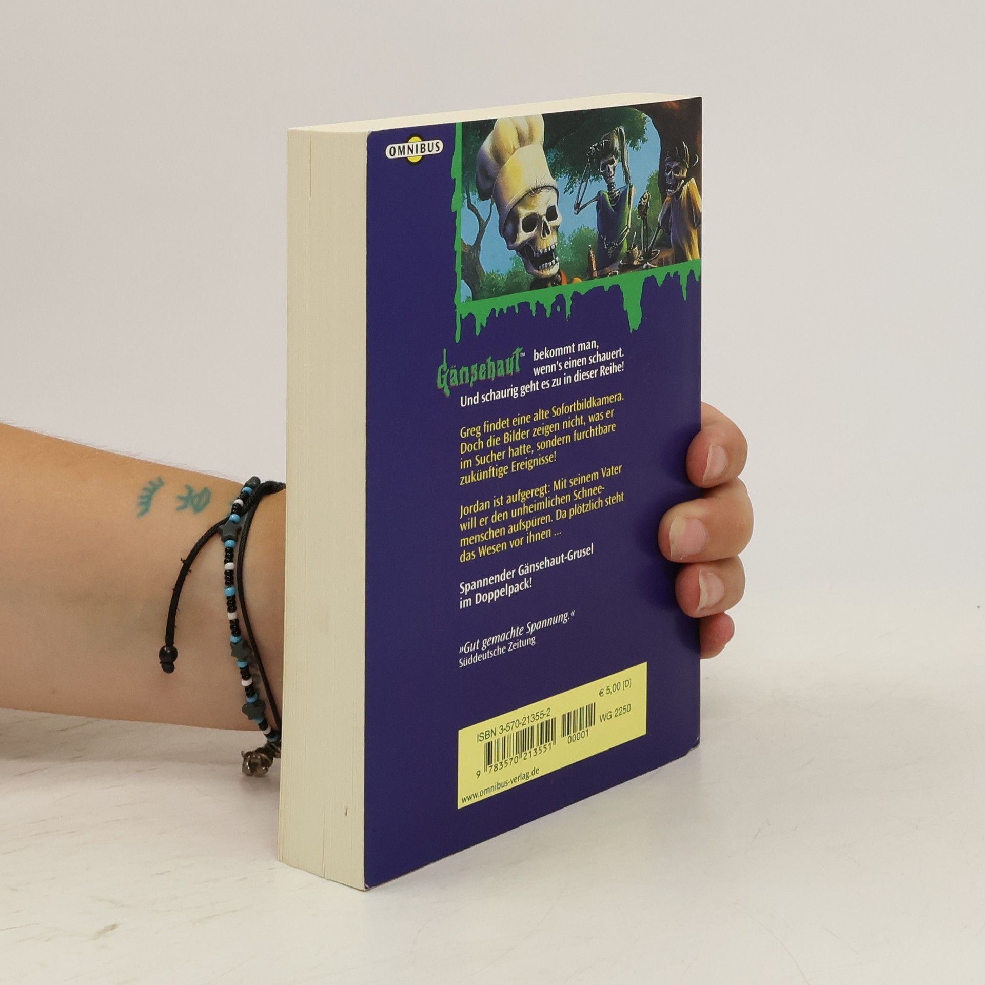 Enthält die Gänsehaut-Einzelbände 'Die unheimliche Kamera' (Band 15) und '… der Schneemensch geht um' (Band 16) 'Die unheimliche Kamera' Eine Kamera mit unheimlichen Kräften bringt Greg in tödliche Gefahr. Beim heimlichen Stöbern in einem unbewohnten Haus findet Greg eine Sofortbildkamera. Doch seltsamer Weise bilden die Photos nicht das ab, was er sah, als er den Auslöser drückte. Sein Entsetzten wächst, als die auf den Photos dargestellten Situationen auf gespenstische Weise Wirklichkeit werden. Ist da Magie im Spiel? '… der Schneemensch geht um' Jordan und seine Schwester Nicole haben das sonnige Wetter in Kalifornien satt! Einmal im Leben wollen sie Schnee sehen! Als ihr Vater nach Alaska aufbricht, um den geheimnisvollen Schneemenschen zu suchen, dürfen die beiden ihn begleiten. Bald werden aus den Jägern Gejagte…