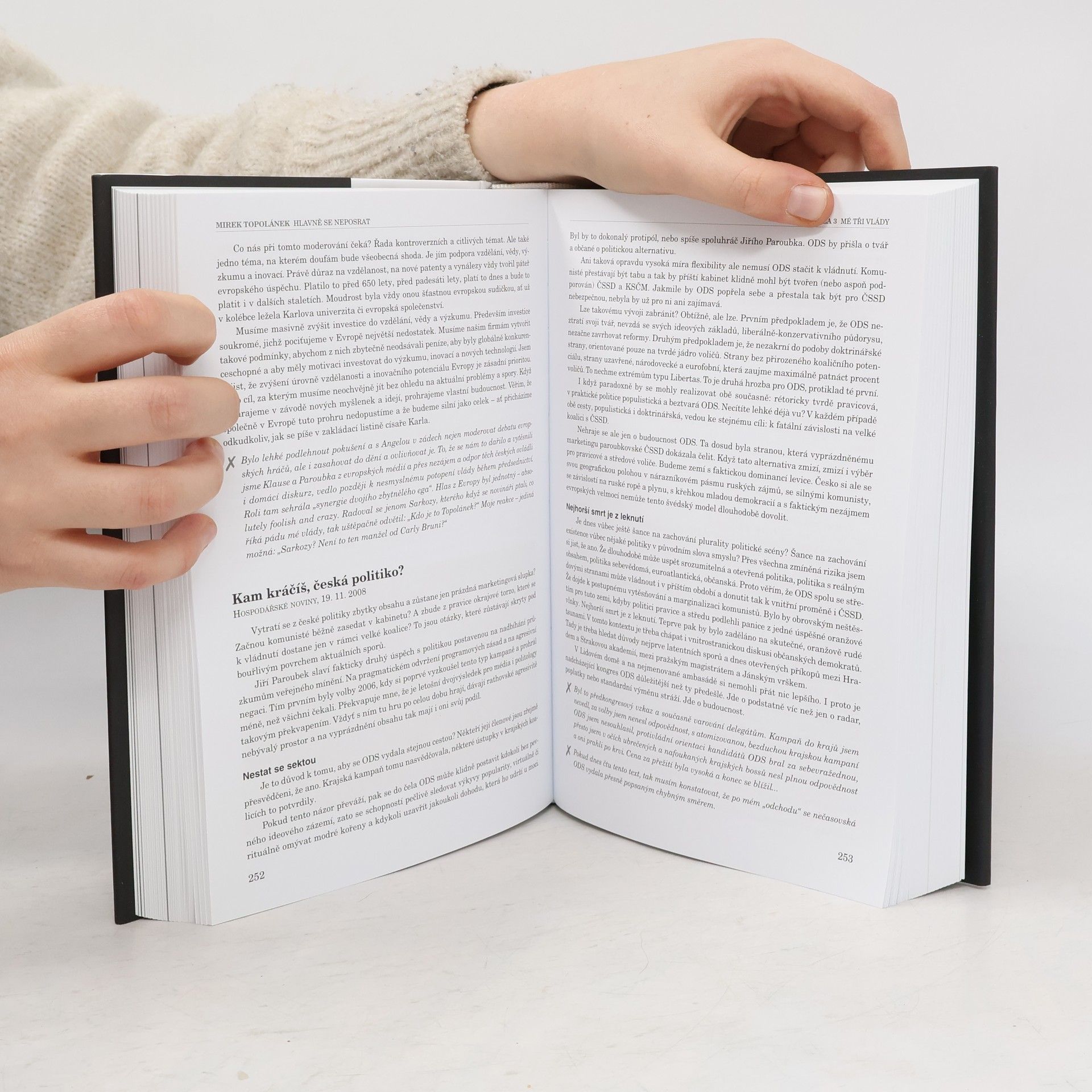 Nikdy jsem neměl potřebu sám sebe stylizovat, přetvařovat se, žít a mluvit jinak doma, v práci, na veřejnosti. Před autoritami jsem se neklaněl a poraženým se nemstil. Naučil jsem se odpouštět. Byla to určitě politická nevýhoda. Pro život je to ale lepší. Možná jsem mohl být v politice déle, nebo být úspěšnější. Já jsem ale rád, že mě pořád baví život, lidi, které potkávám. A když se dívám zpátky, tak hodnotím tu svou politickou kariéru bez hořkosti a s hlavou nahoře. M. Topolánek