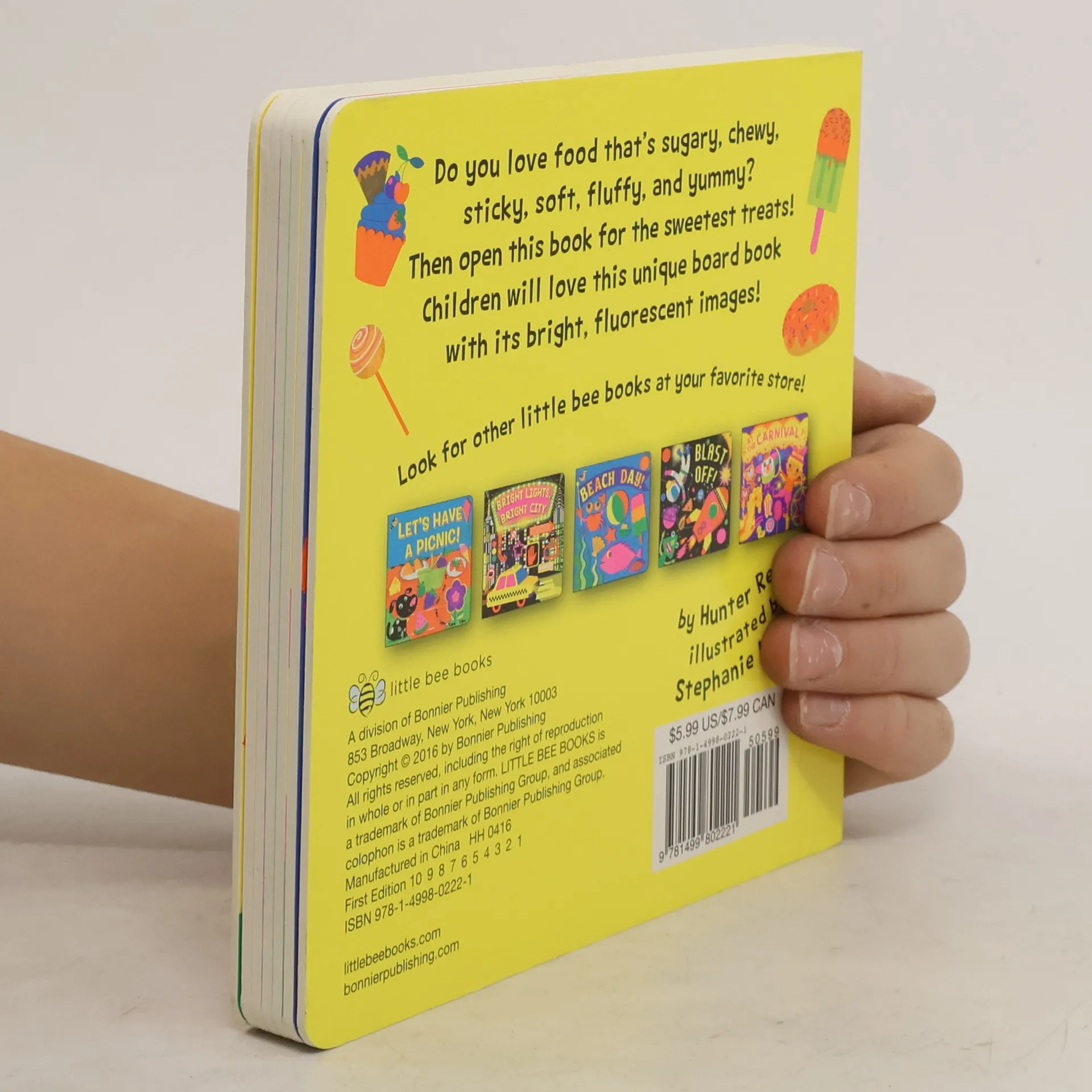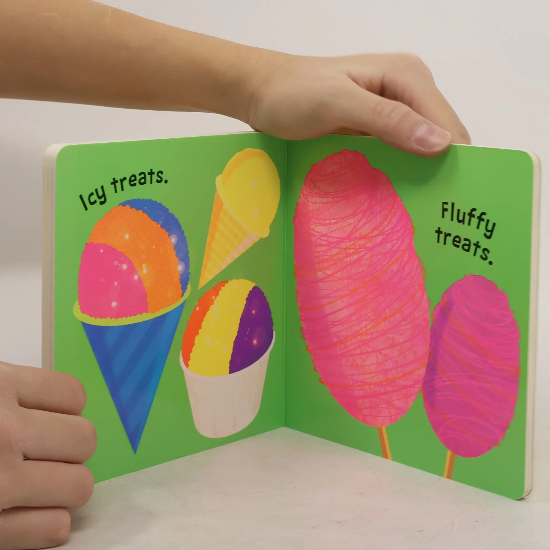 A unique board book with bright, fluorescent images of sweet treats! It’s time to eat the sweetest treats! There are all types of sugary, chewy, sticky, soft, fluffy, and yummy fluorescent foods featured in this book, including jellybeans, cupcakes, ice cream, lollipops, snow cones, gummy worms, and much more! The scenes are accompanied by simple, descriptive phrases on each page. With bright, fluorescent colors, this book is sure to catch children's and parents' eyes!