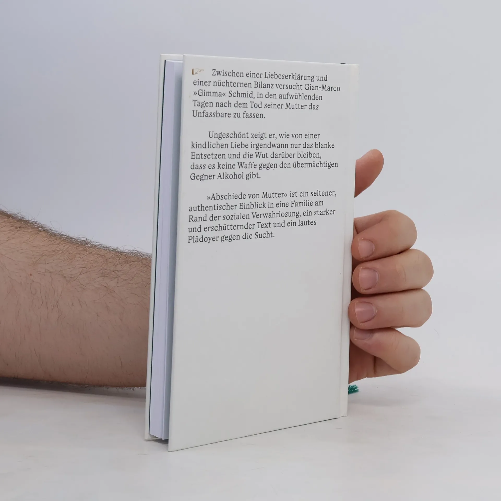 Der wiederholte Abschied von seiner Mutter in den aufwühlenden Tagen nach ihrem Tod ist Gian-Marco Schmids Fokus in seinem schonungslosen, aber feinfühligen autobiografischen Text. Zwischen einer Liebeserklärung und einer Bilanz versucht »Abschiede von Mutter« das Unfassbare zu fassen. Schmid wählt dafür die Form eines akribischen Tagebuchs sowie Rückblenden auf markante Momente zwischen seiner Mutter und ihm. Ungeschönt zeigt er wie von einer naiven Liebe als Kind irgendwann nur das blanke Entsetzen und die Wut darüber bleiben, dass es keine Waffe gegen den übermächtigen Gegner Alkohol gibt. »Abschiede von Mutter« ist ein seltener, authentischer Einblick in eine Familie am Rand der sozialen Verwahrlosung, ein starker und erschütternder Text und ein lautes Plädoyer gegen die Sucht.