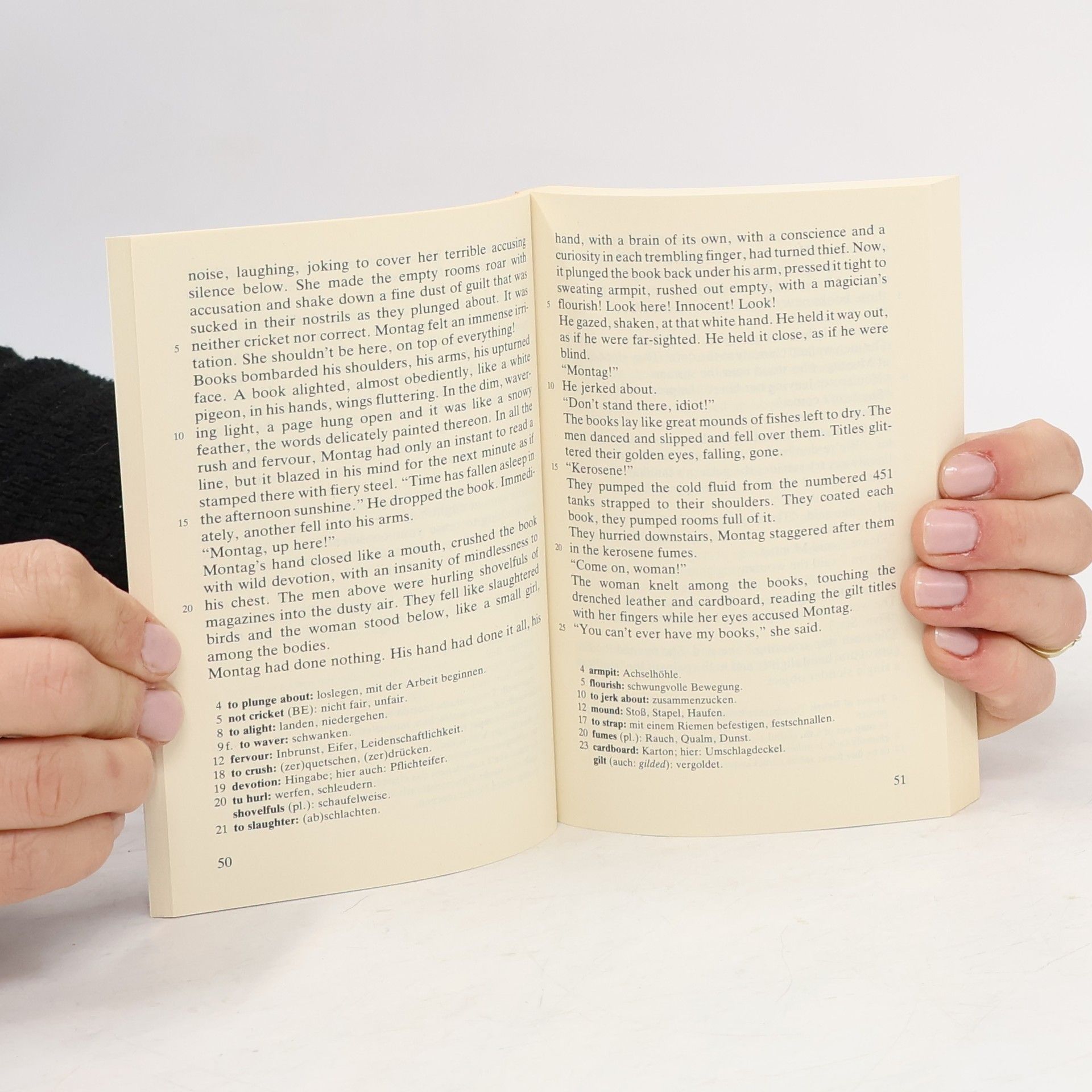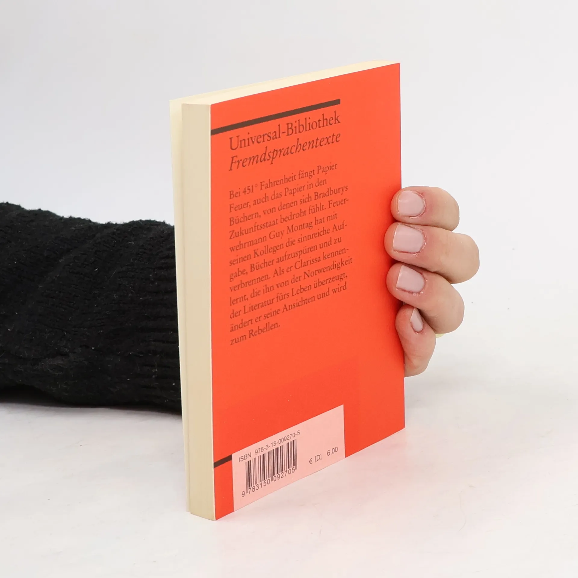 Englische Literatur in Reclams Roter Reihe: das ist der englische Originaltext – ungekürzt und unbearbeitet mit Worterklärungen am Fuß jeder Seite, Nachwort und Literaturhinweisen. Bei 451 Grad Fahrenheit fängt Papier Feuer, auch das Papier in den Büchern, von denen sich Bradburys Zukunftsstaat bedroht fühlt. Feuerwehrmann Guy Montag hat mit seinen Kollegen die Aufgabe, Bücher aufzuspüren und zu verbrennen. Als er Clarissa kennen lernt, die ihn davon überzeugt, dass Literatur fürs Leben nötig ist, ändert er seine Ansichten – und wird zum Rebellen. Englische Lektüre: Niveau B2 (GER) Sprachen: Englisch, Deutsch