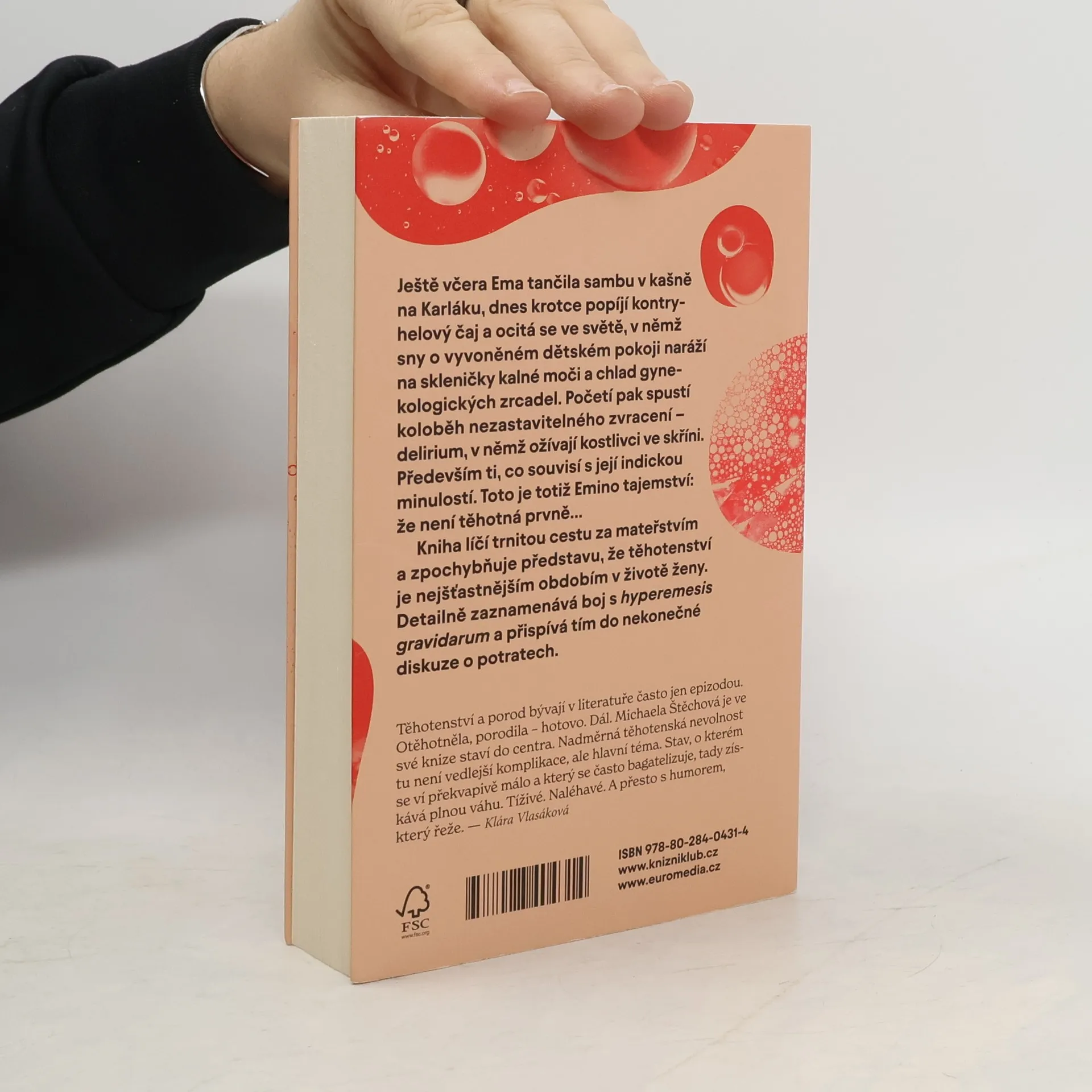 Ještě včera Ema tančila sambu v kašně na Karláku, dnes krotce popíjí kontryhelový čaj a ocitá se ve světě, v němž sny o vyvoněném dětském pokoji naráží na skleničky kalné moči a chlad gynekologických zrcadel. Početí pak spustí koloběh nezastavitelného zvracení – delirium, v němž ožívají kostlivci ve skříni. Především ti, co souvisí s její indickou minulostí. Toto je totiž Emino tajemství: že není těhotná prvně… Kniha líčí trnitou cestu za mateřstvím a zpochybňuje představu, že těhotenství je nejšťastnějším obdobím v životě ženy. Detailně zaznamenává boj s hyperemesis gravidarum a přispívá tím do nekonečné diskuze o potratech.