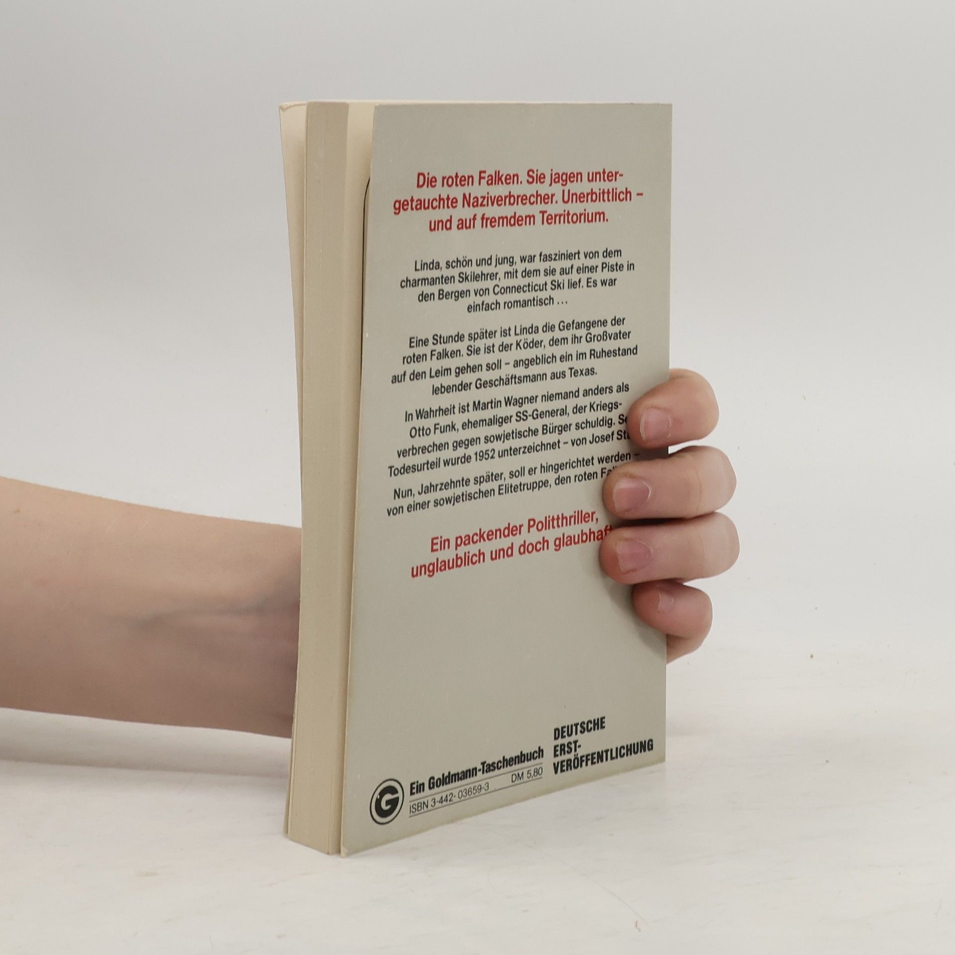 Die roten Falken. Sie jagen untergetauchte Naziverbrecher. Unerbittlich - und auf fremdem Territorium. Linda, schön und jung, war fasziniert von dem charmanten Skilehrer, mit dem sie auf einer Piste in den Bergen von Connecticut Ski lief. Es war einfach romantisch... Eine Stunde später ist Linda die Gefangene der roten Falken. Sie ist der Köder, dem ihr Großvater auf den Leim gehen soll - angeblich ein im Ruhestand lebender Geschäftsmann aus Texas. In Wahrheit ist Martin Wagner niemand anders als Otto Funk, ehemaliger SS-General, der Kriegsverbrechen gegen sowjetische Bürger schuldig. Sein Todesurteil wurde 1952 unterzeichnet - von Josef Stalin. Nun, Jahrzehnte später, soll er hingerichtet werden - von einer sowjetischen Elitetruppe, den roten Falken... Ein packender Politthriller, unglaublich und doch glaubhaft.