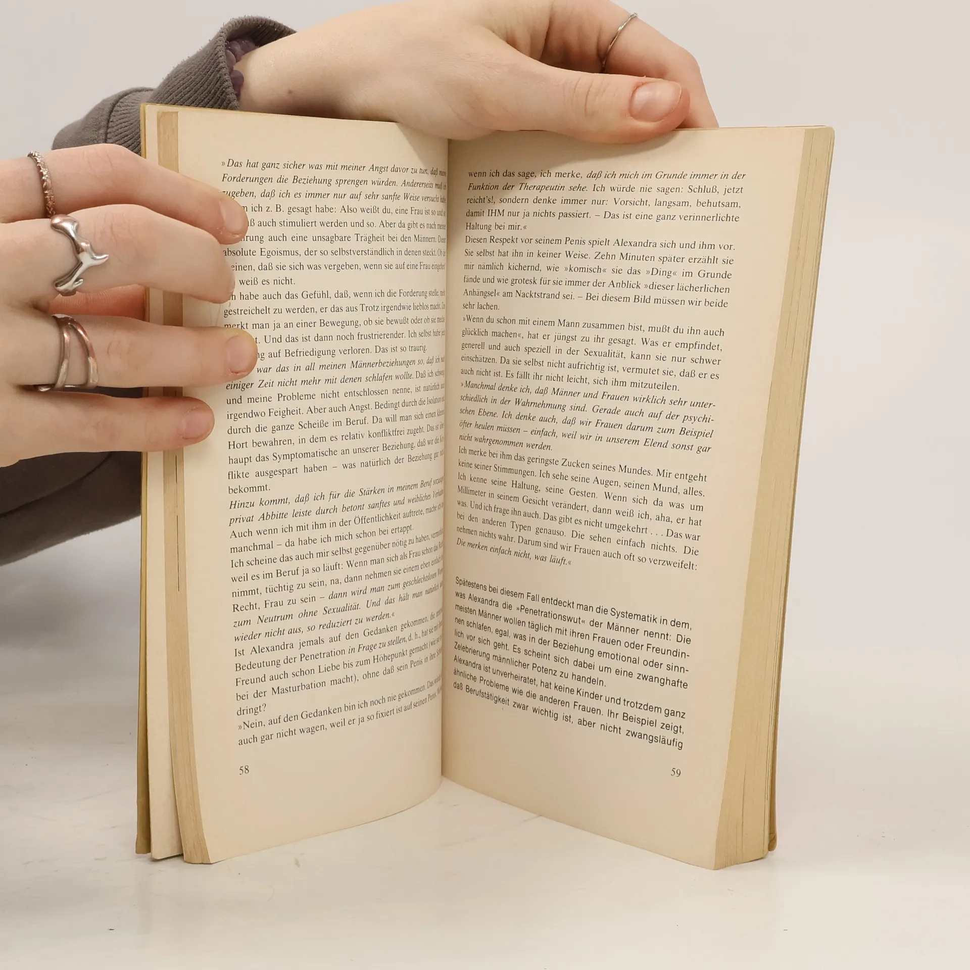 Frauen reden über sich: Karrierefrauen, Hausfrauen, Prostituierte, Heterosexuelle, Homosexuelle und Frigide. Ihre Aussagen brechen den Terror der öffentlichen Lüge von "erfüllter Weiblichkeit". Frauen erkennen, dass sie nicht die Ausnahme sind, sondern dass es "typisch" ist, frigide zu sein und an Identität, Ehrgeiz und Selbstvertrauen zu fehlen. Es wird thematisiert, dass Frauen oft aus "Liebe" mit Männern schlafen, weil es erwartet wird oder aus Angst, selten jedoch aus Lust. Die Rolle der Sexualität bei der Verurteilung zur "Weiblichkeit" wird untersucht. Die Sexwelle hat den Druck herrschender Normen für Frauen nicht gelockert, sondern neue Normen verschärft. Die Ideologie des "kleinen Unterschieds" gibt Männern das Sexmonopol und damit auch das emotionale, soziale und ökonomische Monopol über Frauen. Frauen werden nicht als eigenständige Wesen betrachtet, sondern als Ergänzung zum Mann. Alice Schwarzer betont die Notwendigkeit, weibliche Ohnmacht und männliche Macht anzuerkennen und den Mythos vom vaginalen Orgasmus zu entlarven. Frauen müssen ihre Bedürfnisse erforschen und aussprechen, während sie das Recht auf Verweigerung verstehen. Das Buch bietet nicht nur eine Analyse des Frauenelends, sondern auch Impulse und Handlungsanweisungen, ohne in neue Normen zu verfallen. Es zeigt Frauenstärke: Emotionalität, Spontaneität und Humor. In einem aktuellen Nachtrag untersucht Schwarzer die Reaktionen der Öffentlichkeit und der