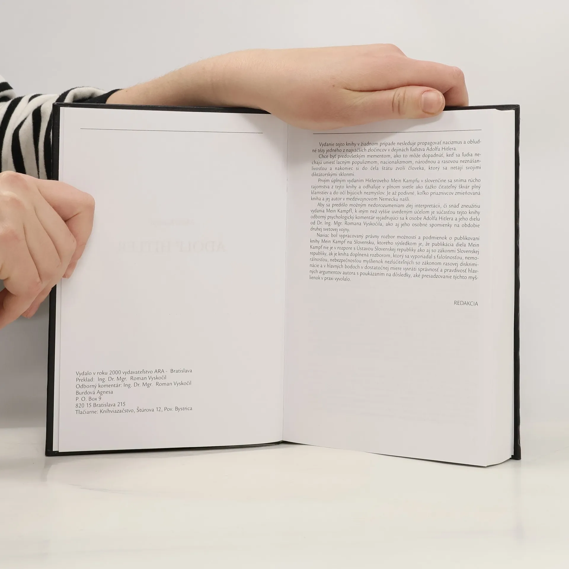 Ako spoločnosť pevne stojíme proti diskriminácii akéhokoľvek druhu. Mein Kampf predstavuje jeden zo základných dokumentov nacistickej ideológie, ktorá v minulosti zapríčinila milióny mŕtvych. Obsahuje mnoho poloprávd a klamstiev, propagandistickú demagógiu a názory nehumánne, rasistické a odporujúce zákonom demokratických štátov. Čitateľ kúpou tejto knihy potvrdzuje, že si je týchto skutočností vedomý a že jej obsah užije výhradne na študijné účely.