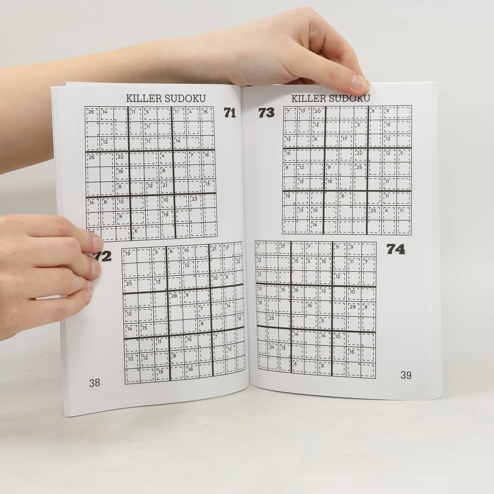 In Killer Sudoku, sub-regions have specified sums, and no number can be repeated within a region. This variant also called "Sums Sudoku", "Sums Number Place", "Samunamupure", "Kikagaku Nampure".