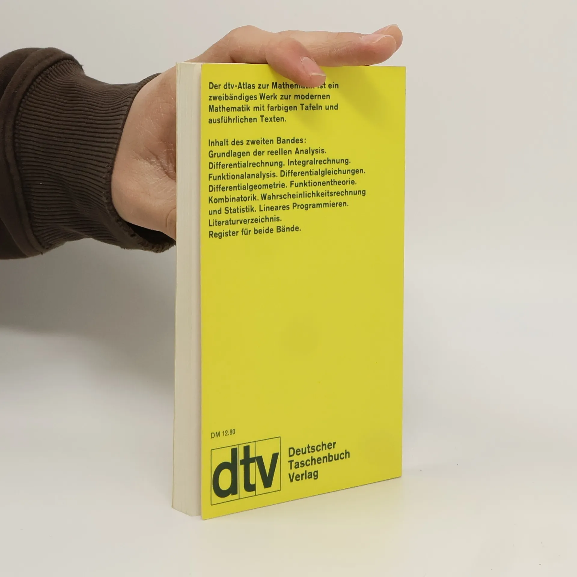 Der ›dtv-Atlas Mathematik‹ gibt in zwei Bänden einen Überblick über den Stand der modernen Mathematik und ihrer Ergebnisse. Die Gliederung geht vom Gesamtbereich der Mathematik aus und enthält alle wesentlichen Teildisziplinen mit den dazugehörigen Theorien. Band 2: Grundlagen der reellen Analysis. Differentialrechnung. Integralrechnung. Funktionalanalysis. Differentialgleichungen. Differentialgeometrie. Funktionstheorie. Kombinatorik. Wahrscheinlichkeitsrechnung und Statistik. Lineare Optimierung.