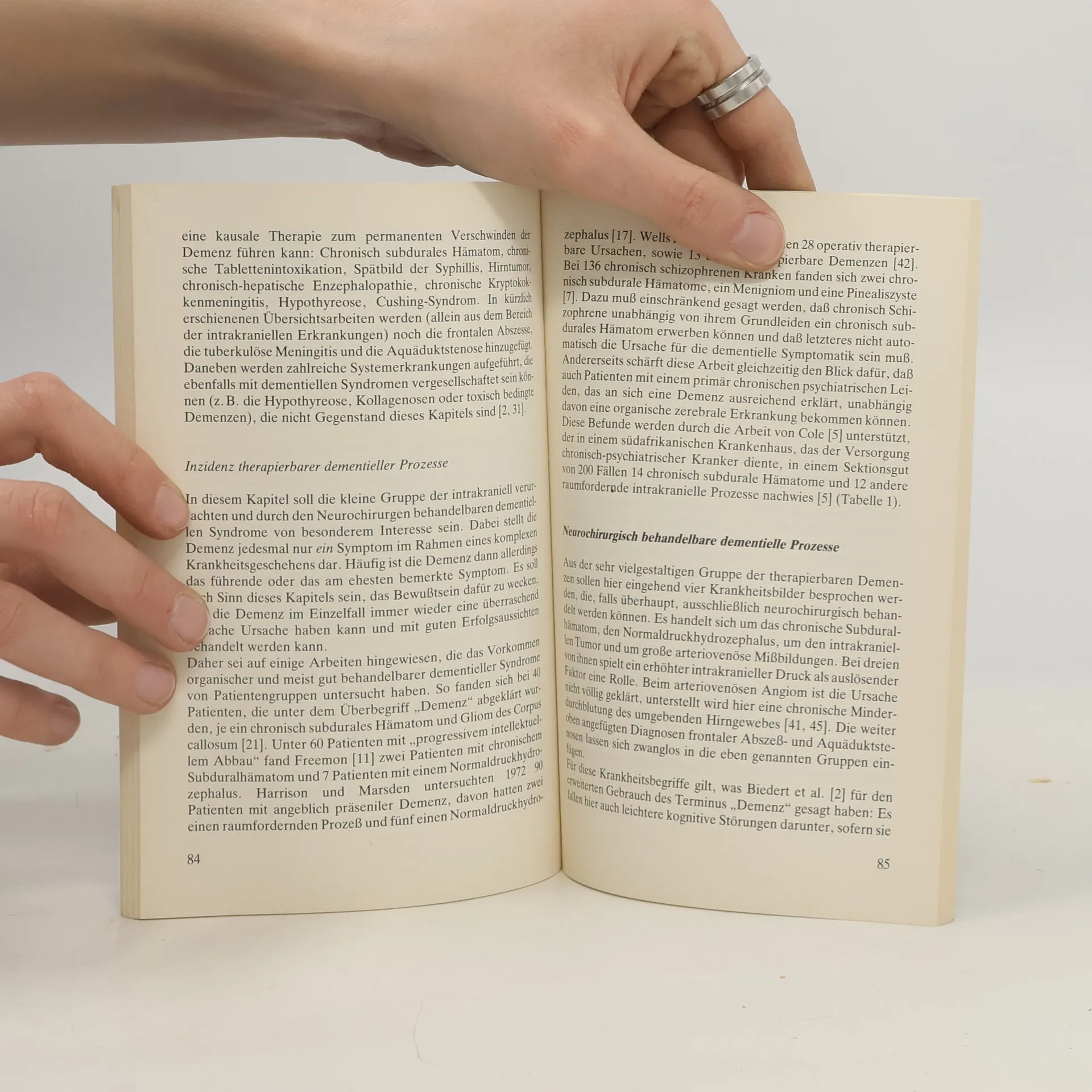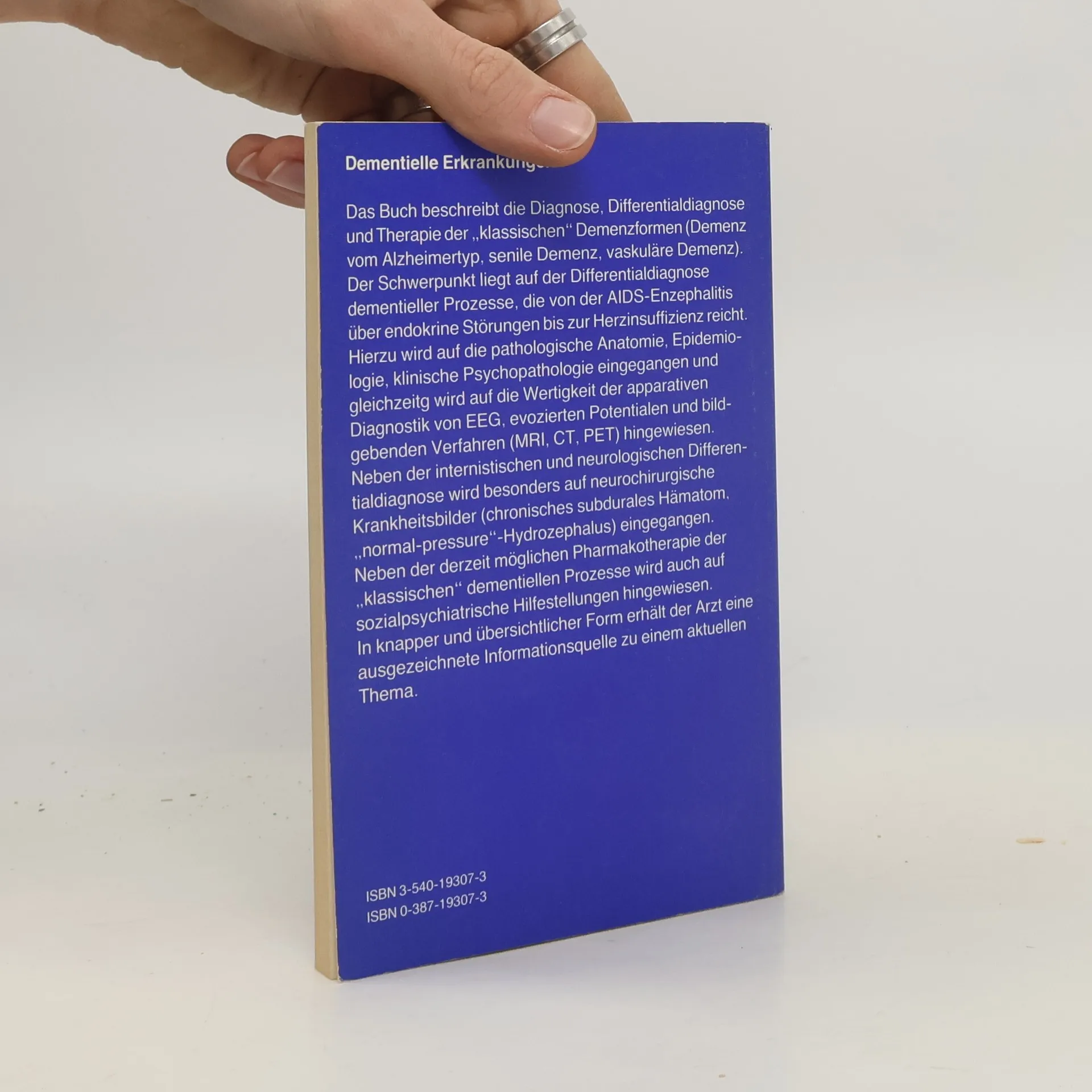 Das Buch beschreibt die Diagnose, Differentialdiagnose und Therapie der "klassischen" Demenzformen (Demenz vom Alzheimertyp, senile Demenz, vaskuläre Demenz). Der Schwerpunkt liegt auf der Differentialdiagnose dementieller Prozesse, die von der AIDS-Enzephalitis über endokrine Störungen bis zur Herzinsuffizienz reicht. Hierzu wird auf die pathologische Anatomie, Epidemiologie, klinische Psychopathologie eingegangen und gleichzeitig wird auf die Wertigkeit der apparativen Diagnostik von EEG und evozierten Potentialen (MRI, CT, PET) hingewiesen. Neben der internistischen und neurologischen Differentialdiagnose wird besonders auf neurochirurgische Krankheitsbilder (chronisches subdurales Hämatom, "normal-pressure"-Hydrozephalus) eingegangen. Neben der derzeit möglichen Pharmakotherapie der "klassischen" dementiellen Prozesse wird auch auf sozialpsychiatrische Hilfestellungen hingewiesen. In knapper und übersichtlicher Form erhält der Arzt eine ausgezeichnete Informationsquelle zu einem aktuellen Thema.