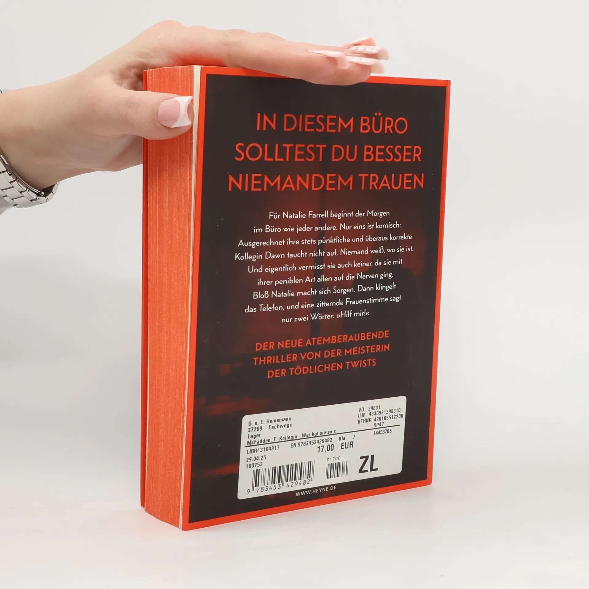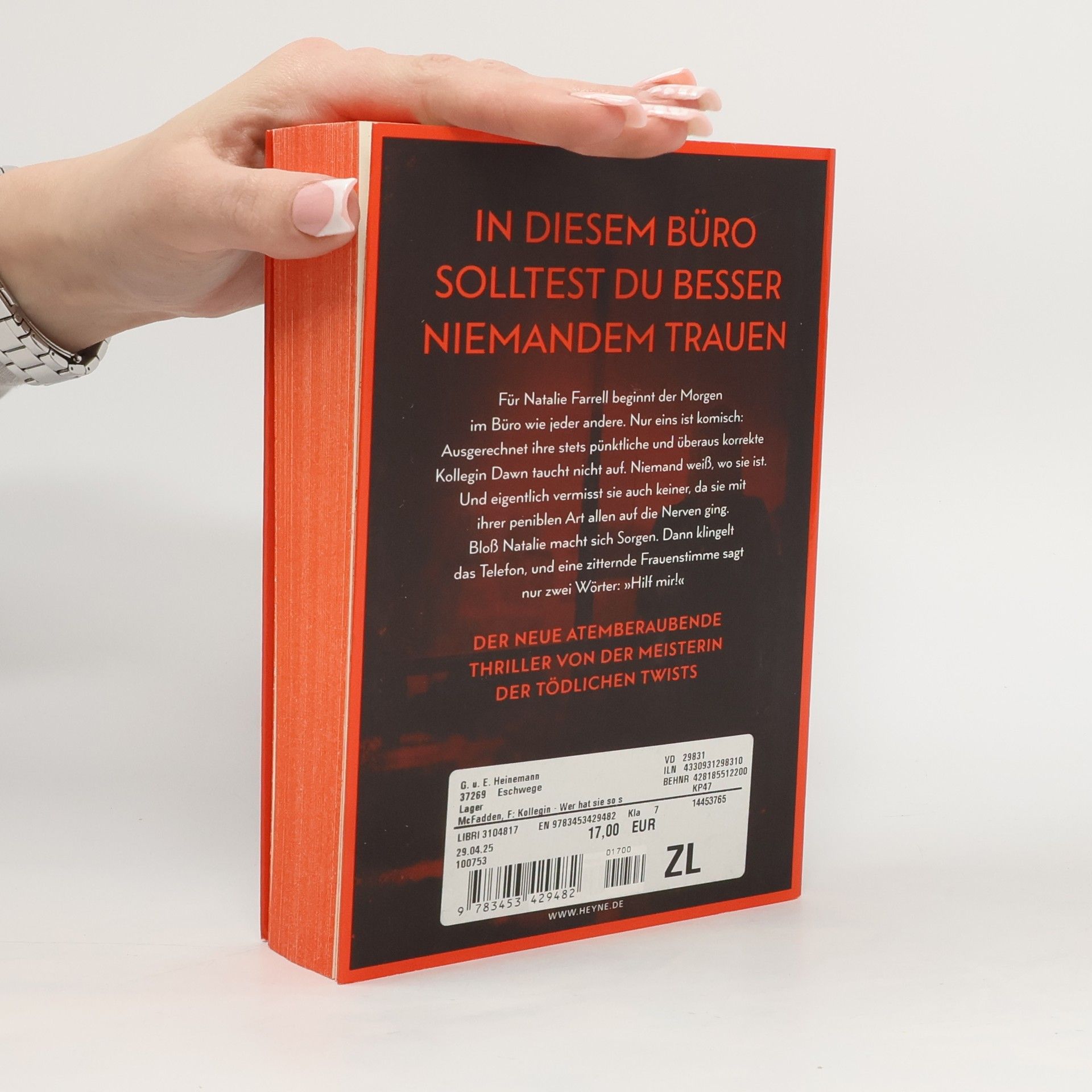 Zwei Frauen. Ein Büro. Ein schreckliches Verbrechen. Mit farbig gestaltetem Buchschnitt in limitierter Erstauflage Dawn Schiff ist seltsam. Darin sind sich ihre Kollegen einig. Sie sagt nie das Richtige. Sie hat keine Freunde. Aber sie ist jeden Morgen um Punkt 8:45 Uhr an ihrem Platz in der Firma, in der sie als Buchhalterin arbeitet. Bis sie eines Morgens nicht auftaucht. Dawns Kollegin Natalie Farrell wundert sich. Dann erhält sie einen anonymen Anruf und fährt zu Dawns Wohnung. Keine Spur von ihrer Kollegin. Doch Natalie bietet sich ein Bild des Grauens. Eins scheint bald klar: Jemand muss Dawn so sehr gehasst haben, dass er sie getötet hat. War es jemand aus ihrem Büro? Je mehr Natalie herausfindet, desto tiefer verstrickt sie sich selbst in ein Netz aus Lügen und Gewalt, aus dem es kein Entkommen gibt. Mit farbig gestaltetem Buchschnitt