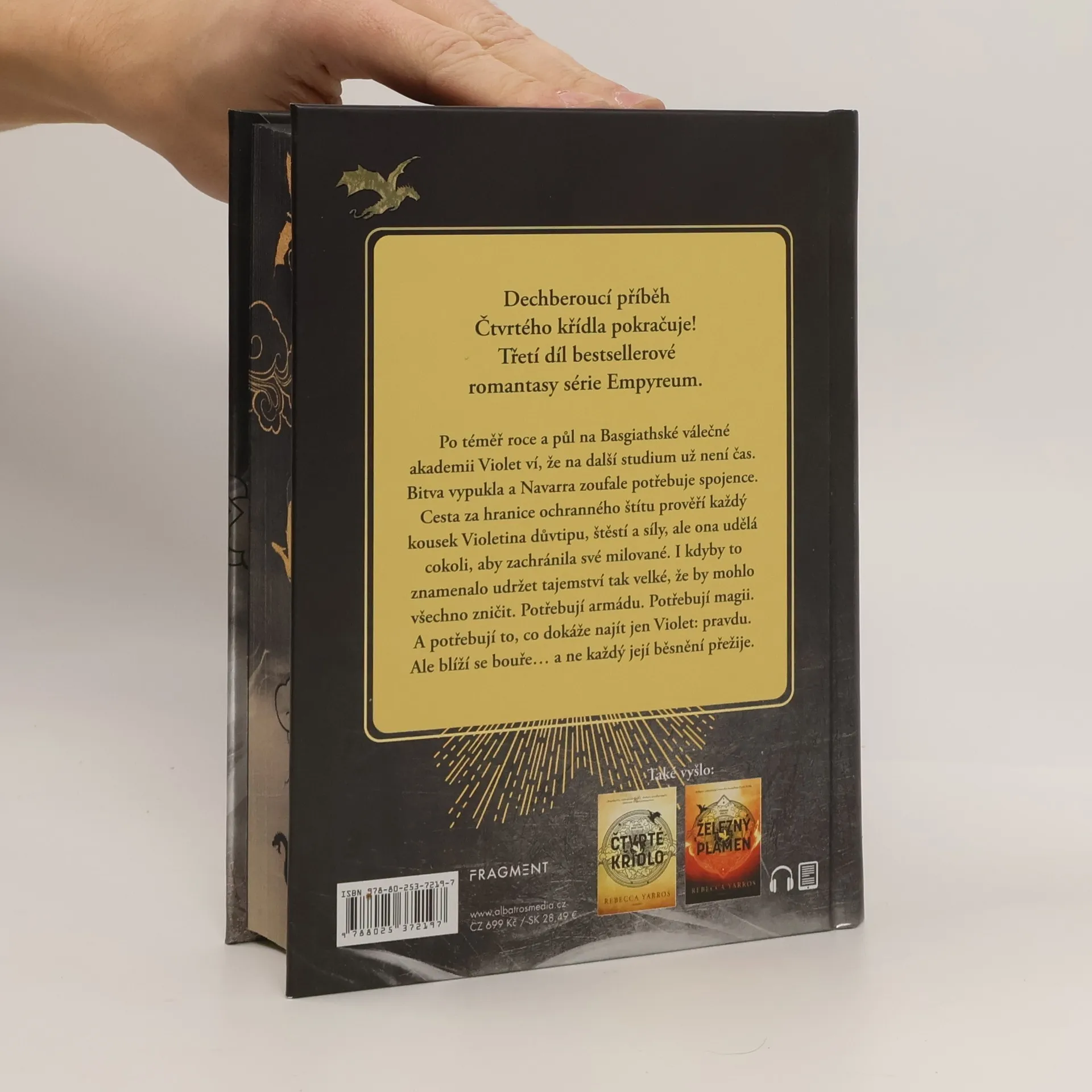 Dechberoucí příběh Čtvrtého křídla pokračuje! Třetí díl bestsellerové romantasy série Empyreum. Po téměř roce a půl na Basgiathské válečné akademii Violet ví, že na další studium už není čas. Bitva vypukla a Navarra zoufale potřebuje spojence. Cesta za hranice ochranného štítu prověří každý kousek Violetina důvtipu, štěstí a síly, ale ona udělá cokoli, aby zachránila své milované. I kdyby to znamenalo udržet tajemství tak velké, že by mohlo všechno zničit. Potřebují armádu. Potřebují magii. A potřebují to, co dokáže najít jen Violet: pravdu. Ale blíží se bouře… a ne každý její běsnění přežije.